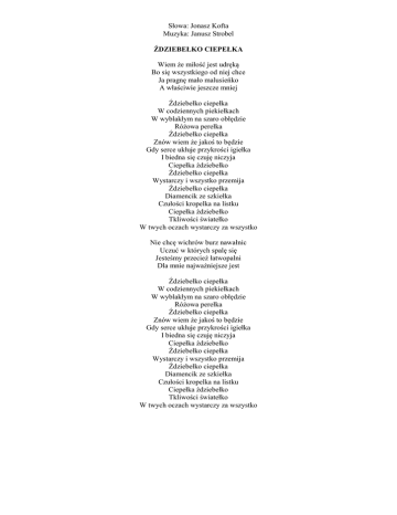 Słowa: Jonasz Kofta Muzyka: Janusz Strobel ŹDZIEBEŁKO CIEPEŁKA Wiem że miłość jest udręką Bo się wszystkiego od niej chce Ja pragnę mało malusieńko A właściwie jeszcze mniej Ździebełko ciepełka W codziennych piekiełkach W wyblakłym na szaro obłędzie Różowa perełka Ździebełko ciepełka Znów wiem że jakoś to będzie Gdy serce ukłuje przykrości igiełka I biedna się czuję niczyja Ciepełka ździebełko Ździebełko ciepełka Wystarczy i wszystko przemija Ździebełko ciepełka Diamencik ze szkiełka Czułości kropelka na listku Ciepełka ździebełko Tkliwości światełko W twych oczach wystarczy za wszystko Nie chcę wichrów burz nawałnic Uczuć w których spalę się Jesteśmy przecież łatwopalni Dla mnie najważniejsze jest Ździebełko ciepełka W codziennych piekiełkach W wyblakłym na szaro obłędzie Różowa perełka Ździebełko ciepełka Znów wiem że jakoś to będzie Gdy serce ukłuje przykrości igiełka I biedna się czuję niczyja Ciepełka ździebełko Ździebełko ciepełka Wystarczy i wszystko przemija Ździebełko ciepełka Diamencik ze szkiełka Czułości kropelka na listku Ciepełka ździebełko Tkliwości światełko W twych oczach wystarczy za wszystko