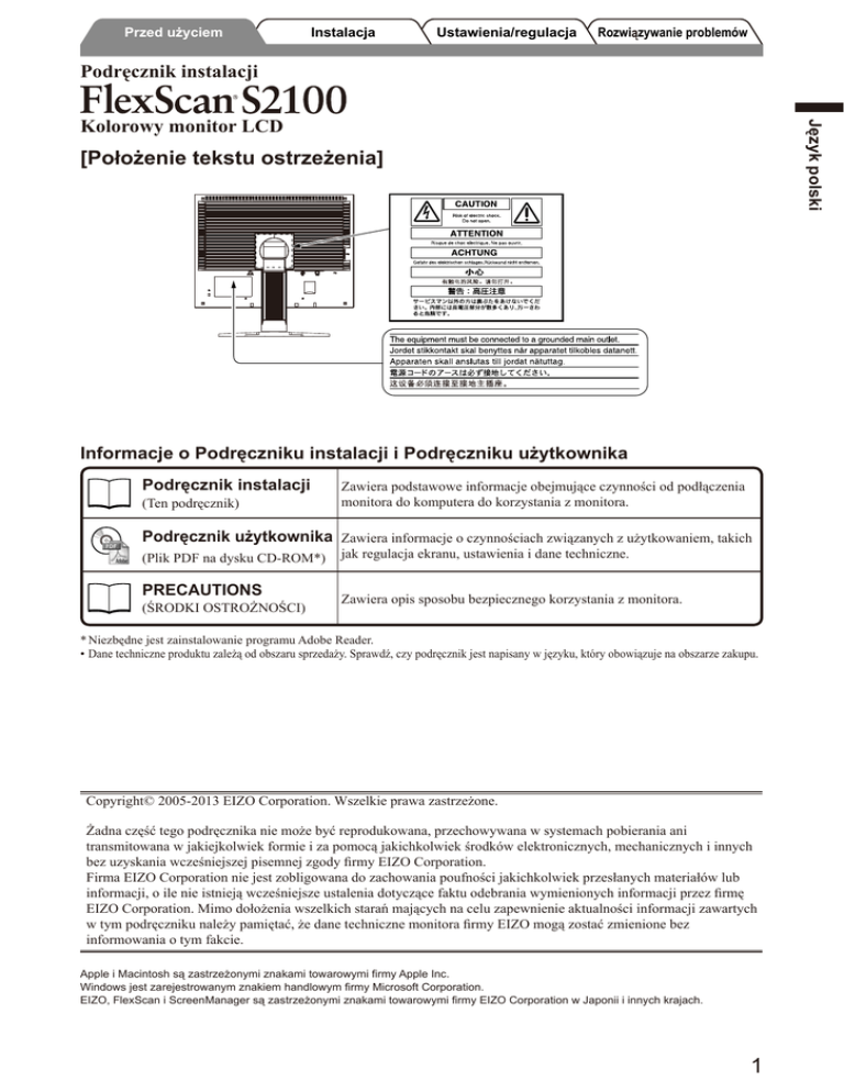 Przed uzyciem Instalacja Ustawienia/regulacja Rozwi zywanie problemów Podręcznik instalacji Język polski Kolorowy monitor LCD [Położenie tekstu ostrzeżenia] Informacje o Podręczniku instalacji i Podręczniku użytkownika Podręcznik instalacji (Ten podręcznik) Zawiera podstawowe informacje obejmujące czynności od podłączenia monitora do komputera do korzystania z monitora. Podręcznik użytkownika Zawiera informacje o czynnościach związanych z użytkowaniem, takich (Plik PDF na dysku CD-ROM*) jak regulacja ekranu, ustawienia i dane techniczne. PRECAUTIONS Zawiera opis sposobu bezpiecznego korzystania z monitora. (ŚRODKI OSTROŻNOŚCI) * Niezbędne jest zainstalowanie programu Adobe Reader. • Dane techniczne produktu zależą od obszaru sprzedaży. Sprawdź, czy podręcznik jest napisany w języku, który obowiązuje na obszarze zakupu. Copyright© 2005-2013 EIZO Corporation. Wszelkie prawa zastrzeżone. Żadna część tego podręcznika nie może być reprodukowana, przechowywana w systemach pobierania ani transmitowana w jakiejkolwiek formie i za pomocą jakichkolwiek środków elektronicznych, mechanicznych i innych bez uzyskania wcześniejszej pisemnej zgody firmy EIZO Corporation. Firma EIZO Corporation nie jest zobligowana do zachowania poufności jakichkolwiek przesłanych materiałów lub informacji, o ile nie istnieją wcześniejsze ustalenia dotyczące faktu odebrania wymienionych informacji przez firmę EIZO Corporation. Mimo dołożenia wszelkich starań mających na celu zapewnienie aktualności informacji zawartych w tym podręczniku należy pamiętać, że dane techniczne monitora firmy EIZO mogą zostać zmienione bez informowania o tym fakcie. Apple i Macintosh są zastrzeżonymi znakami towarowymi firmy Apple Inc. Windows jest zarejestrowanym znakiem handlowym firmy Microsoft Corporation. EIZO, FlexScan i ScreenManager są zastrzeżonymi znakami towarowymi firmy EIZO Corporation w Japonii i innych krajach. 1 Przed uzyciem Instalacja Ustawienia/regulacja Rozwi zywanie problemów SYMBOLE DOTYCZĄCE BEZPIECZEŃSTWA Język polski W tym podręczniku są używane przedstawione poniżej symbole dotyczące bezpieczeństwa. Oznaczają one krytyczne informacje. Należy się z nimi dokładnie zapoznać. OSTRZEŻENIE Niestosowanie się do informacji podanych w OSTRZEŻENIU może spowodować poważne obrażenia i zagrożenie życia. PRZESTROGA Niestosowanie się do informacji podanych w PRZESTRODZE może spowodować obrażenia i/lub uszkodzenie mienia lub produktu. Oznacza działanie zabronione. Oznacza czynność obowiązkową, którą należy wykonać. ŚRODKI OSTROŻNOŚCI OSTRZEŻENIE Jeśli urządzenie zaczyna wydzielać dym, zapach spalenizny lub emitować dziwne dźwięki, należy natychmiast odłączyć zasilanie i skontaktować się z dostawcą. Próba korzystania z niesprawnego urządzenie może spowodować pożar, porażenie prądem elektrycznym lub uszkodzenie urządzenia. Nieduże przedmioty i płyny należy trzymać z daleka od urządzenia. Przypadkowe wpadnięcie małych przedmiotów do wnętrza obudowy przez otwory wentylacyjne lub rozlanie płynu do wnętrza obudowy może spowodować pożar, porażenie prądem elektrycznym lub uszkodzenie urządzenia. Jeśli przedmiot lub płyn wpadnie/rozleje się do wnętrza obudowy, należy natychmiast odłączyć zasilanie urządzenia. Przed ponownym użyciem urządzenie powinno zostać sprawdzone przez wykwalifikowanego pracownika serwisu. Urządzenie musi być podłączone do uziemionego gniazda zasilania. Niezastosowanie się do tego wymagania może spowodować pożar lub porażenie prądem elektrycznym. Należy używać dostarczonego kabla zasilania i standardowego gniazda zasilania w danym kraju. Należy przestrzegać nominalnego napięcia dla kabla zasilania. Niezastosowanie się do tego wymagania może spowodować pożar lub porażenie prądem elektrycznym. „Źródło zasilania: 100-120/200-240 V AC 50/60 Hz” Urządzenie należy ustawić w odpowiednim miejscu. Niezastosowanie się do tego wymagania może spowodować pożar, porażenie prądem elektrycznym lub uszkodzenie urządzenia. • Urządzenie jest przeznaczone do użytku wyłącznie w pomieszczeniach. • Nie należy umieszczać urządzenia w systemach transportowych (np. na statkach, w samolotach, pociągach, samochodach itp.). • Nie należy umieszczać urządzenia w środowisku zakurzonym lub wilgotnym. • Nie należy umieszczać urządzenia w miejscach, w których woda może dosięgnąć ekranu (np. w łazience lub w kuchni). • Nie należy umieszczać urządzenia w miejscach, gdzie na ekran bezpośrednio oddziałuje para. • Nie należy go umieszczać w pobliżu urządzeń wytwarzających ciepło lub nawilżaczy. • Nie należy umieszczać urządzenia w pobliżu źródeł łatwopalnego gazu. Fluorescencyjne lampy podświetlające zawierają rtęć (produkty z podświetlaniem LED nie zawierają rtęci) i należy je utylizować zgodnie z lokalnymi lub kajowymi przepisami. PRZESTROGA Nie wolno zasłaniać otworów wentylacyjnych obudowy. • Nie wolno umieszczać żadnych przedmiotów na otworach wentylacyjnych. • Urządzenia nie wolno instalować w zamkniętym miejscu. • Urządzenia nie należy używać w pozycji leżącej lub do góry nogami. Zablokowanie otworów wentylacyjnych uniemożliwia prawidłowy przepływ powietrza i może spowodować pożar, porażenie prądem elektrycznym lub uszkodzenie urządzenia. 2 Należy używać łatwo dostępnego gniazda zasilania. Zapewni to możliwość szybkiego odłączenia zasilania w przypadku wystąpienia problemu. Przed uzyciem Instalacja Ustawienia/regulacja Rozwi zywanie problemów Zawartość opakowania □ Monitor □ Kabel zasilania □ Kabel sygnału cyfrowego (FD-C39) Język polski Należy sprawdzić, czy w opakowaniu znajdują się wszystkie poniższe elementy. Jeśli brakuje jakichkolwiek elementów lub są one uszkodzone, należy skontaktować się z dostawcą. UWAGA • Opakowan