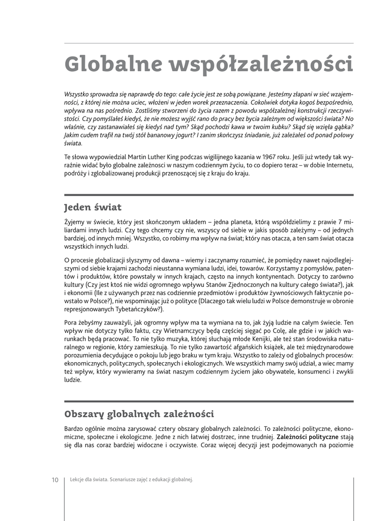 Globalne współzależności Wszystko sprowadza się naprawdę do tego: całe życie jest ze sobą powiązane. Jesteśmy złapani w sieć wzajemności, z której nie można uciec, włożeni w jeden worek przeznaczenia. Cokolwiek dotyka kogoś bezpośrednio, wpływa na nas pośrednio. Zostliśmy stworzeni do życia razem z powodu współzależnej konstrukcji rzeczywistości. Czy pomyślałeś kiedyś, że nie możesz wyjść rano do pracy bez bycia zależnym od większości świata? No właśnie, czy zastanawiałeś się kiedyś nad tym? Skąd pochodzi kawa w twoim kubku? Skąd się wzięła gąbka? Jakim cudem trafił na twój stół bananowy jogurt? I zanim skończysz śniadanie, już zależałeś od ponad połowy świata. Te słowa wypowiedzial Martin Luther King podczas wigilijnego kazania w 1967 roku. Jeśli już wtedy tak wyraźnie widać było globalne zależnosci w naszym codziennym życiu, to co dopiero teraz – w dobie Internetu, podróży i zglobalizowanej produkcji przenoszącej się z kraju do kraju. Jeden świat Żyjemy w świecie, który jest skończonym układem – jedna planeta, którą współdzielimy z prawie 7 miliardami innych ludzi. Czy tego chcemy czy nie, wszyscy od siebie w jakis sposób zależymy – od jednych bardziej, od innych mniej. Wszystko, co robimy ma wpływ na świat; który nas otacza, a ten sam świat otacza wszystkich innych ludzi. O procesie globalizacji słyszymy od dawna – wiemy i zaczynamy rozumieć, że pomiędzy nawet najodleglejszymi od siebie krajami zachodzi nieustanna wymiana ludzi, idei, towarów. Korzystamy z pomysłów, patentów i produktów, które powstały w innych krajach, często na innych kontynentach. Dotyczy to zarówno kultury (Czy jest ktoś nie widzi ogromnego wpływu Stanów Zjednoczonych na kultury całego świata?), jak i ekonomii (Ile z używanych przez nas codziennie przedmiotów i produktów żywnościowych faktycznie powstało w Polsce?), nie wspominając już o polityce (Dlaczego tak wielu ludzi w Polsce demonstruje w obronie represjonowanych Tybetańczyków?). Pora żebyśmy zauważyli, jak ogromny wpływ ma ta wymiana na to, jak żyją ludzie na całym świecie. Ten wpływ nie dotyczy tylko faktu, czy Wietnamczycy będą częściej sięgać po Colę, ale gdzie i w jakich warunkach będą pracować. To nie tylko muzyka, której słuchają młode Kenijki, ale też stan środowiska naturalnego w regionie, który zamieszkują. To nie tylko zawartość afgańskich książek, ale też międzynarodowe porozumienia decydujące o pokoju lub jego braku w tym kraju. Wszystko to zależy od globalnych procesów: ekonomicznych, politycznych, społecznych i ekologicznych. We wszystkich mamy swój udział, a wiec mamy też wpływ, który wywieramy na świat naszym codziennym życiem jako obywatele, konsumenci i zwykli ludzie. Obszary globalnych zależności Bardzo ogólnie można zarysować cztery obszary globalnych zależności. To zależności polityczne, ekonomiczne, społeczne i ekologiczne. Jedne z nich łatwiej dostrzec, inne trudniej. Zależności polityczne stają się dla nas coraz bardziej widoczne i oczywiste. Coraz więcej decyzji jest podejmowanych na poziomie 10 Lekcje dla świata. Scenariusze zajęć z edukacji globalnej. ponadnarodowym. Unia Europejska i organizacje międzynarodowe takie jak ONZ czy Bank Światowy mają coraz więcej do powiedzenia. Krajom jest coraz trudniej izolować się od reszty świata. Zimbabwe, od lat rządzone przez dyktatora i ignorujące naciski opinii światowej, teraz stara się przynajmniej stwarzać pozory demokracji. Nawet potężne Chiny coraz dotkliwiej odczuwają krytykę płynącą od liderów państw i zwykłych ludzi z całego świata. Jako obywatele Polski, która wchodzi w skład wielu międzynarodowych organizacji, również mamy wpływ na kształt światowej polityki. Czy zdarzyło Ci się oglądać metki na twoich ubraniach? Skąd one pochodzą? Najczęściej znajdziesz pewnie napisy „Made in China”, “Made in Thailand” etc. Podobnie będzie, jeśli śledzić będziesz pochodzenie twojego komputera czy zabawek twoich dzieci. Coraz więcej używanych przez nas produktów pochodzi spoza Polski. Produkcja została prawie całkiem zglobalizowana i często przenosi się ją z miejsca na miejsce. Również w handlu powoli znikają bariery. Możemy znaleźć na naszych stołach produkty z całego świata. Kupując te czy inne produkty decydujemy, gdzie trafią nasze pieniądze. Możemy wykorzystać zależności ekonomiczne tak, żeby wspierać firmy i producentów, którzy stwarzają ludziom dobre warunki pracy i możliwość zrównoważonego rozwoju społeczności. Zależności ekologiczne przestały nas już dziwić. Coraz więcej słyszymy o zmianach klimatycznych czy potrzebie oszczędzania wody przez każdego z nas. Zaczynamy też zauważać, jak ogromny wpływ na jakość życia ludzi ma stan środowiska naturalnego, za który jesteśmy odpowiedzialni wszyscy. Wzajemne zależności Oczywiście, wymienione obszary współzależności są bardzo ogólne. Wszystko jest ze sobą wewnętrznie powiązane. W tak współzależnym świecie potrzebne są globalne rozwiązania. Nie możemy podchodzić do żadnego problemu tylko z jednej strony, bo możemy wyrządzić więcej szkody niż dobrego. Dobrym przykładem są biopaliwa. Z punktu widzenia ochrony środowiska są świetnym rozwiązaniem, bo ograniczają produkcję spalin. Politycznie też są wygodne, bo zmniejszają zapotrzebowanie krajów wysoko rozwiniętych na ropę, a tym samym zmniejszają ich zależność od krajów, będących w jej posiadaniu. Ale z punktu widzenia lokalnych społeczności są katastrofą – sprawiają, że bardziej opłaca się produkować rośliny używane do produkcji biopaliw. Winduje to gwałtownie w górę ceny żywności i sprawia, że niektórych ludzi nie stać już nawet na podstawowy posiłek. Nie możemy urzeczywistniać przyjętych rozwiązań bez rozważenia ich potencjalnych,