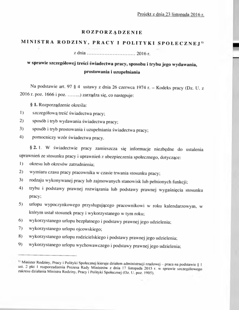 Projekt z dnia 23 listopada 2016 r. ROZPORZĄDZENIE MINISTRA RODZINY, PRACY I POLITYKI SPOŁECZNEJ" z d n ia ...........................................2016r. w spraw ie szczegółow ej treści św iadectw a pracy, sposobu i trybu jeg o w ydaw ania, prostowania i uzupełniania Na podstawie art. 97 § 4 ustawy z dnia 26 czerwca 1974 r. - Kodeks pracy (Dz. U. z 2016 r. poz. 1666 i poz............ ) zarządza się, co następuje: § 1. Rozporządzenie określa: 1) szczegółową treść świadectwa pracy; 2) sposób i tryb wydawania świadectwa pracy; 3) sposób i tryb prostowania i uzupełniania świadectwa pracy; 4) pomocniczy wzór świadectwa pracy. § 2. 1. W świadectwie pracy zamieszcza się informacje niezbędne do ustalenia uprawnień ze stosunku pracy i uprawnień z ubezpieczenia społecznego, dotyczące: 1) okresu lub okresów zatrudnienia; 2) wymiaru czasu pracy pracownika w czasie trwania stosunku pracy; 3') rodzaju wykonywanej pracy lub zajmowanych stanowisk lub pełnionych funkcji; 4) trybu i podstawy prawnej rozwiązania lub podstawy prawnej wygaśnięcia stosunku pracy; 5) urlopu wypoczynkowego przysługującego pracownikowi w roku kalendarzowym, w którym ustał stosunek pracy i wykorzystanego w tym roku; 6) wykorzystanego urlopu bezpłatnego i podstawy prawnej jego udzielenia; 7) wykorzystanego urlopu ojcowskiego; 8) wykorzystanego urlopu rodzicielskiego i podstawy prawnej jego udzielenia; 9) wykorzystanego urlopu wychowawczego i podstawy prawnej jego udzielenia; M inister R odziny, Pracy i Polityki Społecznej kieruje działem adm inistracji rządow ej - praca na podstaw ie § 1 ust. _ pkt I rozporządzenia Prezesa Rady M inistrów z dnia 17 listopada 2015 r. w spraw ie szczegółow ego zakresu działania M inistra Rodziny, Pracy i Polityki Społecznej (Dz. U. poz. 1905). 10) zwolnienia od pracy przewidzianego w art. 188 ustawy z dnia 26 czerwca 1974 r. Kodeks pracy, zwanej dalej „Kodeksem pracy”, wykorzystanego w roku kalendarzowym, w którym ustał stosunek pracy; 11) liczby dni, za które pracownik otrzymał wynagrodzenie, zgodnie z art. 92 Kodeksu pracy, w roku kalendarzowym, w którym ustał stosunek pracy; . 12) okresu, za który pracownikowi przysługuje odszkodowanie w związku ze skróceniem okresu wypowiedzenia umowy o pracę na podstawie art. 36' § 1 Kodeksu pracy; 13) okresu odbytej czynnej służby wojskowej lub jej form zastępczych; 14) okresu wykonywania pracy w szczególnych warunkach lub w szczególnym charakterze; 15) wykorzystanego dodatkowego urlopu albo innego uprawnienia lub świadczenia, przewidzianego przepisami prawa pracy; 16) okresów nieskładkowych, przypadających w okresie zatrudnienia, którego dotyczy świadectwo pracy, uwzględnianych przy ustalaniu prawa do emerytury lub renty; 17) zajęcia wynagrodzenia za pracę w myśl przepisów o postępowaniu egzekucyjnym; 18) należności ze stosunku pracy uznanych i nie zaspokojonych przez pracodawcę do dnia ustania tego stosunku, z powodu braku środków finansowych; 19) danych, które są zamieszczane na żądanie pracownika - informacji o wysokości i składnikach wynagrodzenia oraz o uzyskanych kwalifikacjach. 2. Informacje, o których mowa w ust. 1 pkt 19, zamieszcza się w świadectwie pracy na żądanie pracownika zgłoszone pracodawcy w terminie nie krótszym niż 3 dni przed terminem wydania świadectwa pracy. 3. W świadectwie pracy zamieszcza się pouczenie o prawie pracownika wystąpienia z wnioskiem do pracodawcy o sprostowanie świadectwa pracy w ciągu 7 dni od otrzymania świadectwa pracy, a w razie nieuwzględnienia tego wniosku przez pracodawcę - o prawie do wystąpienia z żądaniem sprostowania świadectwa pracy do sądu pracy, w ciągu 7 dni od zawiadomienia o odmowie sprostowania świadectwa przez pracodawcę. 4. Pomocniczy wzór świadectwa pracy zawiera załącznik do rozporządzenia. § 3. Pracodawca wydaje świadectwo pracy bezpośrednio pracownikowi albo osobie upoważnionej przez pracownika w formie pisemnej. § 4 . W przypadku określonym w art. 97 § 1 Kodeksu pracy pracodawca wydaje świadectwo pracy w dniu, w którym następuje rozwiązanie lub wygaśnięcie stosunku pracy. Jeżeli z przyczyn obiektywnych wydanie świadectwa pracy pracownikowi albo osobie przez niego upoważnionej w tym terminie nie jest możliwe, pracodawca w ciągu 7 dni od dnia upływu tego terminu, przesyła świadectwo pracy pracownikowi lub tej osobie za pośrednictwem poczty albo doręcza je w inny sposób. § 5. W razie wygaśnięcia stosunku pracy z powodu śmierci pracownika, pracodawca sporządzar świadectwo pracy i włącza je do akt osobowych zmarłego pracownika. Na wniosek małżonka lub innej osoby uprawnionej do ubiegania się o rentę rodzinną w myśl przepisów o emeryturach i rentach z Funduszu Ubezpieczeń Społecznych, a w razie braku takich osób innej osoby będącej spadkobiercą tego pracownika, złożony w postaci papierowej lub elektronicznej, pracodawca wydaje świadectwo pracy w ciągu 7 dni od dnia złożenia wniosku. § 6 . Kopię świadectwa pracy przechowuje się w aktach osobowych pracownika; w uzasadnionych przypadkach pracodawca wydaje odpis tego świadectwa pracy pracownikowi albo osobie, o której mowa w § 3 i § 5. § 7. 1. Pracodawca zawiadamia pracownika na piśmie o negatywnym wyniku rozpatrzenia wniosku o sprostowanie świadectwa pracy w ciągu 7 dni od dnia otrzymania tego wniosku. W razie uwzględnienia wniosku, pracodawca wydaje pracownikowi w tym terminie nowe świadectwo pracy. 2. W razie uwzględnienia przez sąd pracy powództwa pracownika o sprostowanie świadectwa pracy, pracodawca wydaje pracownikowi niezwłocznie nowe świadectwo pracy, w ciągu 3 dni od dnia uprawomocnienia się orzeczenia sądu w tej sprawie. 3. W razie prawomocnego orzeczenia sądu pracy o przywróceniu pracownika do pracy lub przyznaniu mu odszkodowania z tytułu niezgodnego z przepisami prawa wypowiedzenia umowy o pracę lub jej rozwiązania bez wypowiedzenia, 