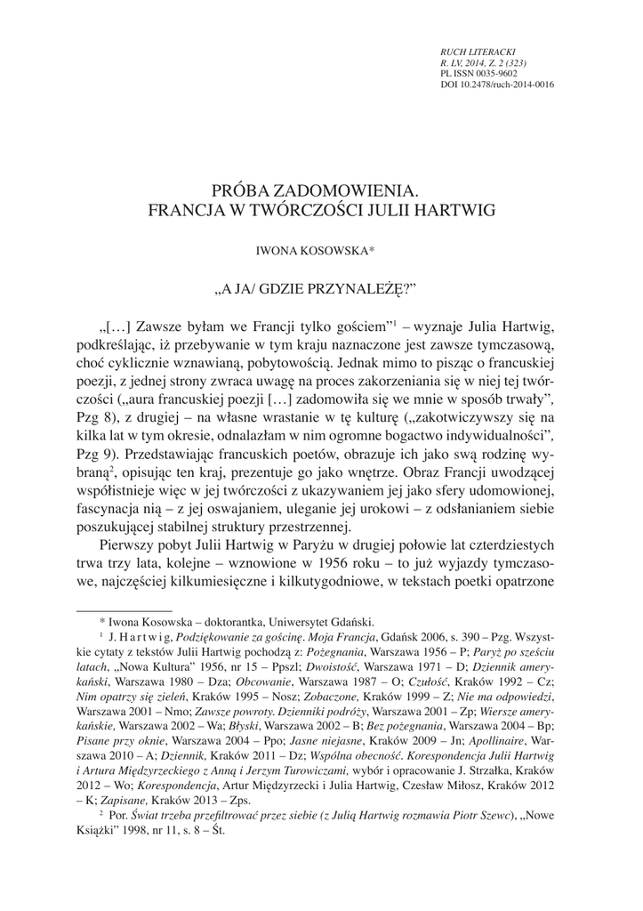 RUCH LITERACKI R. LV, 2014, Z. 2 (323) PL ISSN 0035-9602 DOI 10.2478/ruch-2014-0016 PRÓBA ZADOMOWIENIA. FRANCJA W TWÓRCZOŚCI JULII HARTWIG Iwona Kosowska* „A ja/ gdzie przynależę?” „[…] Zawsze byłam we Francji tylko gościem” – wyznaje Julia Hartwig, podkreślając, iż przebywanie w tym kraju naznaczone jest zawsze tymczasową, choć cyklicznie wznawianą, pobytowością. Jednak mimo to pisząc o francuskiej poezji, z jednej strony zwraca uwagę na proces zakorzeniania się w niej tej twórczości („aura francuskiej poezji […] zadomowiła się we mnie w sposób trwały”, Pzg 8), z drugiej – na własne wrastanie w tę kulturę („zakotwiczywszy się na kilka lat w tym okresie, odnalazłam w nim ogromne bogactwo indywidualności”, Pzg 9). Przedstawiając francuskich poetów, obrazuje ich jako swą rodzinę wybraną, opisując ten kraj, prezentuje go jako wnętrze. Obraz Francji uwodzącej współistnieje więc w jej twórczości z ukazywaniem jej jako sfery udomowionej, fascynacja nią – z jej oswajaniem, uleganie jej urokowi – z odsłanianiem siebie poszukującej stabilnej struktury przestrzennej. Pierwszy pobyt Julii Hartwig w Paryżu w drugiej połowie lat czterdziestych trwa trzy lata, kolejne – wznowione w 1956 roku – to już wyjazdy tymczasowe, najczęściej kilkumiesięczne i kilkutygodniowe, w tekstach poetki opatrzone * Iwona Kosowska – doktorantka, Uniwersytet Gdański. J. H a r t w i g, Podziękowanie za gościnę. Moja Francja, Gdańsk 2006, s. 390 – Pzg. Wszystkie cytaty z tekstów Julii Hartwig pochodzą z: Pożegnania, Warszawa 1956 – P; Paryż po sześciu latach, „Nowa Kultura” 1956, nr 15 – Ppszl; Dwoistość, Warszawa 1971 – D; Dziennik amerykański, Warszawa 1980 – Dza; Obcowanie, Warszawa 1987 – O; Czułość, Kraków 1992 – Cz; Nim opatrzy się zieleń, Kraków 1995 – Nosz; Zobaczone, Kraków 1999 – Z; Nie ma odpowiedzi, Warszawa 2001 – Nmo; Zawsze powroty. Dzienniki podróży, Warszawa 2001 – Zp; Wiersze amerykańskie, Warszawa 2002 – Wa; Błyski, Warszawa 2002 – B; Bez pożegnania, Warszawa 2004 – Bp; Pisane przy oknie, Warszawa 2004 – Ppo; Jasne niejasne, Kraków 2009 – Jn; Apollinaire, Warszawa 2010 – A; Dziennik, Kraków 2011 – Dz; Wspólna obecność. Korespondencja Julii Hartwig i Artura Międzyrzeckiego z Anną i Jerzym Turowiczami, wybór i opracowanie J. Strzałka, Kraków 2012 – Wo; Korespondencja, Artur Międzyrzecki i Julia Hartwig, Czesław Miłosz, Kraków 2012 – K; Zapisane, Kraków 2013 – Zps. Por. Świat trzeba przefiltrować przez siebie (z Julią Hartwig rozmawia Piotr Szewc), „Nowe Książki” 1998, nr 11, s. 8 – Śt. 218 Iwona Kosowska znakiem „czasowej zmiany miejsca” (Zp 7), poczuciem uczestnictwa w „tylko chwilowym widowisku” (Zp 170). Początkowe zamieszkiwanie w stolicy Francji znajduje swoją kontynuację w, podkreślającej punktualny charakter bycia w tej przestrzeni, „przygodzie podróżowania” (Zp 8). Jednak mimo deklaratywnych wypowiedzi o krótkotrwałości francuskiej „gościny”, w twórczości autorki Obcowania wyłania się obraz bezpiecznego azylu, Francji-domu. Płaszczyznę metodologiczną, która pozwoli uwypuklić obraz Francji jako strefy chroniącej, stanowi prezentowana przez fenomenologa Gastona Bachelarda w La poétique de l’espace kategoria „wnętrza”, skupiająca się m.in. w figurze kąta, domu-kołyski, domu-łona, muszli, gniazda oraz pojęcie „miejsca” przedstawione w Przestrzeni i miejscu geografa humanistycznego Yi-Fu Tuana. Mimo różnic dzielących pojmowanie przestrzeni przez fenomenologię francuskiego filozofa, odwołującą się do koncepcji C. G. Junga, jak i geografię humanistyczną, wyrosłą z badań Szkoły Berkeley założonej przez Carla O. Sauera, dostrzec można pewne cechy wspólne tych dwóch matryc badawczych zakorzenionych w tradycji binarnych ujęć przestrzennych. Zarówno „wnętrze”, pozostające w dialektycznej relacji z „zewnętrzem”, jak i „miejsce” również łączące się z tym, co poza nim – otwartą, wolną „przestrzenią”, odsłania fragment udomowionego, chroniącego świata. „Miejsce to bezpieczeństwo” – zauważa Yi-Fu Tuan. Bachelard obrazy „wnętrza” przedstawia jako azyle, w których można „przycupnąć” (jak tłumaczy czasownik se blottir Wanda Błońska). Kategorie te uwypuklają proces zatrzymania, stan bezruchu, jakim poddane jest istnienie i sama oswojona przestrzeń. Stabilny „kąt” unieruchamia, „miejsce”, zgodnie z koncepcją Yi-Fu Tuana, stanowi „pauzę w czasowym strumieniu” (Pim 224). Poczucie ochrony podmiotu, jego „skupienia w sobie” umożliwia, podkreślane, szczególnie przez autora Płomienia świecy, zamknięcie – kondensacja istnienia „wewnątrz opiekuńczych granic” (WdPp 386). Próby poszukiwania oswojonych przestrzeni w twórczości Julii Hartwig poprzedza jednak ich utrata. Bohaterki jej tekstów, nietutejsze, bezdomne, nieprzynależne, określając swoją kondycję, konstruują ją w poczuciu braku. Choć poetka wspomina, iż „miejsce, w którym się rodzimy, jest miejscem jakby naturalnie nam przypisanym” (Śt 6), w motcie do Elegii lubelskiej ujawnione zostaje wrażenie wykorzenienia z rodzinnego miasta („Więc urodziłam się na tym skrawku ziemi. Co mam zrobić, żeby poczuć się tutejszą?”, Nmo 22). Na stan nieprzynależności przestrzennej wydaje się wpływać historia rodziny autorki Czułości. Lublin miał stanowić jedynie tymczasowe miejsce pobytu jej – uciekających przed rewolu Yi-Fu T u a n, Przestrzeń i miejsce, przeł. A. Morawińska, wstępem opatrzył K. Wojciechowski, Warszawa 1987, s. 13 – Pim. G. B a c h e l a r d, Wstęp do „Poetyki przestrzeni” przeł. W. Błońska [w:] Współczesna teoria badań literackich za granicą, pod red. H. Markiewicza, t. II: Strukturalno-semiotyczne badania literackie. Literaturoznawstwo porównawcze. W kręgu psych