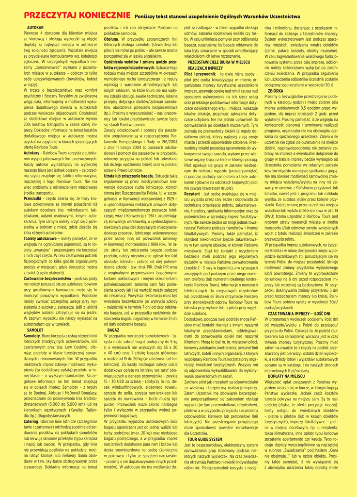 PRZECZYTAJ KONIECZNIE AUTOKAR Pierwsze 4 dostępne dla klientów miejsca za kierowcą i obsługą wycieczki są objęte dopłatą za najlepsze miejsca w autokarze (wg kolejności zgłoszeń). Pozostałe miejsca są przydzielane komputerowo wg. kolejności zgłoszeń.. W szczególnych wypadkach możemy „zarezerwować” wybrane z pozostałych miejsce w autokarze – dotyczy to tylko osób uprzywilejowanych (inwalidów, kobiet w ciąży). W trosce o bezpieczeństwo oraz komfort psychiczny i fizyczny Turystów ze zwiększoną wagą ciała, informujemy o możliwości wykupienia dodatkowego miejsca w autokarach podczas wycieczek objazdowych. Odpłatność za dodatkowe miejsce w autokarze wynosi 70% kosztów transportu w czasie danej imprezy. Dokładne informacje na temat kosztów dodatkowego miejsca w autokarze można uzyskać na zapytanie w biurach sprzedających ofertę Rainbow Tours. Autokary – Rainbow Tours korzysta z autokarów wyspecjalizowanych firm przewozowych. Każdy autokar wyjeżdżający na wycieczkę naszego biura jest jednak opisany – za przednią szybą znajduje się tablica informacyjna, najczęściej z logo Rainbow Tours. Nie ma więc problemu z odnalezieniem właściwego środka transportu. Przesiadki – często zdarza się, że trasy krajowe pokonywane są innymi pojazdami niż autokary docelowe (np. mikrobusami, taksówkami, autami osobowymi, innymi autokarami). Tym samym należy liczyć się z przesiadką w jednym z miast, gdzie zjeżdża się kilka różnych autokarów. Toalety autokarowe – należy pamiętać, że ze względu na ograniczoną pojemność, są to toalety „awaryjne” i proponujemy nie korzystać z nich zbyt często. W celu załatwienia potrzeb fizjologicznych co kilka godzin organizujemy postoje w miejscach, gdzie skorzystać można z toalet (często płatnych). Zachowanie bezpieczeństwa - podczas jazdy nie należy poruszać się po autokarze, bowiem przy gwałtownym hamowaniu może się to skończyć poważnym wypadkiem. Podobnie należy zwracać szczególną uwagę przy wysiadaniu z autokaru, zwłaszcza, jeśli z jakichś względów autokar zatrzymuje się na jezdni. W żadnym wypadku nie należy wysiadać na autostradach czy w tunelach. SAMOLOT Samoloty. Biuro korzysta z usług różnych linii lotniczych (tradycyjnych przewoźników, linii czarterowych oraz tzw. Low Costów), oferując przeloty w klasie turystycznej sprawdzonych i renomowanych firm. W przypadku niektórych imprez istnieje możliwość wykupienia (za dodatkową opłatą) przelotu w innej klasie – o wyższym standardzie. Szczegółowe informacje na ten temat znajdują się w opisach imprez. Samoloty – z reguły są to Boeingi, Airbusy i McDonell Douglasy, przeznaczone do pokonywania tras średniodystansowych (3.000 do 5.000 km) lub na kierunkach egzotycznych (Karaiby, Tajlandia itp.) długodystansowych. Catering. Obecnie linie lotnicze (szczególnie tanie i czarterowe) odchodzą zupełnie od podawania posiłków na pokładach samolotów lub serwują skromne przekąski (typu kanapka i napój lub owoce). W przypadku, gdy linie nie przewidują posiłków na pokładzie, można nabyć kanapki lub niekiedy dania obiadowe w tzw. sky-barze obsługiwanym przez stewardesy. Dokładne informacje na temat Poniższy tekst stanowi uzupełnienie Ogólnych Warunków Uczestnictwa posiłków i ich cen otrzymacie Państwo na pokładzie samolotu. Obsługa. W przypadku zagranicznych linii lotniczych obsługa samolotu (stewardesy lub piloci) nie mówi po polsku – ale zawsze można porozumieć się w języku angielskim. Opóźnienia wylotów i zmiany godzin przelotów rejsowych/czarterowych. Sytuacje tego rodzaju mają miejsce szczególnie w okresach wzmożonego ruchu turystycznego i z reguły wynikają z warunków atmosferycznych lub innych zakłóceń, na które Biuro nie ma wpływu (strajki obsługi, awarie techniczne, lokalne przepisy dotyczące startów/lądowań samolotów, obostrzenia przepisów bezpieczeństwa itp.). Prosimy o wyrozumiałość – nasi pracownicy lub lokalni przedstawiciele zawsze będą się starali Państwu pomóc. Zasady odszkodowań i pomocy dla pasażerów uregulowane są w rozporządzeniu Parlamentu Europejskiego i Rady nr 261/2004 z dnia 11 lutego 2004 (o zasadach odszkodowań i pomocy dla pasażerów w przypadku odmowy przyjęcia na pokład lub odwołania lub dużego opóźnienia lotów) oraz w polskiej ustawie Prawo Lotnicze. Utrata lub zniszczenie bagażu. Sytuacje takie regulowane są przez międzynarodowe konwencje dotyczące ruchu lotniczego, których stroną jest Rzeczpospolita Polska, tj. w szczególności w Konwencji warszawskiej z 1929 r. o ujednostajnieniu niektórych prawideł dotyczących międzynarodowego przewozu lotniczego, wraz z Konwencją z 1961 r. uzupełniającą konwencję warszawską, o ujednostajnieniu niektórych prawideł dotyczących międzynarodowego przewozu lotniczego wykonywanego przez osobę inną niż przewoźnik umowny, w Konwencji montrealskiej z 1999 roku. W razie utraty lub zniszczenia bagażu podczas przelotu, należy niezwłocznie zgłosić ten fakt obsłudze lotniska i pobrać od niej potwierdzenie szkody - tzw. druk PIR. Druk PIR wraz z oryginalnymi przywieszkami bagażowymi, kartami pokładowymi i innymi dokumentami potwierdzającymi zarówno sam fakt poniesienia szkody jak i jej wartość należy załączyć do reklamacji. Powyższa reklamacja musi być wniesiona bezzwłocznie po wykryciu szkody – najpóźniej w terminie 7 dni od daty odebrania bagażu, zaś w przypadku opóźnienia dostarczenia bagażu najpóźniej w terminie 21 dni od daty odebrania bagażu. BAGAŻ W przypadku wycieczek samolotowych - turysta może zabrać bagaż podręczny do 5 kg (i o wymiarach nie większych niż 55 x 20 x 40 cm) oraz 1 sztukę bagażu głównego o wadze od 15 do 20 kg (w zależności od linii lotniczej). Za każdy nadbagaż należy uiścić dodatkową opłatę na lotnisku wg taryf obowiązujących u danego przewoźnika - zwykle 