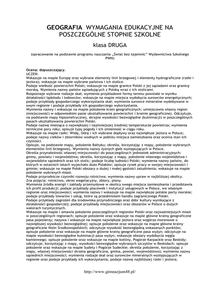 GEOGRAFIA WYMAGANIA EDUKACYJNE NA POSZCZEGÓLNE STOPNIE SZKOLNE klasa DRUGA (opracowanie na podstawie programu nauczania „Świat bez tajemnic” Wydawnictwa Szkolnego PWN) Ocena: dopuszczający. UCZEŃ: Wskazuje na mapie Europę oraz wybrane elementy linii brzegowej i elementy hydrograficzne (rzeki i jeziora); wskazuje na mapie wybrane państwa i ich stolice. Podaje wielkość powierzchni Polski; wskazuje na mapie granice Polski z jej sąsiadami oraz granicę morską. Wymienia nazwy państw sąsiadujących z Polską wraz z ich stolicami. Rozpoznaje wybrane rodzaje skał; wymienia przykładowe formy terenu powstałe w wyniku działalności lądolodu i lodowców; wskazuje na mapie miejsca wydobycia surowców energetycznych; podaje przykłady gospodarczego wykorzystania skał; wymienia surowce mineralne wydobywane w swym regionie i podaje przykłady ich gospodarczego wykorzystania. Wymienia nazwy i wskazuje na mapie położenie krain geograficznych; umiejscawia własny region (miejscowość) w odpowiednim pasie ukształtowania powierzchni i krainie geograficznej. Odczytuje, na podstawie mapy hipsometrycznej, skrajne wysokości bezwzględne (kulminacji) w poszczególnych pasach ukształtowania powierzchni Polski. Podaje nazwę miesiąca o największej i najmniejszej średniej temperaturze powietrza; wymienia termiczne pory roku; opisuje typy pogody i ich zmienność w ciągu roku. Wskazuje na mapie rzeki: Wisłę, Odrę i ich wybrane dopływy oraz największe jeziora w Polsce; podaje nazwy cieków i zbiorników wodnych w pobliżu miejsca zamieszkania oraz ocenia stan ich czystości. Opisuje, na podstawie mapy, położenie Bałtyku; określa, korzystając z mapy, położenie wybranych elementów linii brzegowej. Wymienia nazwy żyznych gleb występujących w Polsce. Określa przynależność własnej miejscowości do poszczególnych jednostek administracyjnych: gminy, powiatu i województwa; określa, korzystając z mapy, położenie własnego województwa i województw sąsiednich oraz ich stolic; podaje liczbę ludności Polski; wymienia nazwy państw, do których w ostatnich latach wyjechało dużo Polaków; opisuje rynek pracy w swojej miejscowości i gminie; wskazuje na mapie Polski obszary o dużej i małej gęstości zaludnienia; wskazuje na mapie położenie wybranych miast. Podaje przyrodnicze czynniki rozwoju rolnictwa; wymienia nazwy upraw w najbliższej okolicy. Zna pojęcia: rolnictwo, okres wegetacyjny, zbiory, plony. Wymienia źródła energii i zakłady przemysłowe w okolicy swego miejsca zamieszkania i przedstawia ich profil produkcji; podaje przykłady placówek i instytucji usługowych w Polsce, we własnym regionie oraz miejscowości; wymienia nazwy i wskazuje na mapie największe polskie porty morskie; podaje przykłady towarów i usług, które są przedmiotem handlu zagranicznego Polski. Podaje przykłady zagrożeń dla środowiska przyrodniczego oraz dóbr kultury wynikające z działalności gospodarczej; podaje przykłady miejscowości oraz obszarów w Polsce o dużych walorach turystycznych. Wskazuje na mapie i omawia położenie poszczególnych regionów Polski oraz najważniejszych miast w poszczególnych regionach; opisuje położenie oraz wskazuje na mapie główne krainy geograficzne pasa pojezierzy; nazywa i wskazuje na mapie największe jeziora oraz wzgórza morenowe o największej wysokości bezwzględnej; opisuje położenie oraz wskazuje na mapie główne krainy geograficzne Nizin Środkowopolskich; odczytuje wysokość bezwzględną wskazanych punktów; opisuje położenie oraz wskazuje na mapie główne krainy geograficzne pasa wyżyn; odczytuje na mapie wysokości bezwzględne kulminacji pasa wyżyn; wskazuje obszary wydobycia węgla kamiennego; opisuje położenie oraz wskazuje na mapie kotliny, Pogórze Karpackie oraz Beskidy; odczytuje, korzystając z mapy, wysokości bezwzględne wybranych szczytów w Beskidach; opisuje położenie oraz wskazuje na mapie Sudety i Pogórze Sudeckie; określa położenie, korzystając z mapy, własnej miejscowości (kraina geograficzna, gmina, powiat, województwo); wymienia nazwy sąsiednich miejscowości; wymienia rodzaje skał oraz surowców mineralnych występujących w regionie oraz podaje przykłady ich wykorzystania; podaje nazwę najbliższej rzeki i jeziora; http://www.gimnazjum48.pl/ przedstawia występowanie lasów w swym regionie; opisuje inne, poza lasami, naturalne formacje roślinne regionu; wymienia główne uprawy i kierunki hodowli; nazywa i wskazuje na mapie najważniejsze miasta regionu; wymienia i opisuje walory środowiska przyrodniczego najbliższej okolicy i regionu; planuje wycieczkę po własnej miejscowości; podaje przykłady wpływu działalności człowieka na środowisko przyrodnicze (negatywne i pozytywne); wymienia pomniki przyrody występujące w najbliższej okolicy; przedstawia cechy wyróżniające ludność regionu na tle ludności kraju (np. gwara, stroje regionalne, budownictwo, zdobnictwo); przedstawia przykłady zwyczajów regionalnych podtrzymywanych przez własną rodzinę. Zna pojęcia: folklor i skansen. Wykorzystuje podręcznik do geografii jako źródło wiedzy geograficznej; wskazuje na mapie kierunki główne i pośrednie; potrafi odczytać wysokość bezwzględną punktu położonego na opisanej poziomicy. Zna nazwy kontynentów i oceanów oraz umie wskazać i nazwać je na mapie; podaje daty początku astronomicznych pór roku (równonocy i przesileń). Odczytuje na globusie współrzędne geograficzne punktów leżących na przecięciu wykreślonych południków i równoleżników; umie odczytać wartość temperatury powietrza z termometru. Odczytuje dane z diagramów klimatycznych. Zna pojęcia: rzeka główna, dopływ. Prowadzi zeszyt przedmiotowy, wykonuje wskazane przez nauczyciela zadania domowe oraz przynosi na lekcje właściwy podręcznik i atlas oraz potrzebne do pracy przybory. Ocena: dostateczny. UCZEŃ spełnia wymagania edukacyjne na ocenę dopuszcz
