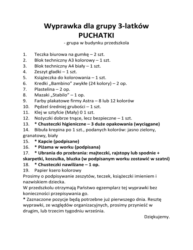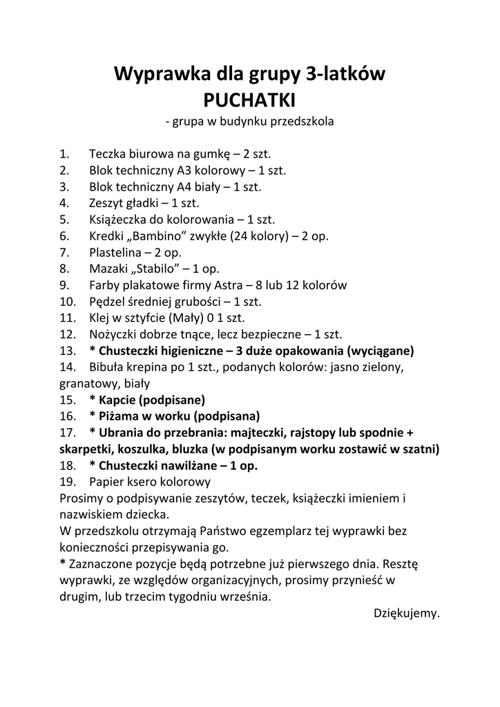 Wyprawka dla grupy 3‐latków PUCHATKI ‐ grupa w budynku przedszkola 1. Teczka biurowa na gumkę – 2 szt. 2. Blok techniczny A3 kolorowy – 1 szt. 3. Blok techniczny A4 biały – 1 szt. 4. Zeszyt gładki – 1 szt. 5. Książeczka do kolorowania – 1 szt. 6. Kredki „Bambino” zwykłe (24 kolory) – 2 op. 7. Plastelina – 2 op. 8. Mazaki „Stabilo” – 1 op. 9. Farby plakatowe firmy Astra – 8 lub 12 kolorów 10. Pędzel średniej grubości – 1 szt. 11. Klej w sztyfcie (Mały) 0 1 szt. 12. Nożyczki dobrze tnące, lecz bezpieczne – 1 szt. 13. * Chusteczki higieniczne – 3 duże opakowania (wyciągane) 14. Bibuła krepina po 1 szt., podanych kolorów: jasno zielony, granatowy, biały 15. * Kapcie (podpisane) 16. * Piżama w worku (podpisana) 17. * Ubrania do przebrania: majteczki, rajstopy lub spodnie + skarpetki, koszulka, bluzka (w podpisanym worku zostawić w szatni) 18. * Chusteczki nawilżane – 1 op. 19. Papier ksero kolorowy Prosimy o podpisywanie zeszytów, teczek, książeczki imieniem i nazwiskiem dziecka. W przedszkolu otrzymają Państwo egzemplarz tej wyprawki bez konieczności przepisywania go. * Zaznaczone pozycje będą potrzebne już pierwszego dnia. Resztę wyprawki, ze względów organizacyjnych, prosimy przynieść w drugim, lub trzecim tygodniu września. Dziękujemy. Wyprawka dla grupy 3 – latków (grupa w budynku szkoły) 1. Teczka biurowa na gumkę – 2 szt. 2. Blok technicznyA4 biały – 1 szt. 3. Blok techniczny A3 biały – 1 szt. 4. Blok rysunkowy A3 biały – 1 szt. 5. Blok rysunkowy A3 kolorowy – 1 szt. 6. Blok techniczny A3 kolorowy – 1 szt. 7. Zeszyt papierów wycinankowych – 2 szt. 8. Zeszyt gładki – 1 szt. 9. Książeczka do kolorowania – 1 szt. 10. Kredki „Bambino” zwykłe (24 kolory) – 2 op. 11. Kredki świecowe (woskowe) – 1 op. 12. Plastelina – 2 op. 13. Mazaki „Stabilo” - 1 op. 14. Farby plakatowe firmy „Astra” - 8 lub 12 kolorów 15. Pędzel średniej grubości – 1 szt. 16. Klej w sztyfcie (mały) – 2 szt. 17. Nożyczki dobrze tnące, lecz bezpieczne – 1 szt. 18. Papier ksero biały 19. Papier ksero kolorowy 20. Bibuła krepina po 1 szt. podanych kolorów: jasno zielony, ciemno zielony, żółty, biały, czerwony, niebieski, granatowy, brązowy 21. Chusteczki higieniczne – 3 duże opakowania (wyciągane) 22. Chusteczki nawilżane – 1 op. 23. Kapcie (podpisane) 24. Piżama w worku (podpisana) 25. Ubrania do przebrania: majteczki, rajstopy lub spodnie, skarpetki, koszulka, bluzka (w podpisanym worku zostawić w szatni) Prosimy o podpisanie teczek, zeszytów, książczek imieniem i nazwiskiem dziecka. W przedszkolu otrzymają państwo egzemplarz tej wyprawki bez konieczności przepisywania go. Zaznaczone pozycje będą potrzebne już pierwszego dnia. Resztę wyprawki, ze względów organizacyjnych, prosimy przynieść w drugim tygodniu września. Dziękujemy. Wyprawka dla grupy 4-latków II JOGUSIE - grupa po Pani Eli Gąsiorowskiej 1. Teczka biurowa na gumkę - 2 szt. (podpisane) 2. Papier ksero (ryza) 3. Blok rysunkowy z białymi kartkami A4 - 1 szt. 4. Blok rysunkowy z kolorowymi kartkami A3 - 1 szt. 5. Blok techniczny z kolorowymi kartkami A3 - 1 szt. 6. Papier kolorowy (wycinanka zwykła) - 1 szt. 7. Zeszyt gładki 60 kartkowy ( podpisany) 8. Kredki "Bambino" - 2 opak. 9. Kredki świecowe (Bic - Kids) - 1 opak. 10. Mazaki "Stabilo" - 1 opak. 11. Plastelina (12 kolorów) - 2 opak. 12. Farby plakatowe (Astra) - 1 opak. 13. Pędzel średniej grubości – 1 szt. 14. Pastele olejne - 1 opak. minimum 12 kolorów 15.Pastele suche 1 opak. 16.Klej magiczny w tubce „Magic” 17.Kolorowa kreda 18. Węgiel rysunkowy 19. Klej w sztyfcie - 2 szt. 20. Książeczka do kolorowania - 1 szt (podpisana) 21. Nożyczki (dobrze tnące, bezpieczne) - podpisane 22. Chusteczki higieniczne (duże opakowania) - 2 pudełka 23. Kubek, szczoteczka do zębów (podpisane) + pasta 24. Kapcie (podpisane) 25. Pidżama (w podpisanym worku) 26. Strój gimnastyczny (koszulka i spodenki) w podpisanym worku Kopię wyprawki otrzymają Państwo w przedszkolu. WYPRAWKA DLA GRUPY DZIECI 4 – LETNICH „MISIA USZATKA” Grupa p. Magdaleny Ratajczyk i Jolanty Gieras 1. Papier ksero – 1 ryza; 2. Wycinanki - 1 szt.(prosimy nie kupować wycinanek samoprzylepnych tylko zwykłe); 3. Klej w sztyfcie – 2 szt. 4. Nożyczki – 1 szt. 5. Pastele olejne – 1 szt. (przynajmniej 12 kolorów) 6. Pędzel średniej grubości; 10.Kredki Bambino – 2 szt. 11.Kredki ołówkowe, grube Bambino – 1szt. 12.Mazaki Stabilo (10-12 kolorów) – 1szt. 13.Teczka biurowa na gumkę - 2 szt. (podpisane) 14.Zeszyt gładki, gruby – 1szt. 15.Książeczka do kolorowania (podpisana); 16.Chusteczki higieniczne (duża paczka) – 3 szt. 17.Kubek, szczotka, pasta do zębów – podpisane; 18.Pidżama ( w podpisanym worku); Dzieci będą korzystały z materiałów papierniczych i plastycznych, które pozostały z ubiegłego roku, dlatego nie zostały wymienione w w/w wyprawce. Wyprawka dla dzieci z grupy 5-6 latków „GUMISIE” NAUCZYCIEL: MARIA KOŁODZIEŻNA Teczka na gumkę (podpisana) – 3 sztuki Blok z kolorowymi kartkami techniczny A3 – 1 sztuka Blok techniczny z kolorowymi kartkami A4 – 1 sztuka Blok rysunkowy z białymi kartkami A4 – 1 sztuka Blok techniczny z białymi kartkami A3 – 1 sztuka Zeszyt papierów kolorowych podpisane (wycinanki „zwykłe”) - 2 sztuki 1 zeszyt gładki 90 kartkowy (podpisany) Kredki bambino – 1 opakowanie (podpisane) Kredki świecowe (cienkie) BIC – KIDS – 1 opakowanie Kredki ołówkowe – 1 opakowanie Temperówka – 1 sztuka Pastele olejne – 1 sztuka (podpisane) minimum 12 kolorów Plastelina – (podpisana) 1 opakowanie po 12 kolorów w tekturowym pudełku Mazaki STABILO – 1 opakowanie (podpisane) minimum 12 kolorów Farby akwarelowe – 1 opakowanie Kleje w sztyfcie duże – 2 sztuki Ołówek – 2 sztuki Nożyczki Gumka do ścierania – 1 sztuka Ryza papieru ksero Książeczka do kolorow