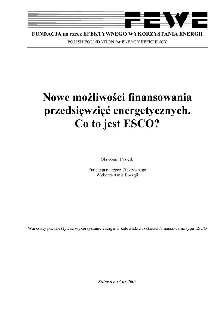 FUNDACJA na rzecz EFEKTYWNEGO WYKORZYSTANIA ENERGII POLISH FOUNDATION for ENERGY EFFICIENCY Nowe możliwości finansowania przedsięwzięć energetycznych. Co to jest ESCO? Sławomir Pasierb Fundacja na rzecz Efektywnego Wykorzystania Energii Warsztaty pt.: Efektywne wykorzystanie energii w katowickich szkołach/finansowanie typu ESCO Katowice 13.03.2003 Nowe możliwości finansowania przedsięwzięć energetycznych. Co to jest ESCO? 1 Co to jest ESCO? 1. Gdzie jest miejsce na usługi firmy ESCO? Zmniejszenie kosztów energii w działalności produkcyjnej i usługowej winno być strategią każdej firmy. Doświadczenia krajowe i zagraniczne wskazują, ze prawie w każdej firmie można zmniejszyć w sposób opłacalny koszty energii od 10-40%. Co to znaczy w sposób opłacalny?, to znaczy, że koszty zaoszczędzenia energii (koszty zmniejszenia zużycia energii) będą niższe od kosztów zakupu energii, którą to dodatkową ilość energii trzeba kupić gdyby się nie zaoszczędziło tej energii. Możliwości zmniejszenia w opłacalny sposób rachunków za energię w gospodarstwach domowych i budynkach publicznych są nawet większe, mogą sięgać do 50%. Powodów na występowanie nierównowagi ekonomicznej między jednostkowym kosztem zakupu (ceną) nośnika energii (gaz, ciepło, energia elektryczna, węgiel, koks, olej opałowy, itp.) a kosztem zaoszczędzenia jednostki energii (m3, GJ, KWh, kg, l, itp.) jest wiele, ale ważnym jest to, że mają one tendencję trwałą. Im firma lub gospodarstwo domowe efektywniej zarządza kosztami energii tym nierównowaga jest mniejsza, czyli mniejszy jest potencjał zaoszczędzenia energii. Jakie są więc największe bariery w wykorzystaniu potencjału zaoszczędzenia energii i zmniejszenia kosztów energii? Jest ich dużo skoro problem nierównowagi występuje we wszystkich gospodarstwach świata. Najważniejsze bariery to: 1. Użytkownik nie wie jakie ma możliwości opłacalnego zmniejszenia zużycia energii, nie wie jakie przedsięwzięcia oszczędności energii mogą mu zmniejszyć koszty energii. Użytkownik nie jest specjalistą w zakresie oszczędnego zużycia energii lub nie jest dostatecznie poinformowany. Jest to więc bariera informacyjna. 2. Jeżeli nawet użytkownik orientuje się, że jego koszty energii są nieracjonalne i szacuje, że możliwości zmniejszenia w sposób opłacalny kosztów jego energii są rzędu np. 20-30%, to może nie wiedzieć jakie technologie czy urządzenia mogą w sposób bezpieczny i ekonomiczny zaoszczędzić mu energię. Agresywna reklama i szeroki wybór nowych technologii i urządzeń, może mu utrudnić decyzję co ma konkretnie zrobić by zmniejszyć swój rachunek za energię. Jest to bariera technologiczna. 3. Jeżeli nawet użytkownik wie, że ma możliwości i wie co ma zrobić by zmniejszyć koszty energii, to najczęściej nie ma środków by sfinansować energooszczędne przedsięwzięcia. Użytkownik (firma, gospodarstwo domowe i użyteczności publicznej) ma podstawowe cele; rozwój firmy, podstawowe potrzeby (wyżywienie, odzież, mieszkanie, rekreacja, itp) czy funkcje (szkoły-nauczanie, szpitale-leczenie pacjentów, itp). Najczęściej środków inwestycyjnych na sfinansowanie energooszczędnych przedsięwzięć już nie wystarcza. Jest to bariera finansowa. 2 Nowe możliwości finansowania przedsięwzięć energetycznych. Co to jest ESCO? Co więc użytkownik energii może zrobić? 1. Jeżeli nie wie i nie może, to po prostu nie robi nic. Płaci rosnące rachunki za energię przy rosnących cenach nośników energii. 2. Jeżeli wie i ma pewne możliwości finansowe, to stara się sam podjąć wdrożenie przedsięwzięć energooszczędnych. Często korzysta z pomocy ekspertów i sięga po uprzywilejowane kredyty (np. ekologiczne-niskoprocentowe) i kredyty komercyjne. Ten pierwszy użytkownik energii jest potencjalnym klientem firmy ESCO, która to firma może zrobić wszystko za niego i podzielić się zaoszczędzonymi kosztami energii z użytkownikiem energii/klientem. Po zaoferowaniu takich usług przez firmę ESCO, użytkownik energii czyli klient firmy ESCO może: albo podjąć współpracę z firmą ESCO na podstawie wynegocjowanego kontraktu, albo nie podjąć współpracy. Tutaj można rozróżnić dwa przypadki: albo oferta firmy ESCO była nieatrakcyjna albo klient i firma ESCO mogła być niewiarygodna, albo użytkownik energii jest biernym i cechuje go zachowawczość w zarządzaniu firmą. W tym drugim przypadku mamy do czynienia z tzw. "syndromem psa ogrodnika-co samemu nie zje i drugiemu nie da (nie sprzeda)". Tę barierę zachowań ludzkich najtrudniej przezwyciężyć. Jednakże racjonalnych użytkowników energii jest więcej i stanowią oni pole dla biznesu firmy ESCO. Nie wszystkie przedsięwzięcia energooszczędne wiążą się z dużymi nakładami inwestycyjnymi, bowiem można rozróżnić: 1. Lepsze gospodarowanie energią w istniejących technologiach (np. wprowadzenie czy usprawnienie zarządzania energią, szkolenie, wprowadzenie energooszczędnych reżimów pracy urządzeń, itp.), 2. Niskonakładowe przedsięwzięcia w istniejących technologiach (np. dodatkowe wyposażenie poziomowe i regulacyjne, wymiana mniej kosztownych urządzeń, dodatkowa izolacja cieplna, itp). 3. Przedsięwzięcia inwestycyjne w zasadniczy sposób usprawniające istniejącą technologię lub wprowadzające nowe energooszczędne technologie (np. skojarzone wytwarzanie energii elektrycznej i ciepła, nowy proces przemysłowy, itp.) We wszystkich tych grupach przedsięwzięć firma ESCO może znaleźć korzystne dla siebie i klienta pole działania. 2. Co to jest firma ESCO. Aby ożywić rynek przedsięwzięć efektywnego wykorzystania energii, oprócz tradycyjnych sposobów finansowania jak środki własne użytkownika energii, kredyty bankowe (niskooprocentowane i komercyjne) rozwinęły się w wielu krajach innowacyjne sposoby finansowania. Do tych ostatnich należy tzw. "finans