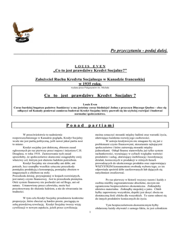 Po przeczytaniu - podaj dalej. ================================================================================================================== LOUIS EVEN „Co to jest prawdziwy Kredyt Socjalny?” Założyciel Ruchu Kredytu Socjalnego w Kanadzie francuskiej w 1935 roku. wydane przez Pielgrzymów św. Michała Co to jest prawdziwy Kredyt Socjalny ? Louis Even Coraz bardziej bogatsze państwo /bankierzy/ a my jesteśmy coraz biedniejsi/ Jedna z przyczyn Dlaczego Quebec - chce się odłączyć od Kanady ponieważ zamierza budować Kredyt Socjalny który pozwoli się im szybciej rozwijać i budować normalne społeczeństwo. Ponad partiami W przeciwieństwie to nadmiernie rozpowszechnionego w Kanadzie poglądu, Kredyt Socjalny wcale nie jest partią polityczną, jeśli nawet jakaś partia nosi to miano. Kredyt socjalny jest doktryną, zbiorem zasad ogłoszonych po raz pierwszy przez majora i inżyniera C.H. Douglasa, w roku 1918. Zastosowanie tych zasad sprawiłoby, że społeczeństwo skutecznie osiągnęłoby swój właściwy cel, którym jest służenie ludzkim potrzebom. Kredyt Socjalny nie stwarzałby ani dóbr, ani potrzeb, lecz usunąłby wszelkie sztuczne przeszkody pomiędzy produkcją a konsumpcją, pomiędzy zbożem w magazynach a chlebem na stole. Przeszkoda dzisiaj, przynajmniej w krajach rozwiniętych, jest natury czysto finansowej, Jest to przeszkoda pieniężna. Otóż system finansowy nie pochodzi ani od Boga, ani od natury. Ustanowiony przez człowieka, może być przystosowany do służenia ludziom, a nie do stwarzania im trudności. można oznaczyć stosunki między ludźmi oraz warunki życia, ułatwiające każdemu rozwój jego osobowości. W ustroju kredytowym nie zmagano by się już z problemami czysto finansowymi, nieustannie nękającymi społeczeństwo i które zatruwają stosunki między jednostkami. Odtąd finanse stanowiłyby już tylko system rachunkowości, wyrażający w cyfrach względne wartości produktów i usług, ułatwiający mobilizację i koordynację działań, koniecznych w produkcji w różnych fazach prowadzących do ukończonego produktu oraz zapewniający WSZYSTKIM konsumentom swobodę wyboru tego, co im odpowiada spośród dóbr zaoferowanych lub dających się natychmiast zrealizować. Po raz pierwszy w historii wszyscy razem i każdy z osobna mieliby zagwarantowane absolutne, niczym nie ograniczone bezpieczeństwo ekonomiczne. Zniknęłoby ubóstwo materialne. Zniknąłby niepokój o jutro. Chleb byłby zapewniony wszystkim, dopóki jest dosyć zboża na dostateczną ilość chleba dla wszystkich. To samo odnosi się do innych produktów koniecznych do życia. W tym celu Kredyt Socjalny przedstawia konkretne propozycje, które chociaż są bardzo proste, pociągają za sobą prawdziwą rewolucję. Kredyt Socjalny tworzy wizję cywilizacji w nowym aspekcie, jeżeli przez cywilizację Tym bezpieczeństwem ekonomicznym byłby obdarzony każdy obywatel z samego faktu, że jest członkiem 1 tych, którzy powinni być podmiotem tych decyzji, to polityczny infantylizm. Społeczeństwa, używającym w ciągu całego swego życia ogromnego kapitału społecznego, który stał się dominującym czynnikiem nowoczesnej produkcji. Na ten kapitał składają się m. in. bogactwa naturalne będące wspólnym dobrem; życie w stowarzyszeniu wraz z incrementum, , które z niego wypływa; suma odkryć, wynalazków, postępu technologicznego, nieustannie wzrastające dziedzictwo pokoleń. Ten społeczny kapitał, tak produktywny, przynosiłby w zysku każdemu współwłaścicielowi, każdemu obywatelowi okresową dywidendę, od kołyski aż do grobu. I zważywszy wielkość produkcji, jaką dzięki temu wspólnemu kapitałowi można osiągnąć, dywidenda dla każdego powinna wystarczyć do zaspokojenia przynajmniej zasadniczych potrzeb egzystencji. I to bez uszczerbku pensji lub innej formy wynagrodzenia, ponadto nie wyrządzając krzywdy tym, którzy osobiście biorą udział w produkcji. Dochód związany w ten sposób z osobą, a już nie jedynie z jej statusem najemnika, uchroniłby jednostki od wyzyskiwania ich przez innych ludzi. Mając zapewnione minimum konieczne do życia, człowiek mniej się pozwala popychać i może się lepiej oddać obranej karierze. Ludzie, wyzwoleni od przygniatających ich trosk materialnych, mogliby uprawiać swobodną działalność, bardziej twórczą niż praca nakazana i dążyć do osobistego rozwoju przez ćwiczenie dyspozycji ludzkich wyższych nad czynności czysto ekonomiczne. Zdobywanie podstaw materialnych nie byłoby już w ich życiu tak bardzo absorbującym zajęciem. Chociaż propozycje Kredytu Socjalnego są tak logiczne, tak społeczne i tak pełne szacunku dla ludzkiej osoby, jednak zrywają radykalnie z pojęciami powszechnie przyjętymi i uważanymi za namacalne i nienaruszalne. Dlatego Kredyt Socjalny nie może wynikać po prostu ze zmiany partii będącej u władzy. Nie narzuca się nowej cywilizacji drogą wyborów. Najpierw trzeba się postarać, żeby społeczeństwo ją poznało, pragnęło i do niej dążyło. A ponieważ chodzi tu o cywilizację kredytową, zgódźmy się, że najpierw trzeba wypracować mentalność kredytową, postarać się, żeby przewyższała postawa duchowa sprzyjająca wizji, jaką ukazuje Kredyt Socjalny. Zagadnienie więc nie polega na zachwalaniu jakiejś partii politycznej, ale na tym, by Kredyt Socjalny stał się znany, kochany i upragniony. Zresztą sama koncepcja partii sprzeciwia się filozofii Kredytu Socjalnego. Partie są po to, aby próbować przejąć władzę i tylko wtedy dobrze działają, gdy rozpoczyna się o nią walka. Kredyt Socjalny rozdzielałby władzę w możliwie najszerszym zakresie pomiędzy wszystkich członków społeczeństwa. Władzę ekonomiczną przez zagwarantowanie siły nabywczej każdej jednostce. Władzę polityczną - czyniąc posłów prawdziwymi przedstawicielami ich wyborców, a już nie sługami partii. Wyborcy powinni nauc
