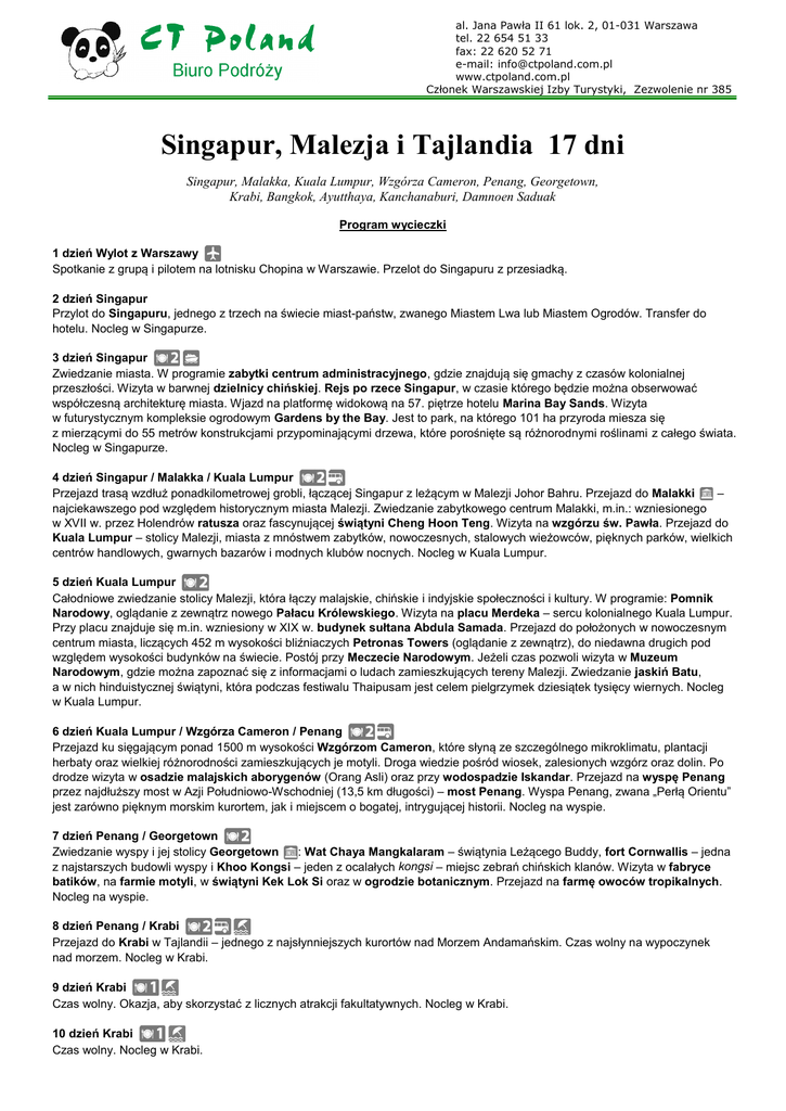 al. Jana Pawła II 61 lok. 2, 01-031 Warszawa tel. 22 654 51 33 fax: 22 620 52 71 e-mail: [email protected] www.ctpoland.com.pl Członek Warszawskiej Izby Turystyki, Zezwolenie nr 385 Singapur, Malezja i Tajlandia 17 dni Singapur, Malakka, Kuala Lumpur, Wzgórza Cameron, Penang, Georgetown, Krabi, Bangkok, Ayutthaya, Kanchanaburi, Damnoen Saduak Program wycieczki 1 dzień Wylot z Warszawy Spotkanie z grupą i pilotem na lotnisku Chopina w Warszawie. Przelot do Singapuru z przesiadką. 2 dzień Singapur Przylot do Singapuru, jednego z trzech na świecie miast-państw, zwanego Miastem Lwa lub Miastem Ogrodów. Transfer do hotelu. Nocleg w Singapurze. 3 dzień Singapur Zwiedzanie miasta. W programie zabytki centrum administracyjnego, gdzie znajdują się gmachy z czasów kolonialnej przeszłości. Wizyta w barwnej dzielnicy chińskiej. Rejs po rzece Singapur, w czasie którego będzie można obserwować współczesną architekturę miasta. Wjazd na platformę widokową na 57. piętrze hotelu Marina Bay Sands. Wizyta w futurystycznym kompleksie ogrodowym Gardens by the Bay. Jest to park, na którego 101 ha przyroda miesza się z mierzącymi do 55 metrów konstrukcjami przypominającymi drzewa, które porośnięte są różnorodnymi roślinami z całego świata. Nocleg w Singapurze. 4 dzień Singapur / Malakka / Kuala Lumpur Przejazd trasą wzdłuż ponadkilometrowej grobli, łączącej Singapur z leżącym w Malezji Johor Bahru. Przejazd do Malakki – najciekawszego pod względem historycznym miasta Malezji. Zwiedzanie zabytkowego centrum Malakki, m.in.: wzniesionego w XVII w. przez Holendrów ratusza oraz fascynującej świątyni Cheng Hoon Teng. Wizyta na wzgórzu św. Pawła. Przejazd do Kuala Lumpur – stolicy Malezji, miasta z mnóstwem zabytków, nowoczesnych, stalowych wieżowców, pięknych parków, wielkich centrów handlowych, gwarnych bazarów i modnych klubów nocnych. Nocleg w Kuala Lumpur. 5 dzień Kuala Lumpur Całodniowe zwiedzanie stolicy Malezji, która łączy malajskie, chińskie i indyjskie społeczności i kultury. W programie: Pomnik Narodowy, oglądanie z zewnątrz nowego Pałacu Królewskiego. Wizyta na placu Merdeka – sercu kolonialnego Kuala Lumpur. Przy placu znajduje się m.in. wzniesiony w XIX w. budynek sułtana Abdula Samada. Przejazd do położonych w nowoczesnym centrum miasta, liczących 452 m wysokości bliźniaczych Petronas Towers (oglądanie z zewnątrz), do niedawna drugich pod względem wysokości budynków na świecie. Postój przy Meczecie Narodowym. Jeżeli czas pozwoli wizyta w Muzeum Narodowym, gdzie można zapoznać się z informacjami o ludach zamieszkujących tereny Malezji. Zwiedzanie jaskiń Batu, a w nich hinduistycznej świątyni, która podczas festiwalu Thaipusam jest celem pielgrzymek dziesiątek tysięcy wiernych. Nocleg w Kuala Lumpur. 6 dzień Kuala Lumpur / Wzgórza Cameron / Penang Przejazd ku sięgającym ponad 1500 m wysokości Wzgórzom Cameron, które słyną ze szczególnego mikroklimatu, plantacji herbaty oraz wielkiej różnorodności zamieszkujących je motyli. Droga wiedzie pośród wiosek, zalesionych wzgórz oraz dolin. Po drodze wizyta w osadzie malajskich aborygenów (Orang Asli) oraz przy wodospadzie Iskandar. Przejazd na wyspę Penang przez najdłuższy most w Azji Południowo-Wschodniej (13,5 km długości) – most Penang. Wyspa Penang, zwana „Perłą Orientu” jest zarówno pięknym morskim kurortem, jak i miejscem o bogatej, intrygującej historii. Nocleg na wyspie. 7 dzień Penang / Georgetown Zwiedzanie wyspy i jej stolicy Georgetown : Wat Chaya Mangkalaram – świątynia Leżącego Buddy, fort Cornwallis – jedna z najstarszych budowli wyspy i Khoo Kongsi – jeden z ocalałych kongsi – miejsc zebrań chińskich klanów. Wizyta w fabryce batików, na farmie motyli, w świątyni Kek Lok Si oraz w ogrodzie botanicznym. Przejazd na farmę owoców tropikalnych. Nocleg na wyspie. 8 dzień Penang / Krabi Przejazd do Krabi w Tajlandii – jednego z najsłynniejszych kurortów nad Morzem Andamańskim. Czas wolny na wypoczynek nad morzem. Nocleg w Krabi. 9 dzień Krabi Czas wolny. Okazja, aby skorzystać z licznych atrakcji fakultatywnych. Nocleg w Krabi. 10 dzień Krabi Czas wolny. Nocleg w Krabi. 11 dzień Krabi / Bangkok / Ayutthaya Transfer na lotnisko i przelot do Bangkoku. Przejazd do położonej w pięknej, nadrzecznej scenerii Ayutthayi (stolicy Syjamu do 1767 r.), pełnej ruin dawnych wspaniałych świątyń i pałaców. Zwiedzanie zabytków Ayutthayi, których architektura była inspiracją dla późniejszych budowli Bangkoku. Wizyta w letnim kompleksie pałacowo-parkowym królów w Bang-Pa-In. Nocleg w Ayutthayi. 12 dzień Ayutthaya / Kanchanaburi Dalsze zwiedzanie Ayutthayi. Przejazd do Kanchanaburi, gdzie znajduje się znany z ekranizacji powieści Pierra Boulle’a most na rzece Kwai. Wizyta na cmentarzu oraz w muzeum jeńców wojennych, którzy budowali most oraz biegnącą przezeń trasę kolejową. Nocleg w Kanchanaburi. 13 dzień Kanchanaburi Wyprawa do Parku Narodowego Erewan. Spacery po dżungli, spotkanie z małpami, możliwość kąpieli przy pięknych wodospadach Erewan. Po południu przejazd „koleją śmierci”, którą budowali jeńcy wojenni podczas II wojny światowej i która miała pomóc Japonii w inwazji na Birmę. Powrót do hotelu i czas wolny. Nocleg w Kanchanaburi. 14 dzień Damnoen Saduak / Bangkok We wczesnych godzinach rannych wyjazd na pływający bazar Damnoen Saduak. Przejazd do Bangkoku (ok. 3 godz.). Spacer po chińskiej dzielnicy. Zwiedzanie świątyni Złotego Buddy (Wat Traimit). Największą atrakcję świątyni stanowi 3-metrowy, odlany ze szczerego złota posąg Buddy. Wieczorem rejs po rzece Chao Phraya. Kolacja w restauracji na statku. Nocleg w Bangkoku. 15 dzień Bangkok Wizyta w Wielkim Pałacu Królewskim i w znajdującej się na terenie pałacowym świątyni Szmaragdowego Buddy. Zwiedzanie świątyni Leżącego Buddy (Wat Pho), największej i najstars