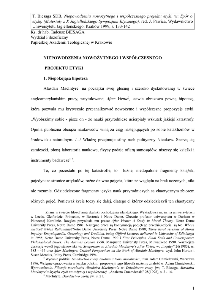 T. Biesaga SDB, Niepowodzenia nowożytnego i współczesnego projektu etyki, w: Spór o etykę. (Materiały z X Jagiellońskiego Sympozjum Etycznego), red. J. Pawica, Wydawnictwo Uniwersytetu Jagiellońskiego, Kraków 1999, s. 133-142 Ks. dr hab. Tadeusz BIESAGA Wydział Filozoficzny Papieskiej Akademii Teologicznej w Krakowie NIEPOWODZENIA NOWOŻYTNEGO I WSPÓŁCZESNEGO PROJEKTU ETYKI 1. Niepokojąca hipoteza Alasdair MacIntyre1 na początku swej głośnej i szeroko dyskutowanej w świece angloamerykańskim pracy, zatytułowanej After Virtue2, stawia obrazowo pewną hipotezę, która pozwala mu krytycznie przeanalizować nowożytne i współczesne propozycje etyki. „Wyobraźmy sobie - pisze on - że nauki przyrodnicze ucierpiały wskutek jakiejś katastrofy. Opinia publiczna obciąża naukowców winą za ciąg następujących po sobie kataklizmów w środowisku naturalnym. /.../ Władzę przejmuje silny ruch polityczny Nieuków. Szerzą się zamieszki, płoną laboratoria naukowe, fizycy padają ofiarą samosądów, niszczy się książki i instrumenty badawcze” 3. To, co pozostało po tej katastrofie, to luźne, niedopalone fragmenty książek, pojedyncze stronice artykułów, rożne dziwne pojęcia, które ze względu na brak uczonych, nikt nie rozumie. Odziedziczone fragmenty języka nauk przyrodniczych są chaotycznym zbiorem różnych pojęć. Ponieważ życie toczy się dalej, dlatego ci którzy odziedziczyli ten chaotyczny 1 Znany w świecie filozof amerykański pochodzenia irlandzkiego. Wykładowca m. in. na uniwersytetach w Leeds, Oksfordzie, Princeton, w Bostonie i Notre Dame. Obecnie profesor uniwersytetu w Durham w Północnej Karolinie. Rozgłos przyniosła mu praca: After Virtue: A Study in Moral Theory, Notre Dame University Press, Notre Dame 1981. Następne prace są kontynuacją podjętego przedsięwzięcia. są to: Whose Justice? Which Rationality?Notre Dame University Press, Notre Dame 1988; Three Rival Versions of Moral Inquiry: Encyclopaedia, Genealogy and Tradition, being Gifford Lectures delivered in University of Edinburgh in 1988, Notre Dame University Press, Notre Dame 1990 i First Principles, Final Ends and Contemporarz Philosophical Issues: The Aquinas Lecture 1990, Marquette Univeristy Press, Milwaukeee 1990. Ważniejsze dyskusje wokół jego stanowiska to: Symposium on Alasdair MacIntyre`s After Virtue, w: „Inquiry” 26(1983), ss. 383 - 466 oraz After MacIntyre. Critical Perspectives on the Work of Alasdair MacIntyre, wyd. John Horton i Susan Mendus, Polity Press, Cambridge 1994. 2 Wydanie polskie: Dziedzictwo cnoty. Studium z teorii moralności, tłum. Adam Chmielewski, Warszawa 1996. Wstępne opracowania w języku polskim propozycji tego filozofa możemy znaleźć w: Adam Chmielewski, Wprowadzenie. Filozofa moralności Alasdaira MacIntyre’a w: Dziedzictwo cnoty, jw.; T. Biesaga, Alasdaira MacIntyre’a krytyka etyki nowożytnej i współczesnej, „Analecta Cracoviensia” 28(1996), s. 3 - 14. 3 MacIntyre, Dziedzictwo cnoty, jw., s. 21. 1 T. Biesaga SDB, Niepowodzenia nowożytnego i współczesnego projektu etyki, w: Spór o etykę. (Materiały z X Jagiellońskiego Sympozjum Etycznego), red. J. Pawica, Wydawnictwo Uniwersytetu Jagiellońskiego, Kraków 1999, s. 133-142 zbiór pojęć, podejmują się na własną rękę ich interpretacji. Mnożą się więc przeróżne, subiektywne, konkurencyjne i kolidujące ze sobą wypowiedzi. Jeśli w tym wymyślonym świecie pojawiłaby się filozofia analityczna, „nigdy nie byłaby ona w stanie ujawnić faktu owego językowego nieuporządkowania /.../ albowiem stosuje ona techniki deskryptywne i opisuje język będący w użyciu w danym czasie”. /.../ „”Żadnych nieprawidłowości nie potrafiłaby również wykryć fenomenologia czy egzystencjalizm. wszystkie struktury intencjonalności byłyby takie same” 4. Po tym obrazowym opisie wyimaginowanej katastrofy i dalszego rozwoju nauk i filozofii, MacIntyre stawia hipotezę, że „w prawdziwym, zamieszkiwanym przez nas świecie, język moralności jest w stanie takiego właśnie wielkiego nieuporządkowania”. /.../ W naszym posiadaniu znajdują się jedynie fragmenty jakiegoś schematu pojęciowego, części oderwane od kontekstów, z których kiedyś czerpały swe znaczenie. Posiadamy jedynie pozory moralności, choć nadal posługujemy się wieloma kluczowymi dla niej pojęciami. Utraciliśmy jednak, w znacznej mierze, a może zgoła w całości nasze teoretyczne i praktyczne rozumienie moralności”5. Tę kontrowersyjną hipotezę, postawioną wobec nowożytnej i współczesnej tradycji moralnej próbuje MacIntyre uzasadnić w Dziedzictwie cnoty i kolejnych swoich pracach. 2. Wobec starożytnej i średniowiecznej filozofii moralnej Dla porównania A. MacIntyre przywołuje schemat moralnego uzasadniania charakterystyczny dla etyki Arystotelesa, który dzięki św. Tomaszowi, został przyjęty w również w europejskim Średniowieczu. Podstawową strukturę tego schematu uzasadniania moralności znajdujemy w Etyce nikomachejskiej. Jest to przede wszystkim schemat teleologiczny. W schemacie tym funkcjonują pewne pojęcia, które wzajemnie są ze sobą 4 5 Tamże, s. 23. Tamże. 2 T. Biesaga SDB, Niepowodzenia nowożytnego i współczesnego projektu etyki, w: Spór o etykę. (Materiały z X Jagiellońskiego Sympozjum Etycznego), red. J. Pawica, Wydawnictwo Uniwersytetu Jagiellońskiego, Kraków 1999, s. 133-142 powiązane. Jednym z nim jest pojęcie człowieka-jakim-on-faktycznie-jest i pojęcie człowieka-jakim mógłby-się-on-stać-gdymy-zrealizował-swoją-istotę6. W myśl tych wyróżnień etyka miała „umożliwiać ludziom zrozumienie, w jaki sposób mogą oni dokonać przejścia z pierwszego stanu do drugiego”7. Zakładała ona pewną koncepcją potencjalności i aktu, pewną koncepcję istoty człowieka a „przede wszystkim określoną koncepcje ludzkiego telos. Nakazy zalecające różne cnoty, praktycznie pokazywały i jednocześn