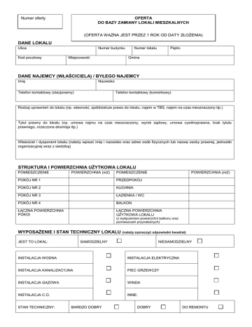 Numer oferty OFERTA DO BAZY ZAMIANY LOKALI MIESZKALNYCH (OFERTA WAŻNA JEST PRZEZ 1 ROK OD DATY ZŁOŻENIA) DANE LOKALU Ulica Kod pocztowy Numer budynku Miejscowość Numer lokalu Piętro Gmina DANE NAJEMCY (WŁAŚCICIELA) / BYŁEGO NAJEMCY Imię Nazwisko Telefon kontaktowy (komórkowy) Telefon kontaktowy (stacjonarny) Rodzaj uprawnień do lokalu (np. własność, spółdzielcze prawo do lokalu, najem w TBS, najem na czas nieoznaczony itp.) Tytuł prawny do lokalu (np. umowa najmu na czas nieoznaczony, wyrok sądowy, umowa cywilnoprawna, brak tytułu prawnego, orzeczona eksmisja itp.) Właściciel / dysponent lokalu (należy wpisać imię i nazwisko oraz adres osób fizycznych lub nazwę osoby prawnej, jednostki organizacyjnej wraz z siedzibą) STRUKTURA I POWIERZCHNIA UŻYTKOWA LOKALU POMIESZCZENIE POWIERZCHNIA (m2) POMIESZCZENIE POWIERZCHNIA (m2) POKÓJ NR 1 PRZEDPOKÓJ POKÓJ NR 2 KUCHNIA POKÓJ NR 3 ŁAZIENKA / WC POKÓJ NR 4 BALKON ŁĄCZNA POWIERZCHNIA POKOI ŁĄCZNA POWIERZCHNIA UŻYTKOWA LOKALU (z wyłączeniem powierzchni balkonu oraz pomieszczeń przynależnych) WYPOSAŻENIE I STAN TECHNICZNY LOKALU JEST TO LOKAL: (należy zaznaczyć odpowiedni kwadrat) SAMODZIELNY NIESAMODZIELNY INSTALACJA WODNA INSTALACJA ELEKTRYCZNA INSTALACJA KANALIZACYJNA PIEC GRZEWCZY INSTALACJA GAZOWA WINDA INSTALACJA C.O. INNE: STAN TECHNICZNY: BARDZO DOBRY DOBRY DO REMONTU OPŁATY CZYNSZOWE I WYSTĘPUJĄCE (EWENTUALNIE) ZADŁUŻENIE Miesięczne opłaty zł Całkowite zadłużenie czynszowe/odszkodowanie zł czynszowe/odszkodowanie Miesięczne opłaty niezależne (za media) zł Całkowite zadłużenie za opłaty zł Odsetki, koszty sądowe itp. zł Data zł niezależne (za media) Ilość osób zgłoszonych do zamieszkiwania os. (ilość osób, za które płacone są media) DODATKOWE INFORMACJE Całkowita suma zadłużenia na dzień Wypowiedzenie umowy z tytułu …………..…………….…………………………………………..… Powództwo o eksmisję Wyrok orzekający eksmisję POTWIERDZENIE AZK / ZARZĄDCY / WŁAŚCICIELA BUDYNKU / LOKALU: .................................. ............................................................................................... (data) (podpis, pieczęć i adres AZK / zarządcy / właściciela budynku / lokalu) WYMOGI, JAKIE POWINIEN SPEŁNIAĆ LOKAL UZYSKANY W WYNIKU ZAMIANY Wielkość od …….. do …….. m2 Struktura Stan techniczny ……………………… Wyposażenie techniczne Lokalizacja: Czy jest Pan/i zainteresowana zamianą za spłatę zadłużenia? Dzielnica …………….….. Piętro ……..... TAK Winda NIE TAK NIE do kwoty ……………………….. Oświadczam, iż: wyrażam zgodę na: nie wyrażam zgody na: - przetwarzanie danych osobowych (z wyłączeniem danych dotyczących zadłużenia związanego z korzystaniem z lokalu mieszkalnego stanowiącego przedmiot oferty) zawartych w niniejszej ofercie oraz - przekazywanie danych w niej zawartych innym osobom posiadającym ofertę w Bazie Zamiany Lokali Mieszkalnych; - opublikowanie oferty w Internecie (strona zamiany.azk.lodz.pl) w zakresie: adresu i własności budynku, tytułu prawnego, struktury, wielkości i stanu technicznego mieszkania oraz preferencji dotyczących lokalu uzyskanego w wyniku zamiany BRAK WYRAŻENIA ZGODY BĘDZIE UNIEMOŻLIWIAŁ UDOSTĘPNIENIE OFERTY INNYM OSOBOM …………..…………… (data) ………………………………………………. (podpis osoby składającej ofertę) Dodatkowo oświadczam, iż: wyrażam zgodę na: - nie wyrażam zgody na: przetwarzanie danych osobowych w powyższym zakresie również w zakresie danych dotyczących zadłużenia związanego z korzystaniem z lokalu mieszkalnego stanowiącego przedmiot oferty …………..…………… (data) ………………………………………………. (podpis osoby składającej ofertę)