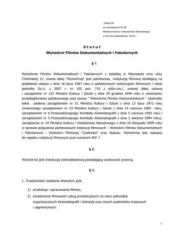 Załącznik do zarządzenia Nr 26 Ministra Kultury i Dziedzictwa Narodowego z dnia 20 października 2010 r. Statut Wytwórni Filmów Dokumentalnych i Fabularnych § 1. Wytwórnia Filmów Dokumentalnych i Fabularnych z siedzibą w Warszawie przy ulicy Chełmskiej 21, zwana dalej "Wytwórnią" jest państwową instytucją filmową działającą na podstawie ustawy z dnia 16 lipca 1987 roku o państwowych instytucjach filmowych / tekst jednolity Dz.U. z 2007 r. nr 102 poz. 710 z późn.zm./, zwanej dalej ustawą i zarządzenia nr 122 Ministra Kultury i Sztuki z dnia 29 grudnia 1949 roku o utworzeniu przedsiębiorstwa państwowego pod nazwą " Wytwórnia Filmów Dokumentalnych " (jednolity tekst ustalony zarządzeniem nr 51 Ministra Kultury i Sztuki z dnia 13 lipca 1972 roku zmienionego zarządzeniem nr 23 Ministra Kultury i Sztuki z dnia 14 czerwca 1983 roku, zarządzeniem nr 6 Przewodniczącego Komitetu Kinematografii z dnia 5 czerwca 1992 roku i zarządzeniem nr 5 Przewodniczącego Komitetu Kinematografii z dnia 2 sierpnia 1994 roku), zarządzenia nr 24 Ministra Kultury i Dziedzictwa Narodowego z dnia 18 listopada 2009 roku w sprawie połączenia państwowych instytucji filmowych – Wytwórni Filmów Dokumentalnych i Fabularnych i Wytwórni Filmowej “Czołówka” oraz Statutu. Wytwórnia jest wpisana do rejestru instytucji filmowych pod numerem RIF 7 . § 2. Wytwórnia jest instytucją wielozakładową posiadającą osobowość prawną. § 3. 1. Przedmiotem działania Wytwórni jest: 1) produkcja i opracowanie filmów, 2) świadczenie filmowych usług produkcyjnych na rzecz jednostek organizacyjnych kinematografii i telewizji oraz innych podmiotów krajowych i zagranicznych. 1 2. Wytwórnia moŜe podejmować inną działalność słuŜącą realizacji zadań, o których mowa w ust. 1. § 4. Organami Wytwórni są: 1) dyrektor, 2) ogólne zebranie pracowników oraz rada pracownicza. § 5. 1. Dyrektor zarządza Wytwórnią i reprezentuje ją na zewnątrz, podejmuje decyzje samodzielnie i ponosi za nie odpowiedzialność. 2. Dyrektor zarządza Wytwórnią przy pomocy zastępcy i głównego księgowego, przez siebie powoływanych i odwoływanych za zgodą rady pracowniczej. 3. Załoga instytucji filmowej uczestniczy w zarządzaniu Wytwórnią na zasadach określonych w ustawie z dnia 25 września 1981r. o samorządzie załogi przedsiębiorstwa państwowego ( Dz.U. nr 24 poz.123 z późn. zm. ) z zastrzeŜeniem art. 33 ustawy. § 6. Do dokonywania czynności prawnych samodzielnie w imieniu Wytwórni upowaŜniony jest dyrektor oraz działający w ramach ich umocowania - zastępca dyrektora i pełnomocnicy. § 7. W Wytwórni działają: 1) zakłady realizujące zadania produkcyjne, 2) wydziały świadczące usługi na rzecz zakładów i innych jednostek organizacyjnych Wytwórni oraz innych kontrahentów, 3) działy funkcjonujące jako komórki organizacyjne zarządu. Organizację wewnętrzną Wytwórni przedstawia schemat organizacyjny stanowiący załącznik do niniejszego statutu. § 8. Komórki organizacyjne działające na zasadach wewnętrznego, ograniczonego rozrachunku gospodarczego, świadczą usługi na rzecz kontrahentów krajowych i zagranicznych w następującym zakresie: 2 1) Zakład - Laboratorium Filmowe - obróbka światłoczułej, barwnej i czarnobiałej taśmy filmowej, obrazu i dźwięku, w tym: wywoływanie negatywów obrazu filmów, wykonywanie kopii pozytywowych filmów, negatywów dźwięku filmów, montaŜ negatywów obrazu filmów, przeglądy i ocena techniczna materiałów filmowych - cyfrowe przetwarzanie obrazów filmowych z wykorzystaniem technologii Digital Intermediate, w tym: cyfrowa korekta barwna obrazu filmowego , wykonywanie negatywów obrazu filmów poprzez przeniesienie (naświetlenie) cyfrowych obrazów filmu na filmowe taśmy światłoczułe, wykonywanie efektów filmowych - przetwarzanie obrazów stereoskopowych - standaryzowanie obrazu filmu do formatów emisyjnych (kino i TV) - archiwizacja materiałów filmowych na materiałach światłoczułych i cyfrowych - rekonstrukcja archiwalnych materiałów filmowych - warsztaty i szkolenia z dziedziny postprodukcji filmowej 2) Zakład Środków Inscenizacji i Hal Zdjęciowych - obsługa filmowych grup produkcyjnych związana z udostępnianiem hal zdjęciowych i studiów, pomieszczeń specjalistycznych, powierzchni produkcyjnych oraz magazynowych - obsługa inscenizacyjna w zakresie kostiumów i rekwizytów a takŜe pozyskiwanie, wypoŜyczanie, wytwarzanie, udostępnianie wypoŜyczanie środków inscenizacji oraz ich konserwacja, drobnych elementów architektonicznych oraz rekwizytów. W zakresie środków inscenizacji, kostiumów oraz rekwizytów i drobnych form architektonicznych zakład moŜe podejmować działalność nie związaną bezpośrednio z obsługą produkcji filmowej 3) Zakład MontaŜu i Dźwięku świadczenie usług związanych z udźwiękowieniem filmów zarejestrowanych na taśmie światłoczułej, w tym: - wynajem montaŜowni obrazu i dźwięku - wynajem aparatury do rejestracji dźwięku na planie filmowym - wynajem studia synchronizacyjnego do nagrań i przegrań (miksaŜu) - wynajem przepisywalni do przepisania (transferu) dźwięku - wynajem sal projekcyjnych - zakup, gromadzenie, przechowywanie i udostępnianie materiałów dźwiękowych /muzyki i efektów/ Fonoteki 3 4) Zakład Techniki Zdjęciowej - wynajem filmowych kamer zdjęciowych i zestawów zdjęciowych do rejestracji obrazu w technice elektronicznej - wynajem pomocniczego sprzętu zdjęciowego - przepisywanie materiałów filmowych na róŜne nośniki - skanowanie , montaŜ elektroniczny i kompozycja obrazu - rekonstrukcja obrazu filmowego i telewizyjnego, - kopiowanie materiałów video - wykonywanie kopii dystrybucyjnych filmów dla kina cyfrowego 5) Zakład Zaplecza Technicznego - działalność inwestycyjna sprawozdawczości polegająca z nowych inwestycji, na planowaniu, prowadzeniu i modernizacji istniejących obiekt