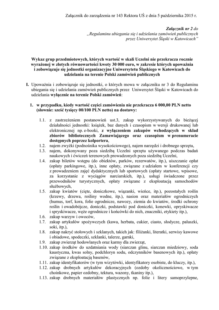 Załącznik do zarządzenia nr 143 Rektora UŚ z dnia 5 października 2015 r. Załącznik nr 2 do „Regulaminu ubiegania się i udzielania zamówień publicznych przez Uniwersytet Śląski w Katowicach” Wykaz grup przedmiotowych, których wartość w skali Uczelni nie przekracza rocznie wyrażonej w złotych równowartości kwoty 30 000 euro, w zakresie których upoważnia i zobowiązuje się jednostki organizacyjne Uniwersytetu Śląskiego w Katowicach do udzielania na terenie Polski zamówień publicznych I. Upoważnia i zobowiązuje się jednostki, o których mowa w załączniku nr 3 do Regulaminu ubiegania się i udzielania zamówień publicznych przez Uniwersytet Śląski w Katowicach do udzielania wyłącznie na terenie Polski zamówień: 1. w przypadku, kiedy wartość części zamówienia nie przekracza 6 000,00 PLN netto (słownie: sześć tysięcy 00/100 PLN netto) na dostawy: 1.1. z zastrzeżeniem postanowień ust.3, zakup wykorzystywanych do bieżącej działalności jednostki: książek, baz danych i czasopism w wersji drukowanej lub elektronicznej np. e-booki, z wyłączeniem zakupów wchodzących w skład zbiorów bibliotecznych Zamawiającego oraz czasopism w prenumeracie dostępnych poprzez kolportera, 1.2. najem zwyżki (podnośnika wysokościowego), najem narzędzi i drobnego sprzętu, 1.3. najem, dokonywany poza siedzibą Uczelni sprzętu używanego podczas badań naukowych i ćwiczeń terenowych prowadzonych poza siedzibą Uczelni, 1.4. zakup biletów wstępu (do obiektów, parków, rezerwatów, itp.), uiszczanie opłat (opłaty parkingowe, itp.), inne opłaty, związane z udziałem w konferencji czy z prowadzeniem zajęć dydaktycznych lub sportowych (opłaty startowe, wpisowe, za korzystanie z wyciągów narciarskich, itp.), usługi świadczone przez przewodników turystycznych, opłaty związane z eksploatacją samochodów służbowych, 1.5. zakup kwiatów (cięte, doniczkowe, wiązanki, wieńce, itp.), pozostałych roślin (krzewy, drzewa, rośliny wodne, itp.), nasion oraz materiałów ogrodniczych (humus, torf, kora, folie ogrodnicze, nawozy, ziemia do kwiatów, środki ochrony roślin i owadobójcze, doniczki, podstawki pod doniczki, konewki, opryskiwacze i spryskiwacze, węże ogrodnicze i końcówki do nich, znaczniki, etykiety itp.), 1.6. zakup warzyw i owoców, 1.7. zakup artykułów spożywczych (kawa, herbata, cukier, ciasto, słodycze, paluszki, soki, itp.), 1.8. zakup nakryć stołowych i szklanych, takich jak: filiżanki, literatki, serwisy kawowe i obiadowe, spodeczki, szklanki, talerze, garnki, 1.9. zakup zwierząt hodowlanych oraz karmy dla zwierząt, 1.10. zakup środków do uzdatniania wody (siarczan glinu, siarczan miedziowy, soda kaustyczna, kwas solny, podchloryn sodu, odczynników basenowych itp.), opłaty związane z eksploatacją basenów, 1.11. zakup identyfikatorów (w tym wizytówki, identyfikatory osobiste, do kluczy, itp.), 1.12. zakup drobnych artykułów dekoracyjnych (ozdoby okolicznościowe, w tym choinkowe, papier ozdobny, tektura, wazony, tkaniny itp.), 1.13. zakup drobnych materiałów plastycznych np. folie i litery samoprzylepne, 1.14. 1.15. 1.16. 1.17. 1.18. 1.19. 1.20. 1.21. 1.22. 1.23. 1.24. 1.25. 1.26. 1.27. 1.28. 1.29. 1.30. 1.31. 1.32. 1.33. 1.34. 1.35. 1.36. 1.37. 1.38. 1.39. plastelina, farby wodne (w tym akwarelowe, plakatowe) i olejne (artystyczne), pastele, brystol, pędzelki, sztalugi, fotoramy, ramy, antyramy, tasiemki, wstążki, sznurek itp., zakup jednorazowych opakowań (torebki, woreczki, pudełka, itp.), zakup płyt, taśm i pozostałych nośników z zarejestrowanym dźwiękiem lub obrazem oraz ramek i magazynków do przeźroczy, zakup map i planów miast, zakup flag, zakup pomocy dydaktycznych oraz modeli, plansz, zabawek, gier planszowych i artykułów modelarskich, magnesów itp. używanych do celów dydaktycznych, zakup klei: poxipol, poxilina, distal oraz klei kontaktowych i innych (np. superglue, kropelka, cyjanopan), zakup spoiw lutowniczych, zakup szyb, luster, zakup kalkulatorów, zakup zegarów, zakup ubrań reprezentacyjnych, zakup innych, drobnych artykułów, takich jak np. termometry pokojowe, kartki pocztowe, w tym świąteczne i okolicznościowe, lakier do włosów, pinezki, zapałki, świeczki, żyletki, słomki, naftalina, bibuła filtracyjna, lanolina, drożdże, artykuły pasmanteryjne, wieszaki samoprzylepne, tacki styropianowe, chusteczki jednorazowe, baterie do urządzeń elektronicznych niedostępne w magazynie, zakup, dokonywany poza siedzibą Uczelni innych drobnych materiałów niezbędnych do działalności dydaktycznej i badawczej prowadzonej poza siedzibą Uczelni, zakup artykułów alpinistycznych: liny, sznury, karabinki, szekle, bloczki i innych. zakup filmów do aparatów fotograficznych oraz odczynników do wywoływania filmów oraz innych materiałów fotograficznych, zakup toreb do notebooków oraz do innego sprzętu elektronicznego. zakup środków do zwalczania gryzoni, owadów, itp., zakup biletów kolejowych i lotniczych (płatne przelewem1), w zakresie krótkoterminowego (tj. nieprzekraczającego 30 dni) wynajmu obiektów lub pomieszczeń na cele dydaktyczne, sportowe lub okolicznościowe, zakup wody mineralnej, elementy jednorazowego użytku stanowiące wyposażenie defibrylatora zakup sprzętu ekspedycyjnego oraz ubiorów specjalistycznych. zakup oznaczeń informacyjnych (np. piktogramy, oznaczenia BHP, P.Poż), zakup materiałów introligatorskich oraz drobne akcesoria do zabezpieczania, napraw oraz renowacji specjalnych zbiorów bibliotecznych np. taśmy do konserwacji; środki do konserwacji papieru, skóry; bezkwasowe pudełka, teczki, papiery, obwoluty, kartony, tektury; specjalistyczne rękawiczki, kostki introligatorskie, gąbki do czyszczenia zbiorów; płótno introligatorskie i inne najem elementów zabezpieczających (ogrodzenia, siatki, rusztowania, daszki i inne), zakup drobnych części do żaluzji nieobjętych gwarancją, 1 Biletów kolejowych, fa