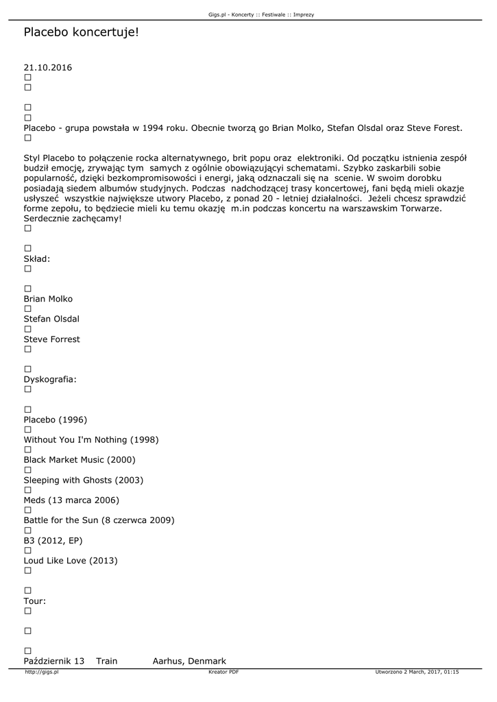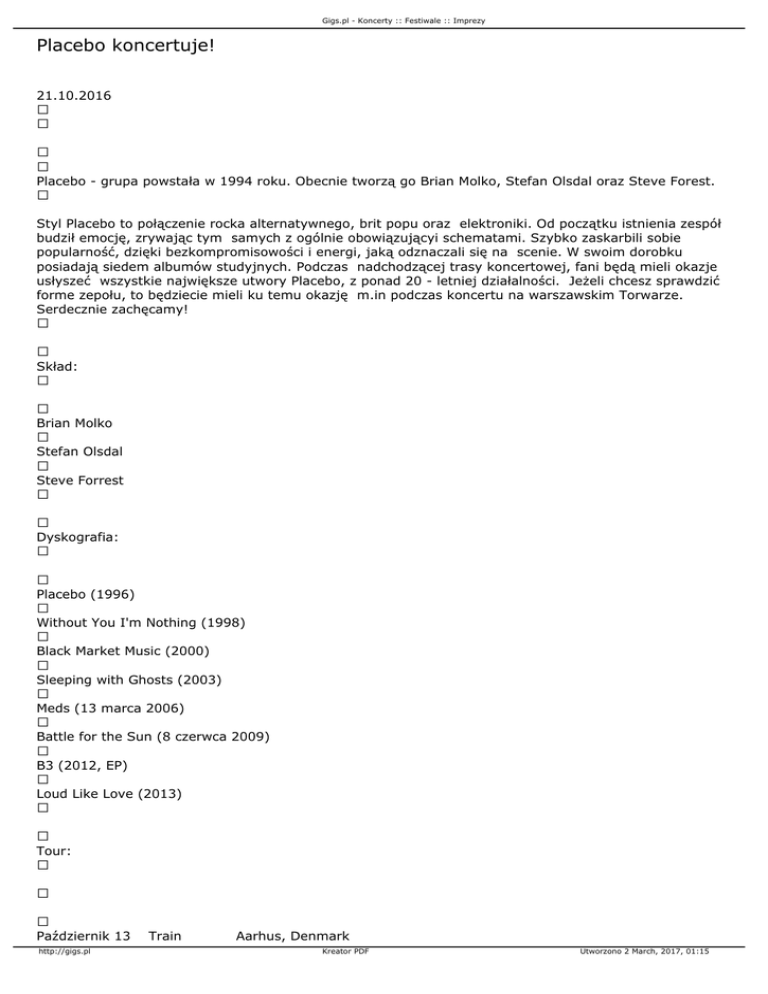 Gigs.pl - Koncerty :: Festiwale :: Imprezy Placebo koncertuje! 21.10.2016 Placebo - grupa powstała w 1994 roku. Obecnie tworzą go Brian Molko, Stefan Olsdal oraz Steve Forest. Styl Placebo to połączenie rocka alternatywnego, brit popu oraz elektroniki. Od początku istnienia zespół budził emocję, zrywając tym samych z ogólnie obowiązującyi schematami. Szybko zaskarbili sobie popularność, dzięki bezkompromisowości i energi, jaką odznaczali się na scenie. W swoim dorobku posiadają siedem albumów studyjnych. Podczas nadchodzącej trasy koncertowej, fani będą mieli okazje usłyszeć wszystkie największe utwory Placebo, z ponad 20 - letniej działalności. Jeżeli chcesz sprawdzić forme zepołu, to będziecie mieli ku temu okazję m.in podczas koncertu na warszawskim Torwarze. Serdecznie zachęcamy! Skład: Brian Molko Stefan Olsdal Steve Forrest Dyskografia: Placebo (1996) Without You I'm Nothing (1998) Black Market Music (2000) Sleeping with Ghosts (2003) Meds (13 marca 2006) Battle for the Sun (8 czerwca 2009) B3 (2012, EP) Loud Like Love (2013) Tour: Październik 13 http://gigs.pl Train Aarhus, Denmark Kreator PDF Utworzono 2 March, 2017, 01:15 Gigs.pl - Koncerty :: Festiwale :: Imprezy Październik 14 Store Vega Kobenhavn V, Denmark Październik 16 Sentrum Scene Oslo, Norway Październik 18 Cirkus Stockholm, Sweden Październik 20 Hartwall Arena Helsinki, Finland Październik 22 Arena Riga Riga, Latvia Październik 24 Ice Palace Saint Petersburg, Russian Federation Październik 26 Olympic Stadium Moskva, Russia Październik 29 Torwar Warsaw, Poland Październik 31 Barclaycard Arena Hamburg, Germany Listopad 02 Lanxess Arena Cologne, Germany Listopad 04 Olympiahalle München, Germany Listopad 05 Arena Leipzig Leipzig, Germany Listopad 07 Mercedes-Benz Arena Berlin, Germany Listopad 08 Forum Karlín Prague, Czech Republic Listopad 10 KC Dra¾en Petrovia Zagreb, Croatia Listopad 11 Budapest Sportaréna Budapest, Hungary Listopad 13 Wiener Stadthalle Vienna, Austria Listopad 15 Mediolanum Forum Milan, Italy Listopad 16 Hallenstadion Zurich, Switzerland Listopad 18 Zénith Arena Lille, France Listopad 19 Sportpaleis Antwerp, Belgium Listopad 21 Ziggo Dome Amsterdam Zuidoost, Netherlands Listopad 23 Festhalle Frankfurt, Germany Listopad 24 Hanns-Martin-Schleyer-Halle Stuttgart, Germany Listopad 26 Galaxie Amn Éville, France Listopad 28 ZENITH NANTES METROPOLE Saint Herblain, France Listopad 29 Accorhotels Arena Paris, France Grudzień 02 The SSE Hydro Glasgow, United Kingdom Grudzień 03 First Direct Arena Leeds, United Kingdom Grudzień 05 Manchester Arena Manchester, United Kingdom Grudzień 06 Motorpoint Arena Nottingham Nottingham, United Kingdom http://gigs.pl Kreator PDF Utworzono 2 March, 2017, 01:15 Gigs.pl - Koncerty :: Festiwale :: Imprezy Grudzień Grudzień Grudzień Grudzień Grudzień 08 Barclaycard Arena Birmingham, United Kingdom 10 3Arena 12 Newport Centre 14 The Brighton Centre Brighton, United Kingdom 15 SSE Arena, Wembley London, United Kingdom Dublin, Ireland Newport, United Kingdom http://gigs.pl Kreator PDF Utworzono 2 March, 2017, 01:15