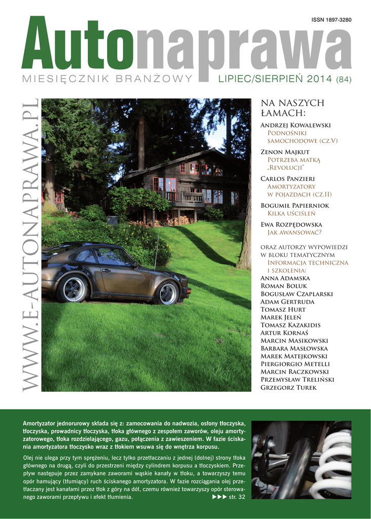 Autonaprawa ISSN 1897-3280 LIPIEC/SIERPIEŃ 2014 (84) WWW.E-AUTONAPRAWA.PL MIESIĘCZNIK BRANŻOWY Amortyzator jednorurowy składa się z: zamocowania do nadwozia, osłony tłoczyska, tłoczyska, prowadnicy tłoczyska, tłoka głównego z zespołem zaworów, oleju amortyzatorowego, tłoka rozdzielającego, gazu, połączenia z zawieszeniem. W fazie ściskania amortyzatora tłoczysko wraz z tłokiem wsuwa się do wnętrza korpusu. Olej nie ulega przy tym sprężeniu, lecz tylko przetłaczaniu z jednej (dolnej) strony tłoka głównego na drugą, czyli do przestrzeni między cylindrem korpusu a tłoczyskiem. Przepływ następuje przez zamykane zaworami wąskie kanały w tłoku, a towarzyszy temu opór hamujący (tłumiący) ruch ściskanego amortyzatora. W fazie rozciągania olej przetłaczany jest kanałami przez tłok z góry na dół, czemu również towarzyszy opór sterowanego zaworami przepływu i efekt tłumienia. str. 32 na naszych łamach: Andrzej Kowalewski Podnośniki samochodowe (cz.V) Zenon Majkut Potrzeba matką „Revolucji” Carlos Panzieri Amortyzatory w pojazdach (cz.II) Bogumił Papierniok Kilka uściśleń Ewa Rozpędowska Jak awansować? oraz autorzy wypowiedzi w bloku tematycznym Informacja techniczna i szkolenia: Anna Adamska Roman Boluk Bogusław Czaplarski Adam Gertruda Tomasz Hurt Marek Jeleń Tomasz Kazakidis Artur Kornaś Marcin Masikowski Barbara Masłowska Marek Matejkowski Piergiorgio Metelli Marcin Raczkowski Przemysław Treliński Grzegorz Turek OD REDAKCJI | 3 Autonaprawa www.e-autonaprawa.pl Adres redakcji: pl. Nowy Targ 28/14 50-141 Wrocław tel. 71 715 77 95 faks 71 343 35 41 [email protected] www.technotransfer.pl Klauzula Numer rachunku bankowego: 03 1140 2004 0000 3102 5467 9483 W 1965 roku John Lennon, członek zespołu The Beatles, był już tak bogaty, że kupił sobie samochód rolls-royce phantom V, fabrycznie pokryty czarnym, matowym lakierem. Jednak pół roku później zlecił Cyganom ręczne pomalowanie go w fantazyjne kwiatki na żółtym tle. Oburzony producent zapowiedział, iż pan Lennon niczego więcej już od nich nie kupi. I tak też się stało, ponieważ sławny artysta w ogóle stracił zainteresowanie tą specyficzną marką, a przedmiot sporu, wyceniony na 200 tysięcy dolarów, oddał po paru latach amerykańskiemu fiskusowi za podatkowe długi. Później sprzedano go na licytacji za 2,3 mln dolarów. Stał się więc jednym z najdroższych aut w historii motoryzacji i to głównie za sprawą owych „profanujących” go przeróbek. Dziś już raczej nikt nie próbuje bezpośrednio karać swych klientów za sposób korzystania ze sprzedawanych im produktów. Nie znaczy jednak, by samochodowe koncerny szanowały w pełni własnościowe prawa nabywców. Jedynie sposoby częściowego ich „wywłaszczania” stały się bardziej wyrafinowane, czego dowodzi wciąż aktualny spór o tzw. klauzulę napraw. Otóż zdaniem większości producentów samochodów ich prawni właściciele nie mogą przy ich naprawianiu stosować części zamiennych pochodzących spoza macierzystej korporacji. Co dziwne, nie dotyczy to elementów istotnych z punktu widzenia bezpieczeństwa ruchu drogowego lub ochrony środowiska, lecz tylko tych zewnętrznych, czy z zewnątrz widocznych, jak osłonowe poszycia nadwozia, ochronne pokrywy zderzaków, lusterka, lampy itp. Gdy nie wiadomo, o co chodzi, to pewnie… Tak jest i w tym wypadku. Na przykład w Polsce, gdzie w tym zakresie obowiązują zasady wolnej konkurencji, obroty te w 90% kontrolują firmy produkujące samochody. Według zaś ostrożnych szacunków nasz rynek tzw. widocznych części zamiennych jest wart 2,5 mld zł. Poza nami wolnorynkowe reguły stosuje w tym sektorze tylko 11 państw UE, w pozostałych zaś uznawane są monopole samochodowych marek. Nie można wprawdzie zmusić klienta, by na danym państwowym obszarze kupował potrzebne mu towary wyłącznie od określonych dostawców, jednak monopol posiadany w jakiejś dziedzinie pozwala eliminować z rynku niepożądanych konkurentów za pomocą oficjalnych zakazów sprzedaży, czyli de facto produkcji lub importu. Ochroną monopolistycznych interesów zajmują się za pieniądze podatników rozmaite państwowe służby. Pojawia się więc pytanie, jaki za tym stoi realny społeczny interes? Początkowo koncerny samochodowe próbowały przekonywać opinię publiczną, że chodzi im o bezpieczeństwo, ochronę zdrowia i przyrody. Nie trzeba być jednak znawcą, by uznać takie argumenty za całkiem nieracjonalne. Wobec tego przywołano prawa autorskie projektantów nadwozi, strzeżone na zasadzie rejestracji przemysłowych wzorów. W ten sposób niezależna produkcja zewnętrznych części dokładnie pasujących do danego modelu samochodu może być karana jak popełnienie plagiatu. Śmieszne? Nie dla wszystkich, bo każdy monopol oznacza możliwość nieuczciwego podwyższania cen. Redaktor naczelny: Marian Kozłowski [email protected] Sekretarz redakcji: Bogusława Krzczanowicz [email protected] Redakcja e-autonaprawa.pl: Adam Rudziński [email protected] Stali współpracownicy: Jacek Jabłoński, Andrzej Kowalewski, Hubert Kwarta, Zenon Majkut, Ewa Rozpędowska, Toni Seidel, Leszek A. Stricker, Tomasz Szulc, KrzaQ Marketing i reklama: Małgorzata Salamaga-Borysenko tel. 71 733 67 56 [email protected] Przemysław Krzczanowicz tel. 71 715 77 96 [email protected] Prenumerata: tel. 71 715 77 95 [email protected] Opracowanie graficzne i skład: Taurus CD tel. 71 715 77 98 Wydawca: Wydawnictwo Technotransfer Druk i oprawa: Delta Wrocław Zdjęcia na okładce: wordpress.com, vrperformance.com Marian Kozłowski Fot. archiwum Wszelkie prawa zastrzeżone. Przedruk materiałów wyłącznie za zgodą redakcji. Materiałów niezamówionych redakcja nie zwraca. Zastrzegamy sobie prawo do skrótów i redakcyjnego opracowania tekstów przyjętych do druku. Redakcja nie bierze odpowiedzialności za treść reklam i ogłoszeń. Autonaprawa | Lipiec/si