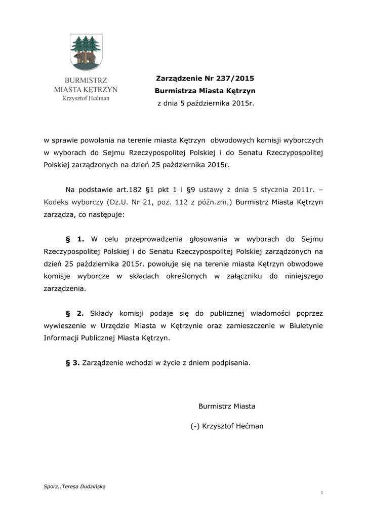 Zarządzenie Nr 237/2015 Burmistrza Miasta Kętrzyn