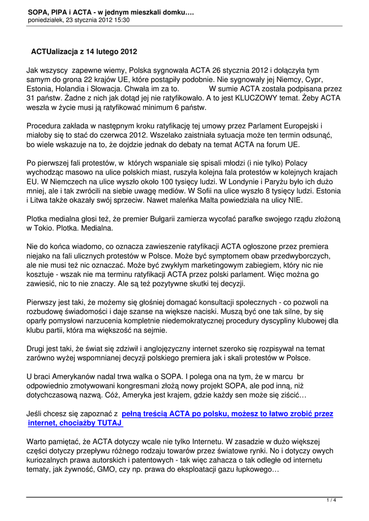SOPA, PIPA i ACTA - w jednym mieszkali domku…. poniedziałek, 23 stycznia 2012 15:30 ACTUalizacja z 14 lutego 2012 Jak wszyscy zapewne wiemy, Polska sygnowała ACTA 26 stycznia 2012 i dołączyła tym samym do grona 22 krajów UE, które postąpiły podobnie. Nie sygnowały jej Niemcy, Cypr, Estonia, Holandia i Słowacja. Chwała im za to. W sumie ACTA została podpisana przez 31 państw. Żadne z nich jak dotąd jej nie ratyfikowało. A to jest KLUCZOWY temat. Żeby ACTA weszła w życie musi ją ratyfikować minimum 6 państw. Procedura zakłada w następnym kroku ratyfikację tej umowy przez Parlament Europejski i miałoby się to stać do czerwca 2012. Wszelako zaistniała sytuacja może ten termin odsunąć, bo wiele wskazuje na to, że dojdzie jednak do debaty na temat ACTA na forum UE. Po pierwszej fali protestów, w których wspaniale się spisali młodzi (i nie tylko) Polacy wychodząc masowo na ulice polskich miast, ruszyła kolejna fala protestów w kolejnych krajach EU. W Niemczech na ulice wyszło około 100 tysięcy ludzi. W Londynie i Paryżu było ich dużo mniej, ale i tak zwrócili na siebie uwagę mediów. W Sofii na ulice wyszło 8 tysięcy ludzi. Estonia i Litwa także okazały swój sprzeciw. Nawet maleńka Malta powiedziała na ulicy NIE. Plotka medialna głosi też, że premier Bułgarii zamierza wycofać parafke swojego rządu złożoną w Tokio. Plotka. Medialna. Nie do końca wiadomo, co oznacza zawieszenie ratyfikacji ACTA ogłoszone przez premiera niejako na fali ulicznych protestów w Polsce. Może być symptomem obaw przedwyborczych, ale nie musi też nic oznaczać. Może być zwykłym marketingowym zabiegiem, który nic nie kosztuje - wszak nie ma terminu ratyfikacji ACTA przez polski parlament. Więc można go zawiesić, nic to nie znaczy. Ale są też pozytywne skutki tej decyzji. Pierwszy jest taki, że możemy się głośniej domagać konsultacji społecznych - co pozwoli na rozbudowę świadomości i daje szanse na większe naciski. Muszą być one tak silne, by się oparły pomysłowi narzucenia kompletnie niedemokratycznej procedury dyscypliny klubowej dla klubu partii, która ma większość na sejmie. Drugi jest taki, że świat się zdziwił i anglojęzyczny internet szeroko się rozpisywał na temat zarówno wyżej wspomnianej decyzji polskiego premiera jak i skali protestów w Polsce. U braci Amerykanów nadal trwa walka o SOPA. I polega ona na tym, że w marcu br odpowiednio zmotywowani kongresmani złożą nowy projekt SOPA, ale pod inną, niż dotychczasową nazwą. Cóż, Ameryka jest krajem, gdzie każdy sen może się ziścić… Jeśli chcesz się zapoznać z pełną treścią ACTA po polsku, możesz to łatwo zrobić przez internet, chociażby TUTAJ Warto pamiętać, że ACTA dotyczy wcale nie tylko Internetu. W zasadzie w dużo większej części dotyczy przepływu różnego rodzaju towarów przez światowe rynki. No i dotyczy owych kuriozalnych prawa autorskich i patentowych - tak więc zahacza o tak odległe od internetu tematy, jak żywność, GMO, czy np. prawa do eksploatacji gazu łupkowego… 1/4 SOPA, PIPA i ACTA - w jednym mieszkali domku…. poniedziałek, 23 stycznia 2012 15:30 Cytując apel Międzynarodowej Koalicji dla Ochrony Polskiej Wsi: ACTA DOTYCZY wszystkich aspektów życia, w tym również ŻYWNOŚCI. Określa ramy prawne dla dochodzenia i egzekwowania praw własności intelektualnej. GMO Genetycznie Modyfikowane Organizmy, wprowadzane na nasze talerze i do upraw SĄ PATENTOWANE i SĄ WŁASNOŚCIĄ KORPORACJI. Żywność jest towarem strategicznym, kto kontroluje żywność, ten kontroluje świat! Przepisy ACTA dotyczą ochrony własności intelektualnej, a więc też opatentowanych nasion i roślin GMO. Rolnicy stracą prawo do swoich nasion, stracimy niezależność żywnościową, będziemy całkiem zależni od ponadnarodowych korporacji. Międzynarodowa Koalicja dla Ochrony Polskiej Wsi Anonimowi zwracają też uwagę na problem interpretacji przepisów ACTA. Ponieważ są one mało precyzyjne i dają iluzję tego, że nie muszą być interpretowane w sposób zagrażający wolności myśli, słowa i czyn. Wszelko zgodnie z zapisami innych międzynarodowych traktatów (konwencja Wiedeńska z 1969 r.) ich interpretacja ma być zgodna z duchem dokumentów powołanych dożycia w czasie przygotowywania umowy oraz dokumentów ją uzupełniających aczkolwiek nie koniecznie wyszczególnionych w samej treści umowy. No właśnie. Gdy temat ACTA wypłynął na poziom świadomości społeczeństw, to właśnie mijało 5 lat od czasu, gdy zaczęto ją negocjować. I wiadomo, że towarzyszą jej dziwne tajne zapisy i protokoły, które nie są podobno nawet jawne dla podpisujących ACTA rządowych urzędników. Więc tak naprawdę dopiero ujawnienie tych niejawnych dodatkowych zapisów określi sposób interpretacji ACTA. A jak coś jest niejawne… to śmierdzi oszustwem. Oficjalna strona STOP ACTA Pierwszy post z 23 stycznia 2012 Od kilku dni internet kipi furią z powodu realnego zagrożenia, jakie niesie ze sobą wejście w życie ACTA - ustawy pozwalającej tzw. słuzbom na dowolną selekcję witryn oraz ich administratorów i ich użytkowników (tak!) w celu ich zamknięcia (zarówno jednych jak i drugich, jak i trzecich:). Pretekstem oczywiście jest tzw. prawo autorskie i tzw. własność intelektualna, dość kontrowersyjny koncept, który stał się od dekady narzędziem cenzury Internetu. Krótkie popularne wytłumaczenie mechanizmu ACTA 2/4 SOPA, PIPA i ACTA - w jednym mieszkali domku…. poniedziałek, 23 stycznia 2012 15:30 Pełen tekst polskiego tłumaczenia powyższego klipu jest tutaj . Przez pierwsze dwa tygodnie stycznia sieć była bardziej zajęta podobną akcją, która rozgrywa się w USA. Tam analogiczne zapisy mają być wprowadzone poprzez dwie ustawy o bardzo interesujących nazwach: SOPA i PIPA. (Stop Online Piracy Act oraz Protect IP Act). SOPA się potknęła - ku zdziwieniu obserwatorów - 