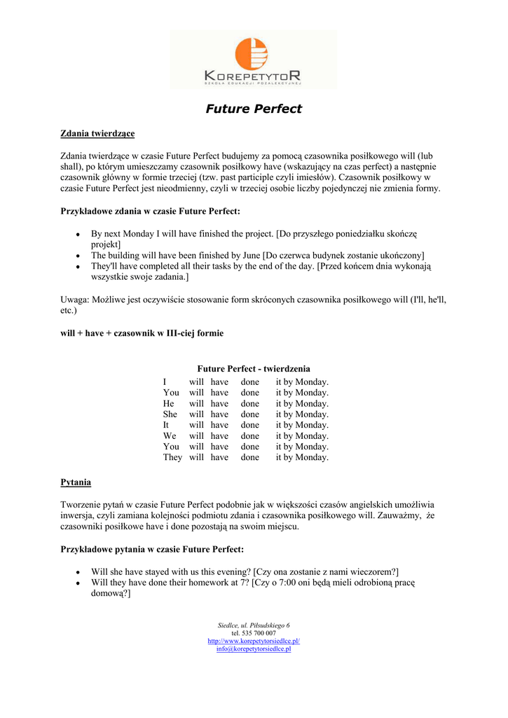 Future Perfect Zdania twierdzące Zdania twierdzące w czasie Future Perfect budujemy za pomocą czasownika posiłkowego will (lub shall), po którym umieszczamy czasownik posiłkowy have (wskazujący na czas perfect) a następnie czasownik główny w formie trzeciej (tzw. past participle czyli imiesłów). Czasownik posiłkowy w czasie Future Perfect jest nieodmienny, czyli w trzeciej osobie liczby pojedynczej nie zmienia formy. Przykładowe zdania w czasie Future Perfect: By next Monday I will have finished the project. [Do przyszłego poniedziałku skończę projekt] The building will have been finished by June [Do czerwca budynek zostanie ukończony] They'll have completed all their tasks by the end of the day. [Przed końcem dnia wykonają wszystkie swoje zadania.] Uwaga: Możliwe jest oczywiście stosowanie form skróconych czasownika posiłkowego will (I'll, he'll, etc.) will + have + czasownik w III-ciej formie Future Perfect - twierdzenia I will have done it by Monday. You will have done it by Monday. He will have done it by Monday. She will have done it by Monday. It will have done it by Monday. We will have done it by Monday. You will have done it by Monday. They will have done it by Monday. Pytania Tworzenie pytań w czasie Future Perfect podobnie jak w większości czasów angielskich umożliwia inwersja, czyli zamiana kolejności podmiotu zdania i czasownika posiłkowego will. Zauważmy, że czasowniki posiłkowe have i done pozostają na swoim miejscu. Przykładowe pytania w czasie Future Perfect: Will she have stayed with us this evening? [Czy ona zostanie z nami wieczorem?] Will they have done their homework at 7? [Czy o 7:00 oni będą mieli odrobioną pracę domową?] Siedlce, ul. Piłsudskiego 6 tel. 535 700 007 http://www.korepetytorsiedlce.pl/ [email protected] Will you have repaired your car tomorrow? [Czy jutro naprawisz swój samochód?] Will + podmiot + have + czasownik w III-ciej formie Will Will Will Will Will Will Will Will Future Perfect - pytania I have done it by Monday? you have done it by Monday? he have done it by Monday? she have done it by Monday? it have done it by Monday? we have done it by Monday? you have done it by Monday? they have done it by Monday? Przeczenia Przeczenia w czasie Future Perfect tworzymy poprzez dodanie wskazującego na negację słowa not po czasowniku posiłkowym will (will not). Bardzo często występuje w języku skrócona forma will not won't. Przykładowe przeczenia w czasie Future Perfect: Construction of the station will not have finished until next year. [Konstrukcja dworca zakończy się dopiero w przyszłym roku] I don't have enough time. I will not have finished this assignment until Friday [Nie mam wystarczająco dużo czasu. Nie skończę tego zadania przed piątkiem.] Will + not + have + czasownik w III-ciej formie I You He She It We You They Future Perfect - przeczenia will not / won't have done will not / won't have done will not / won't have done will not / won't have done will not / won't have done will not / won't have done will not / won't have done will not / won't have done it until Monday. it until Monday. it until Monday. it until Monday. it until Monday. it until Monday. it until Monday. it until Monday. Stosowanie czasu Future Perfect Czas Future Perfect jest stosowany do wyrażania następujących aspektów: 1. Do opisywania wydarzeń i czynności, które zakończą się (lub nie) przed, po lub w określonym momencie przyszłości: Siedlce, ul. Piłsudskiego 6 tel. 535 700 007 http://www.korepetytorsiedlce.pl/ [email protected] I'll have finished this sculpture by the end of the week. [Skończę tę rzeźbę przed końcem tygodnia] She won't have left the building before the dawn. [Nie opuści budynku przed świtem] The work will not be finished until May. [Do maja prace nie zostaną zakończone] 2. Do przewidywania zdarzeń teraźniejszych: It's no use calling her - she will have finished her work by now. [Nie ma sensu do niej dzwonić, o tej porze powinna już skończyć pracę.] - Nie jesteśmy pewni czy rzeczywiście już skończyła ale przewidujemy, że tak jest. Let's go, I think the plane will have landed by now. [Chodźmy, samolot powinien już wylądować]. Uwagi i wyjątki Czas Future Perfect skupia się przede wszystkim na aspekcie zakończenia danej czynności i określeniu chwili jej zakończenia, natomiast nie podkreśla on w żaden sposób ciągłości danego wydarzenia w czasie. Gdy chcemy podkreślić jak długo będzie trwała jakaś czynność w przyszłości stosujemy czas Future Perfect Continuous, który omówiony zostanie w następnym pliku. Uwaga: Zwróć uwagę na różnicę pomiędzy użyciem przyimków until oraz by w zdaniach w czasie Future Perfect. Przyimek by oznacza [nie później niż] i jest używany w zdaniach twierdzących. Przykładowo: I'll have finished it by 6:00 o'clock [Skończę to nie później niż przed 6-tą] - czyli skończę to o 6-tej lub wcześniej. Z kolei przyimek until (lub till) oznacza [nie wcześniej niż]. Przykładowo: I won't have finished it until 6:00. [Nie skończę tego wcześniej niż o 6:00] - czyli skończę to o 6:00 lub później. Przyimka until (till) używamy tylko w zdaniach przeczących. Zatem zdanie I'll have finished it until 6:00 jest nieprawidłowe. Siedlce, ul. Piłsudskiego 6 tel. 535 700 007 http://www.korepetytorsiedlce.pl/ [email protected]