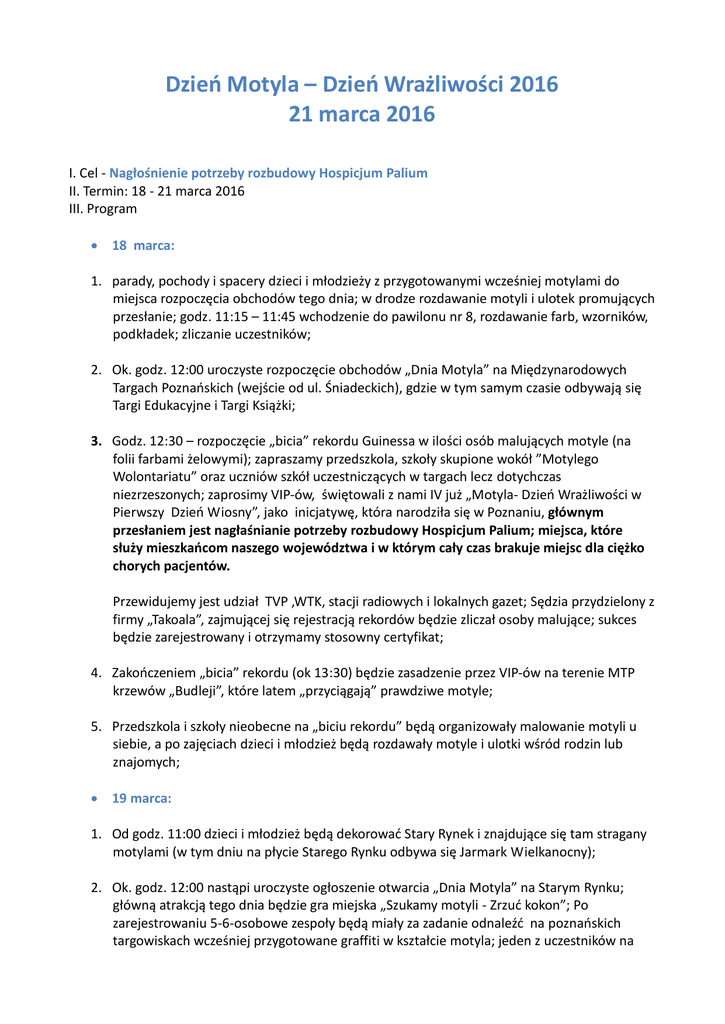 Dzień Motyla – Dzień Wrażliwości 2016 21 marca 2016 I. Cel - Nagłośnienie potrzeby rozbudowy Hospicjum Palium II. Termin: 18 - 21 marca 2016 III. Program 18 marca: 1. parady, pochody i spacery dzieci i młodzieży z przygotowanymi wcześniej motylami do miejsca rozpoczęcia obchodów tego dnia; w drodze rozdawanie motyli i ulotek promujących przesłanie; godz. 11:15 – 11:45 wchodzenie do pawilonu nr 8, rozdawanie farb, wzorników, podkładek; zliczanie uczestników; 2. Ok. godz. 12:00 uroczyste rozpoczęcie obchodów „Dnia Motyla” na Międzynarodowych Targach Poznańskich (wejście od ul. Śniadeckich), gdzie w tym samym czasie odbywają się Targi Edukacyjne i Targi Książki; 3. Godz. 12:30 – rozpoczęcie „bicia” rekordu Guinessa w ilości osób malujących motyle (na folii farbami żelowymi); zapraszamy przedszkola, szkoły skupione wokół ”Motylego Wolontariatu” oraz uczniów szkół uczestniczących w targach lecz dotychczas niezrzeszonych; zaprosimy VIP-ów, świętowali z nami IV już „Motyla- Dzień Wrażliwości w Pierwszy Dzień Wiosny”, jako inicjatywę, która narodziła się w Poznaniu, głównym przesłaniem jest nagłaśnianie potrzeby rozbudowy Hospicjum Palium; miejsca, które służy mieszkańcom naszego województwa i w którym cały czas brakuje miejsc dla ciężko chorych pacjentów. Przewidujemy jest udział TVP ,WTK, stacji radiowych i lokalnych gazet; Sędzia przydzielony z firmy „Takoala”, zajmującej się rejestracją rekordów będzie zliczał osoby malujące; sukces będzie zarejestrowany i otrzymamy stosowny certyfikat; 4. Zakończeniem „bicia” rekordu (ok 13:30) będzie zasadzenie przez VIP-ów na terenie MTP krzewów „Budleji”, które latem „przyciągają” prawdziwe motyle; 5. Przedszkola i szkoły nieobecne na „biciu rekordu” będą organizowały malowanie motyli u siebie, a po zajęciach dzieci i młodzież będą rozdawały motyle i ulotki wśród rodzin lub znajomych; 19 marca: 1. Od godz. 11:00 dzieci i młodzież będą dekorować Stary Rynek i znajdujące się tam stragany motylami (w tym dniu na płycie Starego Rynku odbywa się Jarmark Wielkanocny); 2. Ok. godz. 12:00 nastąpi uroczyste ogłoszenie otwarcia „Dnia Motyla” na Starym Rynku; główną atrakcją tego dnia będzie gra miejska „Szukamy motyli - Zrzuć kokon”; Po zarejestrowaniu 5-6-osobowe zespoły będą miały za zadanie odnaleźć na poznańskich targowiskach wcześniej przygotowane graffiti w kształcie motyla; jeden z uczestników na dowód odnalezienia musi zrobić sobie na jego tle zdjęcie; w trakcie gry rozdajemy motyle i informujemy przechodniów o celu naszego działania; po przejściu całej trasy zgłaszają się na Stary Rynek, gdzie czeka nagroda; 3. Zakończenie wydarzenia ok. godz. 15:00. 21 marca: 1. Do południa pogadanki w szkołach nt. wrażliwości, pomagania osobom chorym, szans i możliwości, jakie daje wolontariat; „Dzień Motyla”- co i dlaczego? ( można jeszcze zapraszać wolontariuszy z Hospicjum na takie spotkania); 2. Godz. 18:00 w CK Zamek „Bajkowisko” - impreza charytatywna organizowana po raz trzeci dla Hospicjum Palium przez Lions Club New Design a przeznaczona dla dzieci z różnych środowisk, m.in. domów dziecka, dla dzieci będących pod opieką Hospicjum, dla dzieci z zespołem Downa, itd.; wyjątkowe wydarzenie przyciągające tłumy młodych i starszych Poznaniaków (to również promocja czytelnictwa). IV. Organizator: Polskie Towarzystwo Opieki Paliatywnej Oddział w Poznaniu V. Współorganizatorzy: „Targowiska” Spółka z o.o. i Międzynarodowe Targi Poznańskie Uwaga: Zeszłoroczna edycja „Dnia Motyla” poświęcona nagłośnieniu potrzeby wsparcia dzieci osieroconych przyniosła efekty w postaci m.in. konferencji organizowanej przez Kuratorium i Polskie Towarzystwo Opieki Paliatywnej Oddział w Poznaniu pod nazwą „Jak pomóc dziecku po stracie bliskiej osoby?”. Pomogła także stworzyć w Hospicjum specjalny pokój, służący do prowadzenia terapii z tymi dziećmi oraz przygotować program psychoterapeutyczny i program rozwoju kreatywności dla dzieci po stracie bliskiej osoby, które już w kwietniu będą realizowane właśnie w tym nowym miejscu. Opracowała: Barbara Grochal- koordynator wolontariuszy Hospicjum Palium
