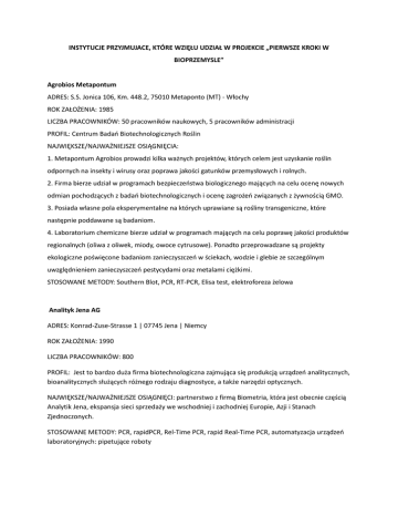 INSTYTUCJE PRZYJMUJACE, KTÓRE WZIĘŁU UDZIAŁ W PROJEKCIE „PIERWSZE KROKI W BIOPRZEMYSLE” Agrobios Metapontum ADRES: S.S. Jonica 106, Km. 448.2, 75010 Metaponto (MT) - Włochy ROK ZAŁOŻENIA: 1985 LICZBA PRACOWNIKÓW: 50 pracowników naukowych, 5 pracowników administracji PROFIL: Centrum Badao Biotechnologicznych Roślin NAJWIĘKSZE/NAJWAŻNIEJSZE OSIĄGNIĘCIA: 1. Metapontum Agrobios prowadzi kilka ważnych projektów, których celem jest uzyskanie roślin odpornych na insekty i wirusy oraz poprawa jakości gatunków przemysłowych i rolnych. 2. Firma bierze udział w programach bezpieczeostwa biologicznego mających na celu ocenę nowych odmian pochodzących z badao biotechnologicznych i ocenę zagrożeo związanych z żywnością GMO. 3. Posiada własne pola eksperymentalne na których uprawiane są rośliny transgeniczne, które następnie poddawane są badaniom. 4. Laboratorium chemiczne bierze udział w programach mających na celu poprawę jakości produktów regionalnych (oliwa z oliwek, miody, owoce cytrusowe). Ponadto przeprowadzane są projekty ekologiczne poświęcone badaniom zanieczyszczeo w ściekach, wodzie i glebie ze szczególnym uwzględnieniem zanieczyszczeo pestycydami oraz metalami ciężkimi. STOSOWANE METODY: Southern Blot, PCR, RT-PCR, Elisa test, elektroforeza żelowa Analityk Jena AG ADRES: Konrad-Zuse-Strasse 1 | 07745 Jena | Niemcy ROK ZAŁOŻENIA: 1990 LICZBA PRACOWNIKÓW: 800 PROFIL: Jest to bardzo duża firma biotechnologiczna zajmująca się produkcją urządzeo analitycznych, bioanalitycznych służących różnego rodzaju diagnostyce, a także narzędzi optycznych. NAJWIĘKSZE/NAJWAŻNIEJSZE OSIĄGNIĘCI: partnerstwo z firmą Biometria, która jest obecnie częścią Analytik Jena, ekspansja sieci sprzedaży we wschodniej i zachodniej Europie, Azji i Stanach Zjednoczonych. STOSOWANE METODY: PCR, rapidPCR, Rel-Time PCR, rapid Real-Time PCR, automatyzacja urządzeo laboratoryjnych: pipetujące roboty Antitop Limited ADRES: Babraham Research Campus, Babraham, Cambridge CB22 3AT, United Kingdom ROK ZAŁOŻENIA: 2004 LICZBA PRACOWNIKÓW: około 20 PROFIL: Antitope Limited (‘Antitope’) jest firmą biotechnologiczną. Zajmuje sie humanizacja przeciwciał i testami immunologicznymi. Historia firmy zaczęła się już w późnych latach osiemdziesiątych dwudziestego wieku, poprzez współprace, jej przyszłych założycieli, z wynalazcą technologii humanizacji przeciwciał Sir Greg Winter. Obecnie Antitope połączyła humanizację przeciwciał i ich deimmunizację, tworząc w ten sposób Composite Human Antibody™ technology. Technologia ta pozwala na produkcje całkowicie zhumanizowanych przeciwciał pozbawionych immunogenności w stosunku do organizmu człowieka. Applied Enzyme Technology ltd. ADRES: Monmouth House, Mamhilad Park, Pontypool, Torfaen NP4 OHZ United Kingdom ROK ZAŁOŻENIA: 1994 LICZBA PRACOWNIKÓW: 5 PROFIL: firma biotechnologiczna NAJWIĘKSZE/NAJWAŻNIEJSZE OSIĄGNIĘCI: http://www.gwent.org/Aet/index.html STOSOWANE METODY (W SKRÓCIE): Liofilizacja enzymów, spektrofotomeria, luminometria, chromatografia kolumnowa, elektroforeza białek. Applied Enzyme Technology ltd. została założona w 1994 roku. W 2001 r. AET ltd. zostało zakupione przez wiodącą firmę produkującą biosensory Gwent Electronic Materials ltd. Obecnie obie te spółki podobnie jak Gwent Biotechnology Systems ltd., Gwent Sensors ltd. oraz LRH ltd. wchodzą w skład dynamicznie rozwijającej się Gwent Groupe zlokalizowanej w Mamhilad Park w Pontypoolu. AET ltd. jest zaangażowana w eksploatacje białek w przedsiębiorstwie, a w szczególności enzymów w szerokim zakresie ich zastosowania. Enzymy, przeciwciała oraz farmaceutyczne białka są stabilizowane poprzez termiczną, chemiczną oraz proteolityczną degradację dzięki czemu znajdują zastosowane w szeregu produktach takich jak biosensory, kremy, kity diagnostyczne, środki sterylizujące czy środki piorące. Areta International S. r. l ADRES: via Roberto Lepetit 34, 21040 Gerenzano(VA), Włochy ROK ZAŁOŻENIA: 1999 LICZBA PRACOWNIKÓW: 30 PROFIL: produkcja przeciwciał i białek rekombinowanych NAJWIĘKSZE/NAJWAŻNIEJSZE OSIĄGNIĘCIA: produkcja przeciwciał monoklonalnych przeciwko nietypowym antygenom: białka otoczki wirusa HIV oraz białka związane z chorobą Alzheimer’ a STOSOWANE METODY: produkcja przeciwciał monoklonalnych z wykorzystaniem komórek hybrydoma; produkcja białek rekombinowanych w E. coli oraz w komórkach ssaczych; oczyszczanie produktów białkowych z użyciem różnych metod chromatografii: IEX, HIC, RPC, GF, AC; techniki detekcji białek: Western blot, Dot blot, SDS- PAGE, BCA test, test ELISA: bezpośredni, pośredni, sandwich; projekty związane z medycyną regeneracyjną: izolacja komórek macierzystych oraz trójwymiarowe hodowle komórkowe CIC bioGUNE ADRES: Parque Tecnológico de Bizkaia Ed. 801A, 48160 Derio (Bizkaia) ROK ZAŁOŻENIA: ufundowane w 2002, otwarte w styczniu 2005 LICZBA PRACOWNIKÓW: 22 pracowników naukowych, ponad 85 postdoc-ów, pracowników technicznych i inżynierów, dodatkowo rokrocznie przyjmowanych jest ponad 20 doktorantów PROFIL: Organizacja non-profit prowadząca badania z zakresu biomedycyny NAJWIĘKSZE/NAJWAŻNIEJSZE OSIĄGNIĘCIA: dwa patenty , około 45 naukowych publikacji (dane z 2009) STOSOWANE METODY: NMR, mikroskopia elektronowa, krystalografia, dichroizm kołowy, dyfrakcja promieni X, cystometria przepływowa oraz liczne metody z zakresu genetyki i biologii molekularnej (klonowanie, różne rodzaje reakcji PCR, Western blotting, transfekcja itp.), hodowla komórek Fraunhofer Institute for Interfacial Engineering and Biotechnology IGB ADRES: Nobelstrasse 12, 70569 Stuttgart, Niemcy ROK ZAŁOŻENIA: 2008 PROFIL: Instytut naukowy wykonujący badania w zakresie biotechnologii. METDOY: szereg metod stosowanych w biotechnologii i biologii. ImmunoBiology Limited ADRES: Babraham Research Campus, Babraham, Cambridge CB22 3AT, Unite