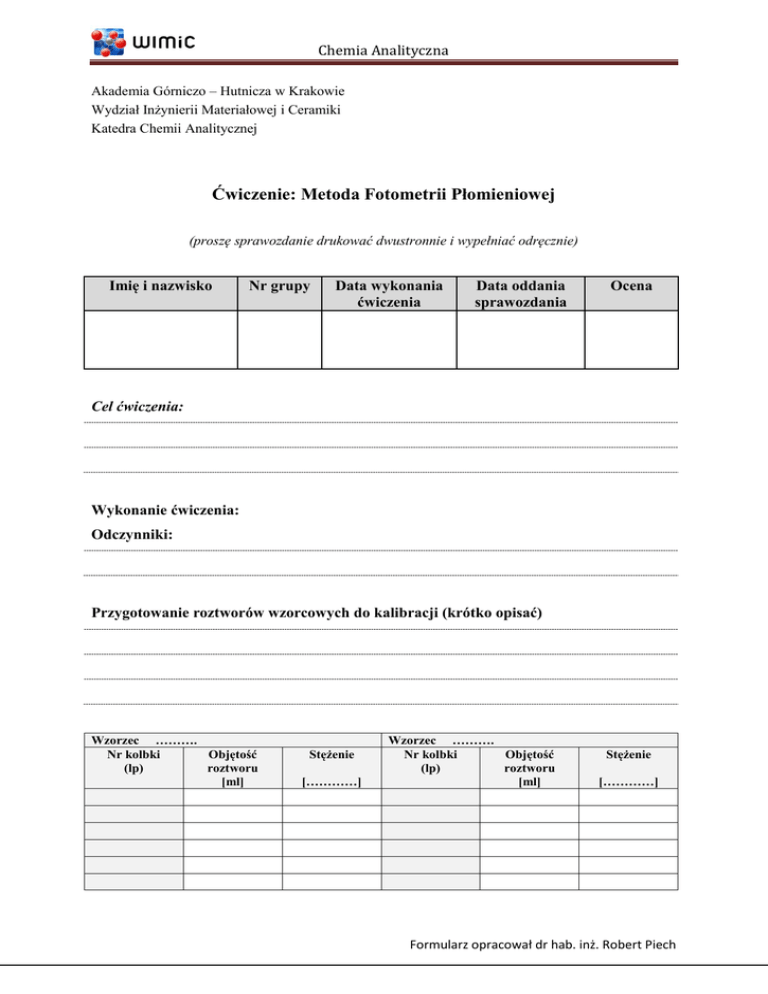 Chemia Analityczna Akademia Górniczo – Hutnicza w Krakowie Wydział Inżynierii Materiałowej i Ceramiki Katedra Chemii Analitycznej Ćwiczenie: Metoda Fotometrii Płomieniowej (proszę sprawozdanie drukować dwustronnie i wypełniać odręcznie) Imię i nazwisko Nr grupy Data wykonania ćwiczenia Data oddania sprawozdania Ocena Cel ćwiczenia: Wykonanie ćwiczenia: Odczynniki: Przygotowanie roztworów wzorcowych do kalibracji (krótko opisać) Wzorzec ………. Nr kolbki Objętość (lp) roztworu [ml] Stężenie […………] Wzorzec ………. Nr kolbki Objętość (lp) roztworu [ml] Stężenie […………] Formularz opracował dr hab. inż. Robert Piech Chemia Analityczna Aparatura: Przygotowanie fotometru płomieniowego do pracy: (gazy, filtry, płomień, zerowanie itp.) Pomiar Kalibracja Nr kolbki Pierwiastek………. Stężenie Emisja Nr kolbki Pierwiastek………. Stężenie Emisja (lp) [……….] [……….] (lp) [……….] [……….] Analiza kalibracji (wykresy – do wykonania na podstawie pomiarów, interpretacja): Formularz opracował dr hab. inż. Robert Piech Chemia Analityczna Próbki naturalne: Oznaczany pierwiastek………. L.p. Analizowana próbka Emisja [……….] Wynik oznaczenia, (jednostka) Oznaczany pierwiastek………. L.p. Analizowana próbka Emisja [……….] Wynik oznaczenia, (jednostka) Wnioski: Formularz opracował dr hab. inż. Robert Piech