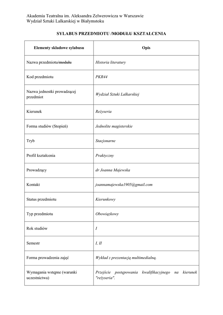 Akademia Teatralna im. Aleksandra Zelwerowicza w Warszawie Wydział Sztuki Lalkarskiej w Białymstoku SYLABUS PRZEDMIOTU /MODUŁU KSZTAŁCENIA Elementy składowe sylabusu Opis Nazwa przedmiotu/modułu Historia literatury Kod przedmiotu PKR44 Nazwa jednostki prowadzącej przedmiot Wydział Sztuki Lalkarskiej Kierunek Reżyseria Forma studiów (Stopień) Jednolite magisterskie Tryb Stacjonarne Profil kształcenia Praktyczny Prowadzący dr Joanna Majewska Kontakt [email protected] Status przedmiotu Kierunkowy Typ przedmiotu Obowiązkowy Rok studiów I Semestr I, II Forma prowadzenia zajęć Wykład z prezentacją multimedialną. Wymagania wstępne (warunki uczestnictwa) Przejście postępowania "reżyseria". kwalifikacyjnego na kierunek Akademia Teatralna im. Aleksandra Zelwerowicza w Warszawie Wydział Sztuki Lalkarskiej w Białymstoku Cele przedmiotu/modułu Treści kształcenia Zapoznanie studentów z najwybitniejszymi twórcami literackimi. Zapoznanie studentów z przykładowymi tekstami literackimi z różnych epok w szerokich kontekstach kulturowych (np. idee filozoficzne, plastyka, muzyka, teatr, film). Udoskonalenie umiejętności interpretacji tekstów literackich z różnych epok z wykorzystaniem rożnych technik interpretacyjnych. Doskonalenie umiejętności mówienia o literaturze. Zajęcia obejmują kurs historii literatury od czasów starożytnych do współczesności. W ich trakcie zostaną zaprezentowani najważniejsi twórcy literaccy i ich dzieła, usytuowane w kontekście szerokiego tła kulturowego. Podczas zajęć będą stosowane różne metodologie interpretacyjne. Teksty literackie będą ujmowane zarówno w sposób diachroniczny, jak i synchroniczny – by wykazać ideową ciągłość między przeszłością a współczesnością. Semestr I 1. Starożytne korzenie literatury – epika i liryka. 2. Starożytne korzenie literatury – dramat grecki i rzymski. 3. Średniowieczny obraz świata w literaturze. 4. Narodziny nowoczesnej literatury europejskiej – renesans. 5. Barok – literatura i sztuka totalna. 6. Teatr elżbietański – Szekspir i inni. 7. Złoty Wiek literatury hiszpańskiej. 8. Wielkie stulecie francuskiego klasycyzmu. 9. Narodziny powieści z ducha oświecenia. 10. Narodziny teatru z ducha oświecenia. 11. Północne korzenie romantyzmu – Niemcy i Anglia. 12. Romantyzm francuski i rosyjski. 13. Literatura stulecia nauki – powieść realistyczna i naturalistyczna we Francji i Anglii. 14. Wielka powieść rosyjska XIX wieku. 15. Realizm i naturalizm w teatrze – od Ibsena do Czechowa. Semestr II 1. Modernistyczna rewolucja w poezji. 2. Modernistyczna rewolucja w powieści. 3. W kręgu modernistycznej fantastyki. 4. Modernistyczne eksperymenty w teatrze. 5. Przemiany modernistycznej powieści w I połowie XX wieku – cz. 1. 6. Przemiany modernistycznej powieści w I połowie XX wieku – cz. 2. 7. Utopie i antyutopie. 8. Modernistyczne gry z literaturą – poezja i proza. Akademia Teatralna im. Aleksandra Zelwerowicza w Warszawie Wydział Sztuki Lalkarskiej w Białymstoku 9. Egzystencjalizm w literaturze – proza i dramat. 10. Literatura zza oceanu – Amerykanie i Iberoamerykanie. 11. Teatr absurdu. 12. Czas buntu – beatnicy i inni. 13. Gry i zabawy z literaturą – OuLiPo. 14. Literatura wyczerpania – postmodernizm. 15. Literatura XXI wieku. W zakresie wiedzy (W) student: opisuje najważniejsze zjawiska literackie z rożnych epok (R_W2). rozróżnia i porównuje teksty literackie z różnych epok oraz ich style i konwencje (R_W11). identyfikuje zawarte w tekście właściwe konteksty interpretacyjne (R_W3). W zakresie umiejętności (U) student: Efekty kształcenia analizuje teksty z różnych epok we właściwych kontekstach historycznych, ideowych i estetycznych (R_U2). wykorzystuje różne techniki interpretacyjne (R_U9). weryfikuje hipotezy interpretacyjne (R_U4). W zakresie kompetencji społecznych (K) student: współdziała z grupą w rozwiązywaniu problemów interpretacyjnych (R_K6). krytykuje niepełne lub nieprawdziwe rozwiązania (R_K1). Forma zaliczenia przedmiotu I sem. - Zaliczenie II sem. - Zaliczenie z oceną Sposoby weryfikacji Egzamin pisemny: testowy, z pytaniami otwartymi i zamkniętymi. Liczba godzin zajęć dydaktycznych I sem. – 30 godz. II sem. – 30 godz. Liczba punktów ECTS 2 pkt Język wykładowy polski 1. Wykaz literatury podstawowej Homer, Iliada i Odyseja Hezjod, Prace i dnie Wergiliusz, Eneida Owidiusz, Metamorfozy Antologia liryki greckiej Akademia Teatralna im. Aleksandra Zelwerowicza w Warszawie Wydział Sztuki Lalkarskiej w Białymstoku Antologia liryki rzymskiej Ajschylos, Sofokles, Eurypides, Seneka, wybrane tragedie Arystofanes, Plaut, wybrane komedie 3. Arcydzieła francuskiego średniowiecza (Ch. de Troyes. Maria z Francji, F. Villon) Dante Alighieri, Boska komedia, Vita nuova Kwiatki św. Franciszka z Asyżu J. de Voragine, Złota legenda Gra o Adamie Historia o chwalebnym Zmartwychwstaniu Pańskim Mistrz Pathelin 4. F. Petrarca, Sonety G. Boccaccio, Dekameron G. Pico della Mirandola, Mowa o godności człowieka L. Ariosto, Orland szalony T. Tasso, Jerozolima wyzwolona N. Machiavelli, Książę F. Rabelais, Gargantua i Pantagruel M. de Montaigne, Próby T. Morus, Utopia 5. Antologia angielskiej poezji metafizycznej XVII stulecia Wysoki umysł w dolnych rzeczach zawikłany. Antologia polskiej poezji metafizycznej G. Marino, Adon 6. Ch. Marlowe, Tragiczne dzieje doktora Fausta W. Szekspir, wybrane dramaty, Sonety 7. M. de Cervantes, Don Kichote Lope de Vega, Owcze źródło P. Calderón de la Barca, Życie jest snem 8. P. Corneille, Cyd Molier, wybrane komedieJ. Racine, Fedra 9. J. Swift, Podróże Guliwera D. Defoe, Dziennik roku zarazy L. Sterne, Życie i myśli imć Pana Tristrama Shandy, Podroż sentymentalna Wolter, Zadig, Mikromegas D. Diderot, Kuzynek mistrza Rameau, Kubuś Fatalista J.-J. Rousseau, Nowa Heloiza D. A. F. de Sade, Justyna czyli niedole cnoty J. Potocki, Rękopis znalezi