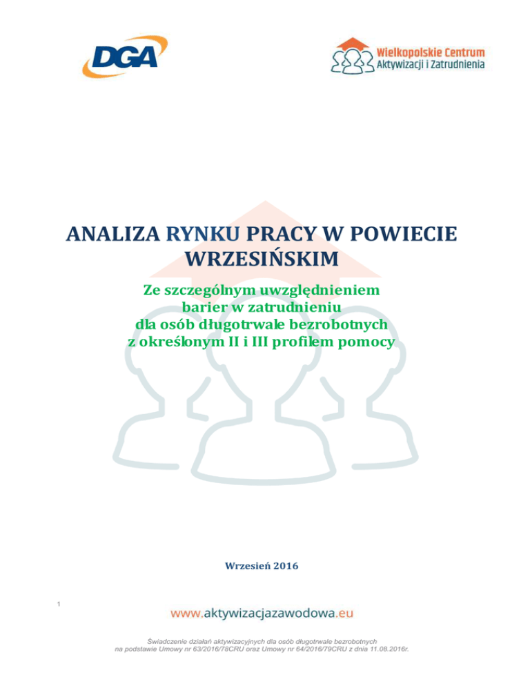 ANALIZA RYNKU PRACY W POWIECIE WRZESIŃSKIM Ze szczególnym uwzględnieniem barier w zatrudnieniu dla osób długotrwale bezrobotnych z określonym II i III profilem pomocy Wrzesień 2016 1 Świadczenie działań aktywizacyjnych dla osób długotrwale bezrobotnych na podstawie Umowy nr 63/2016/78CRU oraz Umowy nr 64/2016/79CRU z dnia 11.08.2016r. SPIS TREŚCI WPROWADZENIE ................................................................................................................................. 3 CHARAKTERYSTYKA POWIATU WRZESIŃSKIEGO ................................................................... 4 POŁOŻENIE ........................................................................................................................................................... 4 POWIERZCHNIA ................................................................................................................................................... 5 DEMOGRAFIA ....................................................................................................................................................... 5 CHARAKTERYSTYKA RYNKU PRACY POWIATU WRZESIŃSKIEGO ...................................... 7 POZIOM I DYNAMIKA BEZROBOCIA ..................................................................................................................... 9 ZAWODY DEFICYTOWE I NADWYŻKOWE ................................................................................. 12 PROFILOWANIE POMOCY ............................................................................................................... 13 IDENTYFIKACJA BARIER OSÓB DŁUGOTRWALE BEZROBOTNYCH................................................................... 17 PODSUMOWANIE .............................................................................................................................. 19 2 Świadczenie działań aktywizacyjnych dla osób długotrwale bezrobotnych na podstawie Umowy nr 63/2016/78CRU oraz Umowy nr 64/2016/79CRU z dnia 11.08.2016r. WPROWADZENIE Współczesny rynek pracy – z perspektywy osób poszukujących zatrudnienia – charakteryzuje się zmiennością, dynamiką i coraz to wyższymi wymaganiami. Ten stan rzeczy prowadzi do sytuacji, w której odniesienie sukcesu zawodowego w coraz większym stopniu zależy od zdolności przystosowywania się pracownika do zmieniającego się rynku pracy, gotowości na przeorientowanie postaw wobec samokształcenia, nabywania kolejnych doświadczeń, niejednokrotnie w wąskich specjalizacjach. Rynek pracy wręcz wymusza zindywidualizowanie ścieżek edukacyjnych i zawodowych, to z kolei wysoką świadomość własnych kwalifikacji, kompetencji i konkurencyjności. W takich warunkach problemy i bariery w podjęciu zatrudnienia dotykają osób znajdujących się w szczególnej sytuacji na rynku pracy, zwłaszcza osoby z określonym II i III profilem pomocy. To, kim są te osoby, z jakich powodów i jak długo utrzymują status bezrobotnych to cenne informacje o tendencjach na współczesnym rynku pracy. Wiedza ta ma bezpośredni wpływ na decyzje o kierunkach działań profilaktycznych i naprawczych, jakie powinny być podejmowane w stosunku do poszczególnych grup osób bezrobotnych. W związku z powyższym, celem opracowania było udzielenie odpowiedzi na pytanie o bariery, na jakie napotykają długotrwale bezrobotni z określonym II i III profilem pomocy na rynku pracy oraz o najbardziej efektywne działania na rzecz tej kategorii osób pozwalające na ich integrację zawodową i społeczną. Opracowanie powstało w ramach Projektu: Wielkopolskie Centrum Aktywizacji i Zatrudnienia, realizowanego przez DGA S.A na zlecenie: Wojewódzkiego Urzędu Pracy w Poznaniu (Świadczenie działań aktywizacyjnych dla osób długotrwale bezrobotnych na podstawie Umowy nr 63/2016/78CRU oraz Umowy nr 64/2016/79CRU z dnia 11.08.2016r.) 3 Świadczenie działań aktywizacyjnych dla osób długotrwale bezrobotnych na podstawie Umowy nr 63/2016/78CRU oraz Umowy nr 64/2016/79CRU z dnia 11.08.2016r. CHARAKTERYSTYKA POWIATU WRZESIŃSKIEGO Położenie Powiat wrzesiński położony jest w centralnej części województwa wielkopolskiego. Znajduje się w odległości ok. 50 km od Poznania, który stanowi stolicę województwa, a ponadto ważny ośrodek gospodarczy, edukacyjny i administracyjny. Powiat wrzesiński swoim zasięgiem obejmuje 5 gmin, w tym cztery gminy o charakterze miejskowiejskim (Miłosław, Nekla, Pyzdry i Września) oraz jedną gminę wiejską (Kołaczkowo). Gmina Września jest położona ok. 50 km na wschód od Poznania nad rzeką Wrześnicą. Gmina zajmuje powierzchnię 222 km2, a zamieszkiwana jest przez 45 547 osób, co sprawia, że ma najwyższą gęstość zaludnienia wśród gmin powiatu wrzesińskiego (205 os./km2). Gmina Września podzielona jest na 33 sołectwa. Stanowi ważny węzeł komunikacji drogowej i kolejowej. Znajduje się przy autostradzie A2 na odcinku Poznań – Warszawa. Gmina Nekla obejmuje obszar 96 km2, zamieszkiwana jest przez 7 264 osoby. Gęstość zaludnienia wynosi 76 os./km2. Gmina Nekla podzielona jest na 16 sołectw. Gmina Miłosław obejmuje obszar 132 km2, zamieszkiwana jest przez 10 350 osób. Gęstość zaludnienia wynosi 78 os./km2. Gmina Miłosław podzielona jest na 16 sołectw. Gmina Kołaczkowo obejmuje obszar 116 km2, zamieszkiwana jest przez 6 102 osoby. Gęstość zaludnienia wynosi 53 os./km2. Gmina Kołaczkowo podzielona jest na 17 sołectw. Gmina Pyzdry zajmuje powierzchnię 138 km2, zamieszkiwana jest przez 7 218 osób, przez co charakteryzuje się najniższą gęstością zaludnienia (52 os./km2). Gmina Pyzdry podzielona jest na 20 sołectw.1 1 Strategia Rozwiązywania Problemów Społecznych w Powiecie Wrzesińskim m lata 2016 - 2020 4 Świadczenie działań aktywizacyjnych dla osób długotrwale bezrobotnych na podstawie Umowy nr 63/2016/78CRU oraz Umowy nr 64/2016/79CRU z dnia 11.08.2016r. Powierzchnia Powiat wrzesiński zajmuje powi