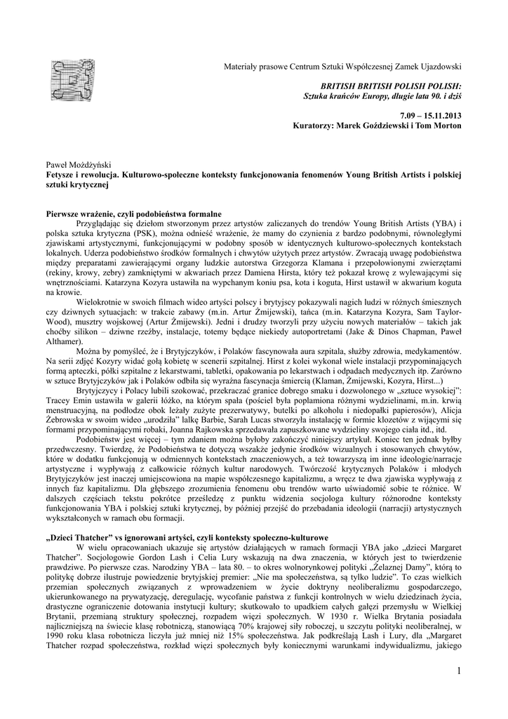 Materiały prasowe Centrum Sztuki Współczesnej Zamek Ujazdowski BRITISH BRITISH POLISH POLISH: Sztuka krańców Europy, długie lata 90. i dziś 7.09 – 15.11.2013 Kuratorzy: Marek Goździewski i Tom Morton Paweł Możdżyński Fetysze i rewolucja. Kulturowo-społeczne konteksty funkcjonowania fenomenów Young British Artists i polskiej sztuki krytycznej Pierwsze wrażenie, czyli podobieństwa formalne Przyglądając się dziełom stworzonym przez artystów zaliczanych do trendów Young British Artists (YBA) i polska sztuka krytyczna (PSK), można odnieść wrażenie, że mamy do czynienia z bardzo podobnymi, równoległymi zjawiskami artystycznymi, funkcjonującymi w podobny sposób w identycznych kulturowo-społecznych kontekstach lokalnych. Uderza podobieństwo środków formalnych i chwytów użytych przez artystów. Zwracają uwagę podobieństwa między preparatami zawierającymi organy ludzkie autorstwa Grzegorza Klamana i przepołowionymi zwierzętami (rekiny, krowy, zebry) zamkniętymi w akwariach przez Damiena Hirsta, który też pokazał krowę z wylewającymi się wnętrznościami. Katarzyna Kozyra ustawiła na wypchanym koniu psa, kota i koguta, Hirst ustawił w akwarium koguta na krowie. Wielokrotnie w swoich filmach wideo artyści polscy i brytyjscy pokazywali nagich ludzi w różnych śmiesznych czy dziwnych sytuacjach: w trakcie zabawy (m.in. Artur Żmijewski), tańca (m.in. Katarzyna Kozyra, Sam TaylorWood), musztry wojskowej (Artur Żmijewski). Jedni i drudzy tworzyli przy użyciu nowych materiałów – takich jak choćby silikon – dziwne rzeźby, instalacje, totemy będące niekiedy autoportretami (Jake & Dinos Chapman, Paweł Althamer). Można by pomyśleć, że i Brytyjczyków, i Polaków fascynowała aura szpitala, służby zdrowia, medykamentów. Na serii zdjęć Kozyry widać gołą kobietę w scenerii szpitalnej. Hirst z kolei wykonał wiele instalacji przypominających formą apteczki, półki szpitalne z lekarstwami, tabletki, opakowania po lekarstwach i odpadach medycznych itp. Zarówno w sztuce Brytyjczyków jak i Polaków odbiła się wyraźna fascynacja śmiercią (Klaman, Żmijewski, Kozyra, Hirst...) Brytyjczycy i Polacy lubili szokować, przekraczać granice dobrego smaku i dozwolonego w „sztuce wysokiej”: Tracey Emin ustawiła w galerii łóżko, na którym spała (pościel była poplamiona różnymi wydzielinami, m.in. krwią menstruacyjną, na podłodze obok leżały zużyte prezerwatywy, butelki po alkoholu i niedopałki papierosów), Alicja Żebrowska w swoim wideo „urodziła” lalkę Barbie, Sarah Lucas stworzyła instalację w formie klozetów z wijącymi się formami przypominającymi robaki, Joanna Rajkowska sprzedawała zapuszkowane wydzieliny swojego ciała itd., itd. Podobieństw jest więcej – tym zdaniem można byłoby zakończyć niniejszy artykuł. Koniec ten jednak byłby przedwczesny. Twierdzę, że Podobieństwa te dotyczą wszakże jedynie środków wizualnych i stosowanych chwytów, które w dodatku funkcjonują w odmiennych kontekstach znaczeniowych, a też towarzyszą im inne ideologie/narracje artystyczne i wypływają z całkowicie różnych kultur narodowych. Twórczość krytycznych Polaków i młodych Brytyjczyków jest inaczej umiejscowiona na mapie współczesnego kapitalizmu, a wręcz te dwa zjawiska wypływają z innych faz kapitalizmu. Dla głębszego zrozumienia fenomenu obu trendów warto uświadomić sobie te różnice. W dalszych częściach tekstu pokrótce prześledzę z punktu widzenia socjologa kultury różnorodne konteksty funkcjonowania YBA i polskiej sztuki krytycznej, by później przejść do przebadania ideologii (narracji) artystycznych wykształconych w ramach obu formacji. „Dzieci Thatcher” vs ignorowani artyści, czyli konteksty społeczno-kulturowe W wielu opracowaniach ukazuje się artystów działających w ramach formacji YBA jako „dzieci Margaret Thatcher”. Socjologowie Gordon Lash i Celia Lury wskazują na dwa znaczenia, w których jest to twierdzenie prawdziwe. Po pierwsze czas. Narodziny YBA – lata 80. – to okres wolnorynkowej polityki „Żelaznej Damy”, którą to politykę dobrze ilustruje powiedzenie brytyjskiej premier: „Nie ma społeczeństwa, są tylko ludzie”. To czas wielkich przemian społecznych związanych z wprowadzeniem w życie doktryny neoliberalizmu gospodarczego, ukierunkowanego na prywatyzację, deregulację, wycofanie państwa z funkcji kontrolnych w wielu dziedzinach życia, drastyczne ograniczenie dotowania instytucji kultury; skutkowało to upadkiem całych gałęzi przemysłu w Wielkiej Brytanii, przemianą struktury społecznej, rozpadem więzi społecznych. W 1930 r. Wielka Brytania posiadała najliczniejszą na świecie klasę robotniczą, stanowiącą 70% krajowej siły roboczej, u szczytu polityki neoliberalnej, w 1990 roku klasa robotnicza liczyła już mniej niż 15% społeczeństwa. Jak podkreślają Lash i Lury, dla „Margaret Thatcher rozpad społeczeństwa, rozkład więzi społecznych były koniecznymi warunkami indywidualizmu, jakiego 1 wymagała jej idea przedsiębiorczości”. Rozwijające się w tym okresie YBA było „zafascynowane dekompozycją społecznych (i politycznych) wartości jako procesem samym w sobie”. Z drugiej strony, działalność twórców zaliczanych do tego trendu, prowadzona poza oficjalnymi, skostniałymi i nierzadko dotowanymi przez państwo w poprzednim okresie instytucjami artworldu, wpisała się w tendencje rewitalizacji przestrzeni społecznej z użyciem sztuki jako „narzędzia rewitalizacji” po upadającym przemyśle (Lash, Lury 2011: 106-108). Rewitalizacja odznaczyła się w planie miast i zarazem była narzędziem gentryfikacji, brutalnej przemiany tkanki miejskiej, dekompozycji składu mieszkańców, co było wynikiem m.in. upadku przemysłu portowego. YBA ze swoistą postpunkową energią działała rozsadzająco na skostniały awangardowo-konserwatywny artworld. Środowisko Young
