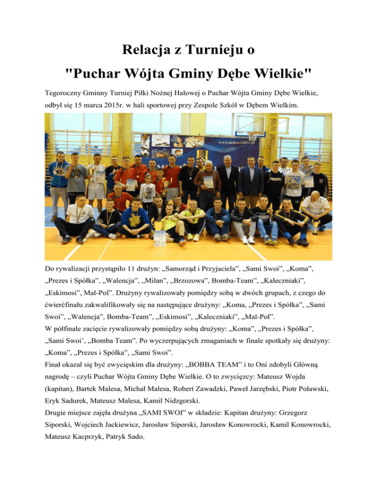 Relacja z Turnieju o "Puchar Wójta Gminy Dębe Wielkie" Tegoroczny Gminny Turniej Piłki Nożnej Halowej o Puchar Wójta Gminy Dębe Wielkie, odbył się 15 marca 2015r. w hali sportowej przy Zespole Szkół w Dębem Wielkim. Do rywalizacji przystąpiło 11 drużyn: „Samorząd i Przyjaciela”, „Sami Swoi”, „Koma”, „Prezes i Spółka”, „Walencja”, „Milan”, „Brzozowa”, Bomba-Team”, „Kaleczniaki”, „Eskimosi”, Mal-Pol”. Drużyny rywalizowały pomiędzy sobą w dwóch grupach, z czego do ćwierćfinału zakwalifikowały się na następujące drużyny: „Koma, „Prezes i Spółka”, „Sami Swoi”, „Walencja”, Bomba-Team”, „Eskimosi”, „Kaleczniaki”, „Mal-Pol”. W półfinale zacięcie rywalizowały pomiędzy sobą drużyny: „Koma”, „Prezes i Spółka”, „Sami Swoi’, „Bomba Team”. Po wyczerpujących zmaganiach w finale spotkały się drużyny: „Koma”, „Prezes i Spółka”, „Sami Swoi”. Finał okazał się być zwycięskim dla drużyny: „BOBBA TEAM” i to Oni zdobyli Główną nagrodę – czyli Puchar Wójta Gminy Dębe Wielkie. O to zwycięzcy: Mateusz Wojda (kapitan), Bartek Malesa, Michał Malesa, Robert Zawadzki, Paweł Jarzębski, Piotr Poławski, Eryk Sadurek, Mateusz Malesa, Kamil Nidzgorski. Drugie miejsce zajęła drużyna „SAMI SWOI” w składzie: Kapitan drużyny: Grzegorz Siporski, Wojciech Jackiewicz, Jarosław Siporski, Jarosław Konowrocki, Kamil Konowrocki, Mateusz Kacprzyk, Patryk Sado. W meczu o III miejsce drużyna „Koma” w składzie Piotr Kiszczak (kapitan), Marcin Pechcin, Waldemar Krawczyk, Daniel Smuga, Arkadiusz Mróz, Mateusz Król, Krzysztof Zalewski, Dariusz Hyjek wygrała z drużyną „Prezes i Spółka” w składzie: Mirosław Garbecki (kapitan), Szymon Górecki, Mateusz Cacko, Michał Ambroźkiewicz, Przemysław Bortkiewicz, Mirosław Czmoch, Karol Wielgoławski, Kamil Czuna, Sylwester Miauczak. Wszystkie cztery drużyny zostały nagrodzone pucharami i dyplomami, a za zajęcie trzech pierwszych miejsc drużyny otrzymały także medale. Wszystkie nagrody ufundował Wójt Gminy Dębe Wielkie Krzysztof Kalinowski. Na turnieju również zostali wyłonieni i uhonorowani najlepsi. Królem strzelców tegorocznego turnieju został KAMIL KONOWROCKI z drużyny „Sami Swoi”, najlepszym bramkarzem ERYK SADUREK z drużyny „Bomba Team”, a najlepszym zawodnikiem - GRZEGORZ SIPORSKI z drużyny „Sami Swoi”. Zawodnikom zostały wręczone statuetki i pamiątkowe dyplomy. Dla wszystkich zawodników i uczestników Turnieju organizatorzy przygotowali poczęstunek w sali baletowej, na których czekała tradycyjnie grochówka Pana Tadzia i pyszne domowe wypieki przygotowane przez Panie emerytki z dębskiego Koła Emerytów. Nad bezpieczeństwem uczestników czuwali druhowie z OSP Dębe Wielkie. Po oficjalnym zakończeniu nastąpiła chwila dla reporterów. Gratulujemy zwycięzców i do zobaczenia za rok !!