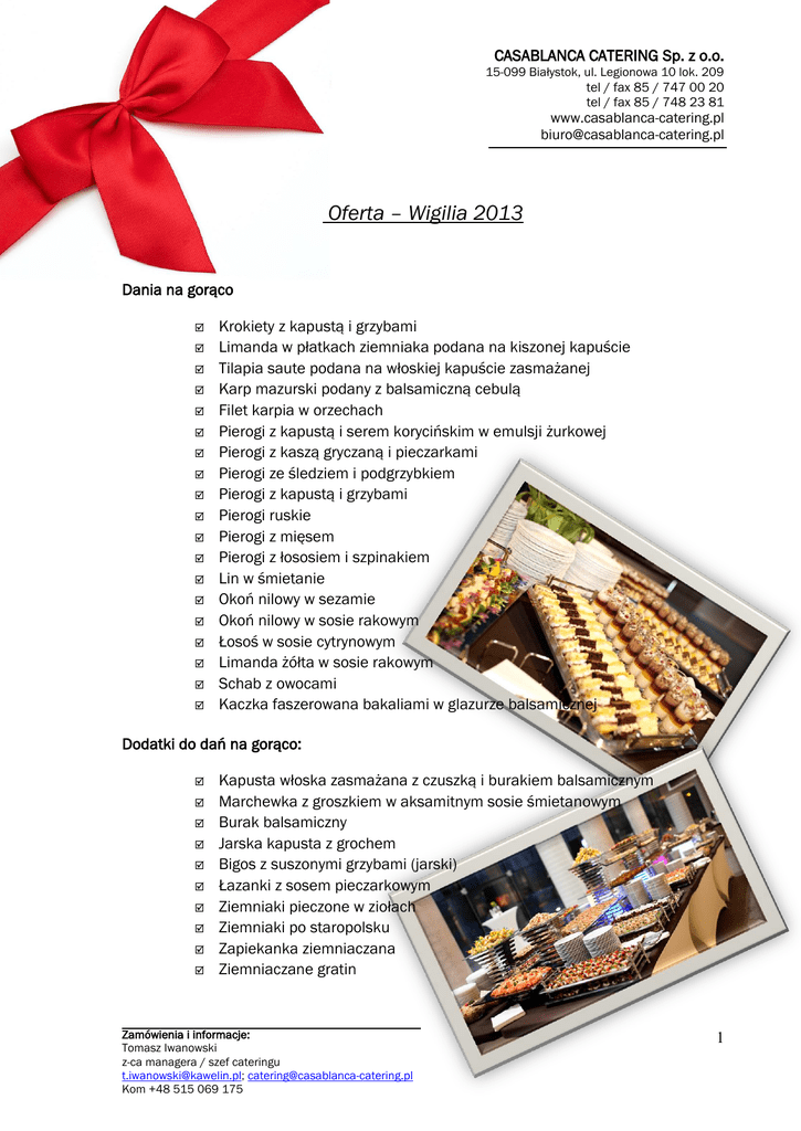 CASABLANCA CATERING Sp. z o.o. 15-099 Białystok, ul. Legionowa 10 lok. 209 tel / fax 85 / 747 00 20 tel / fax 85 / 748 23 81 www.casablanca-catering.pl [email protected] Oferta – Wigilia 2013 Dania na gorąco Krokiety z kapustą i grzybami Limanda w płatkach ziemniaka podana na kiszonej kapuście Tilapia saute podana na włoskiej kapuście zasmażanej Karp mazurski podany z balsamiczną cebulą Filet karpia w orzechach Pierogi z kapustą i serem korycińskim w emulsji żurkowej Pierogi z kaszą gryczaną i pieczarkami Pierogi ze śledziem i podgrzybkiem Pierogi z kapustą i grzybami Pierogi ruskie Pierogi z mięsem Pierogi z łososiem i szpinakiem Lin w śmietanie Okoń nilowy w sezamie Okoń nilowy w sosie rakowym Łosoś w sosie cytrynowym Limanda żółta w sosie rakowym Schab z owocami Kaczka faszerowana bakaliami w glazurze balsamicznej Dodatki do dań na gorąco: Kapusta włoska zasmażana z czuszką i burakiem balsamicznym Marchewka z groszkiem w aksamitnym sosie śmietanowym Burak balsamiczny Jarska kapusta z grochem Bigos z suszonymi grzybami (jarski) Łazanki z sosem pieczarkowym Ziemniaki pieczone w ziołach Ziemniaki po staropolsku Zapiekanka ziemniaczana Ziemniaczane gratin Zamówienia i informacje: Tomasz Iwanowski z-ca managera / szef cateringu [email protected]; [email protected] Kom +48 515 069 175 1