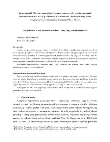 Kujawińska E. Więcek-Janka, Statystyczna ocena procesów w mikro i małych przedsiębiorstwach, Zeszyty Naukowe Ekonomiczne Problemy Usług nr 588 (51),Uniwersytet Szczeciński, Szczecin 2010, s. 421-431 Statystyczna ocena procesów w mikro i małych przedsiębiorstwach Agnieszka Kujawińska1 Ewa Więcek-Janka2 Streszczenie Ostatnie lata przyniosły znaczące zmiany w podejściu do produkcji i zarządzania jakością. Zmiana, która miała największy wpływ na statystyczną kontrolę procesu dotyczy odejścia od typowej produkcji masowej na rzecz nowoczesnej produkcji w systemach gniazdowych, krótkich seriach, JIT (ang. Just In Time) i inne. W związku z tym wiele z dotychczas stosowanych narzędzi statystycznej kontroli procesu (przede wszystkim tradycyjnych kart kontrolnych Shewharta) okazało się mało bądź w ogóle nieskuteczna. W referacie zaprezentowano narzędzia SPC (karty kontrolne dla krótkich serii), które znajdują zastosowanie w sytuacjach nietypowych. Summary (tłum. Agnieszka Kujawińska) Recent years brought significant changes in approach to production and quality management. The most important change that influenced statistical process control was divergence from mass production to modern methods of job shops, short production runs, JIT etc. Many traditional SPC tools, which have been used for years (especially traditional Shewhart control charts), appeared to be only of a little or no use at all. In the paper the SPC tools (especially control charts), which can be used in all abovementioned atypical production situations, were presented. 1. Wprowadzenie Wszystkie współczesne przedsiębiorstwa i organizacje codziennie stają w obliczu nowych wyzwań i problemów, powodowanych przez rosnące wymagania klientów, silniejszą konkurencję i szybki postęp techniczny. Jako klienci mamy coraz większe wymagania, ale jako producenci musimy te wymagania zaspokoić. W celu osiągnięcia optymalnej jakości produkcji i usług, przy jednoczesnej minimalizacji kosztów, większość organizacji wdraża systemy zarządzania i zapewnienia jakości, takie jak TQM, Six Sigma, czy normy ISO 9000 i ISO/TS 16949. Do efektywnego stosowania zasad narzucanych przez te systemy potrzebna 1 2 Politechnika Poznańska, Instytut Technologii Mechanicznej, [email protected] Politechnika Poznańska, Instytut Inżynierii Zarządzania, [email protected] jest odpowiednia infrastruktura służąca do gromadzenia danych, przekształcania ich w użyteczną wiedzę i upowszechniania tej wiedzy. Z doświadczenia wielu przedsiębiorstw, wynika że gromadzenie danych, ich analiza oraz podejmowanie decyzji w oparciu o poprawne wnioskowanie daje ogromne oszczędności i umożliwia wytwarzanie coraz lepszych produktów przy założonych zyskach. W wielu dziedzinach przemysłu zbieranie i przechowywanie danych oraz ich analiza są wymogiem prawnym, tak jest np. w przemyśle farmaceutycznym. Właśnie korzystanie z danych i wydobytej z nich wiedzy przy podejmowaniu decyzji jest jednym z ważniejszych elementów sterowania i doskonalenia procesów w firmie. Konieczność zbierania, analizy i wnioskowania dotyczy również mikro i małych przedsiębiorstw wytwórczych. Okazuje się jednak, że organizacje te napotykają na pewne trudności związane głównie z analizą danych służących do oceny stanu procesów wytwarzania. 2. Ocena stanu procesu wytwarzania Ocena stanu procesów wytwarzania w każdym nowoczesnym i wrażliwym na problemy jakości przedsiębiorstwie opracowywana jest z wykorzystaniem narzędzi wspomagających zarządzanie jakością. Narzędzia te odznaczają się prostotą i służą do zbierania i przetwarzania danych związanych z różnymi aspektami zarządzania jakością w przedsiębiorstwie. Są niezastąpione w wykrywaniu relacji zachodzących między elementami systemu zarządzania, szczególnie w ilościowym opisywaniu tych relacji i szacowaniu prawdopodobieństwa ich wystąpienia. Dane zbierane za pomocą odpowiednich instrumentów wykorzystuje się do podejmowania decyzji zarówno na szczeblu strategicznym jak i operacyjnym na każdym stanowisku pracy. Narzędzia wspomagające zarządzanie jakością są niezbędne do prawidłowego wykorzystania metod zarządzania jakością3. Jedną z wielu metod wspomagających kontrolę i doskonalenie procesów kształtujących jakość jest Statystyczne Sterowanie Procesami (ozn. SPC). SPC najczęściej kojarzy się bezpośrednio z kartami kontrolnymi. Może takie ograniczone spojrzenie na SPC jest nie do końca słuszne, jednak nie podlega dyskusji, że początki SPC wzięły się wraz z powstaniem kart kontrolnych Shewharta w latach 20-tych zeszłego stulecia. Wraz z powstaniem i rozwojem koncepcji zarządzania jakością Six-Sigma 4 w latach 80-tych, SPC zyskało na znaczeniu, często będąc określane jako jedno z narzędzi Six-Sigma. Obecnie norma ISO 9001 3 4 Hamrol A., Zarządzanie jakością z przykładami, PWN 2008 Smith G. M., Statistical Process Control and Quality Improvement, Pearson Prentice Hall 2004 zaleca stosowanie technik statystycznych (przede wszystkim SPC, a zwłaszcza karty kontrolne) do monitorowania i oceny funkcjonowania procesów. Każdy proces produkcyjny ma w swojej naturze zmienność, wynikającą z warunków otoczenia oraz sytuacji wewnętrznej firmy, na które często przedsiębiorstwo ma ograniczony wpływ5. Ze zmiennością procesu przedsiębiorstw godzą się ad hoc, ponieważ trudno im jest sprostać produkowaniu wyrobów idealnych (zgodnych z ostrymi wymogami specyfikacji). Każdy proces produkcyjny i jego wynik jest losowy 6 . Zmienność procesu trzeba jednak rozumieć jako zjawisko negatywne i dążyć do utrzymania jej na minimalnym poziomie. Zmienność procesu opisana jest najczęściej rozkładem statystyki, i jest to, w idealnym założeniu, rozkład normalny. Za pomocą odpowiednio dobranego rozkładu można dokonać przybliżenia modelowego rzeczywistego procesu. Zadaniem statystycznej kon
