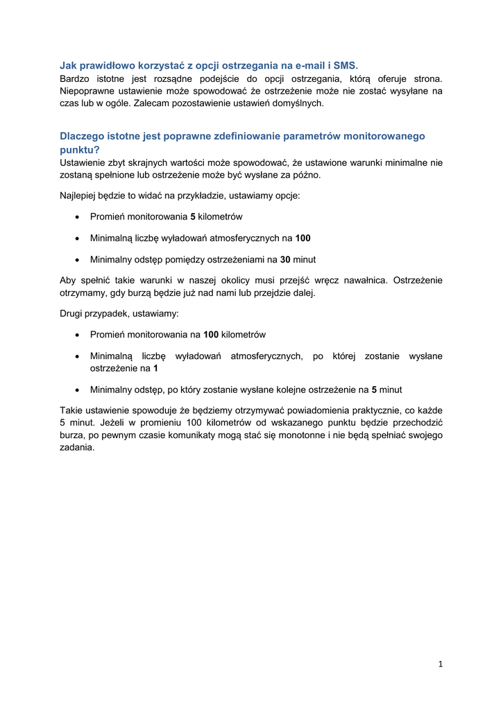Jak prawidłowo korzystać z opcji ostrzegania na e-mail i SMS. Bardzo istotne jest rozsądne podejście do opcji ostrzegania, którą oferuje strona. Niepoprawne ustawienie może spowodować że ostrzeżenie może nie zostać wysyłane na czas lub w ogóle. Zalecam pozostawienie ustawień domyślnych. Dlaczego istotne jest poprawne zdefiniowanie parametrów monitorowanego punktu? Ustawienie zbyt skrajnych wartości może spowodować, że ustawione warunki minimalne nie zostaną spełnione lub ostrzeżenie może być wysłane za późno. Najlepiej będzie to widać na przykładzie, ustawiamy opcje: Promień monitorowania 5 kilometrów Minimalną liczbę wyładowań atmosferycznych na 100 Minimalny odstęp pomiędzy ostrzeżeniami na 30 minut Aby spełnić takie warunki w naszej okolicy musi przejść wręcz nawałnica. Ostrzeżenie otrzymamy, gdy burzą będzie już nad nami lub przejdzie dalej. Drugi przypadek, ustawiamy: Promień monitorowania na 100 kilometrów Minimalną liczbę ostrzeżenie na 1 Minimalny odstęp, po który zostanie wysłane kolejne ostrzeżenie na 5 minut wyładowań atmosferycznych, po której zostanie wysłane Takie ustawienie spowoduje że będziemy otrzymywać powiadomienia praktycznie, co każde 5 minut. Jeżeli w promieniu 100 kilometrów od wskazanego punktu będzie przechodzić burza, po pewnym czasie komunikaty mogą stać się monotonne i nie będą spełniać swojego zadania. 1 Wyjaśnienie opcji wyboru Promień Za pomocą opcji promienia określamy obszar od wskazanego punktu, jaki będzie brany pod uwagę do monitorowania. Ustawienie tej wartości na zbyt dużą może powodować że będą wysyłane ostrzeżenia mimo że wyładowania atmosferyczne zostaną zarejestrowane w znacznej odległości od wskazanego punktu. Ustawienie promienia na zbyt mały może powodować że ostrzeżenia będą wysyłane zbyt późno. Jeżeli zostanie ustawiona dodatkowo zbyt duża minimalna liczba wyładowań atmosferycznych, możemy nie otrzymać ostrzeżenia w ogóle. Zaleca się pozostawienie tej opcji na domyślnej wartości, czyli 25 kilometrów. Minimalna liczba wyładowań atmosferycznych System rejestruje wyładowania atmosferyczne, które sumowane są w pełne kwadransy. Ustawienie tej opcji na 100 spowoduje że otrzymamy ostrzeżenie, dopiero wtedy gdy w wskazanym promieniu, w danym kwadransie, zostanie zarejestrowane 100 lub więcej 2 wyładowań atmosferycznych. Zaleca się pozostawienie tej opcji na domyślnej wartości, czyli 1 doziemne wyładowanie atmosferyczne. Minimalny odstęp Za pomocą tej opcji możemy określić po jakim czasie może zostać wysłane kolejne ostrzeżenie, jeżeli zostaną zarejestrowane ponownie wyładowania atmosferyczne na danym obszarze. Czas liczony jest od momentu, od którego wysłane zostało ostatnie ostrzeżenie dotyczące wyładowań atmosferycznych. Ustawienie tej wartości na zbyt małą może skutkować, że ostrzeżenia będą wysyłane często. Zbyt duże natomiast może sprawić, że nie dostaniemy ostrzeżenia mimo że będzie przechodziła kolejna burza w naszej okolicy. Domyślna zalecana wartość 3 godziny. 3