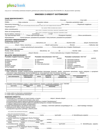 Załącznik nr 1 do Instrukcji udzielania kredytów gotówkowych osobom fizycznym przez PLUS BANK S.A. dla pracowników sprzedaży WNIOSEK O KREDYT GOTÓWKOWY DANE WNIOSKODAWCY: Imię/imiona:.........................................; Nazwisko:...............................................................; Imię ojca:...................................; Imię matki:...........................; PESEL: ……………..; Data urodzenia: ………………;Nazwisko rodowe:............................................; Nazwisko panieńskie matki:.....................................; Dokumenty tożsamości: 1. …………………………….….; 2. ...............................................…; Stan cywilny:…………….; Wspólność majątkowa: …………; Nazwa, seria i numer pierwszego dokumentu tożsamości Nazwa, seria i numer drugiego dokumentu tożsamości Współmałżonek**: ……………………………………………………………………………………………………………………………..……………………………; Imię, nazwisko, PESEL lub dokładna data urodzenia Adres zameldowania:..............................................................................................................................................................................................................; (ulica, nr domu, nr mieszkania, kod pocztowy, miejscowość, województwo, powiat) Adres do korespondencji:........................................................................................................................................................................................................; (ulica, nr domu, nr mieszkania, kod pocztowy, miejscowość, województwo, powiat) Numer telefonu: domowy: (…)….-…….-……;komórkowy: …..-…...-…..; e-mail: …………………………………; Typ zajmowanego lokalu: ………..; Prawo zajmowanego lokalu: …………….…..………; Obciążenie hipoteką: …………; Okres zameldowania:…………; Wykształcenie:…………; Konta bankowe: posiadam/nie posiadam¹; Karty bankowe: posiadam/nie posiadam;¹ DOCHODY WNIOSKODAWCY: Podstawowe źródło dochodu: Rodzaj źródła dochodu: …………………………….; Zatrudniony od: ……………….do: ……………….; Dochód netto: …………….. złotych; Dochód brutto: ………………… złotych; Status zawodowy: ………………………; Zawód wykonywany: …………………..; Branża: ……………………….; Całkowity staż pracy: …………………….; Liczba zatrudnionych pracowników: ………………; Forma rozliczania się z Urzędem Skarbowym: ………………………………; Dodatkowe źródło dochodu: Rodzaj źródła dochodu: ……………………………….; Zatrudniony od: ……………. do: ………………….; Dochód netto: ………………….. złotych; Dochód brutto: ………………………….złotych; Branża:…………………….; Forma rozliczania się z Urzędem Skarbowym:…………………………….; MAJĄTEK WNIOSKODAWCY: Posiadam majątek finansowy: NIE/TAK1 wartość lokaty w bankach .............................. obligacje .............................. akcje .............................. udziały .............................. polisy na życie .............................. inny majątek ............................... Posiadam nieruchomości: NIE/TAK1 wartość mieszkanie ............................. dom ............................. kamienica ............................ inne nieruchomości ............................ Posiadam ruchomości: NIE/TAK1 samochód osobowy samochód ciężarowy samochód inny motocykl maszyny i urządzenia pojazdy i maszyny rolnicze inny majątek wartość ......................... .......................... .......................... ........................... .......................... .......................... ........................... ZOBOWIĄZANIA WNIOSKODAWCY: 1. Stałe miesięczne wydatki socjalno-bytowe gospodarstwa domowego (żywność, telefon, utrzymanie samochodu, koszty związane z wynajmem mieszkania i jego eksploatacją, koszty kształcenia np. kursy językowe oraz inne koszty) wynoszą ……………………….. złotych. 2. Posiadam zobowiązania finansowe z tytułu:*** kredytu, pożyczki, poręczenia, alimentów, inne: TAK/NIE¹ tytuł zobowiązania udzielona kwota zobowiązania waluta pierwotna liczba rat miesięczna wysokość raty nazwa banku/instytucji finansowej 3. Posiadam limity kredytowe z tytułu:*** karty kredytowej, kredytu w rachunku osobistym, inne: TAK/NIE¹ tytuł limitu udzielona kwota limitu waluta nazwa banku/instytucji finansowej 4. Liczba osób na utrzymaniu wnioskodawcy: …………….. 5. Liczba osób w gospodarstwie domowym: ………………. WARUNKI KREDYTU 1. Wnioskuję(my) o udzielenie mi (nam) kredytu w kwocie ……………….. złotych, (słownie złotych: ..................................................................................) z przeznaczeniem na cele konsumpcyjne, przy czym: a) prowizja Banku będzie1wpłacona gotówką1/potrącona z kredytu1/skredytowana1; b) opłata przygotowawcza będzie1wpłacona gotówką1/potrącona z kredytu1/skredytowana;1 c) składka ubezpieczenia będzie skredytowana1; 2. Kredyt zobowiązuję(my) się spłacić przez okres: ............. miesięcy, z terminem płatności przypadającym na ............ dzień każdego miesiąca. 3. Zabezpieczenie spłaty kredytu stanowić będzie: a) poręczenie wg prawa cywilnego1 złożone przez: …………………………………………………………………………………………………………………………………………………………… imię i nazwisko, adres zameldowania Poręczyciela ………………………………………..,PESEL: …………………. Nazwa, seria i numer dokumentu tożsamości b) zastaw rejes