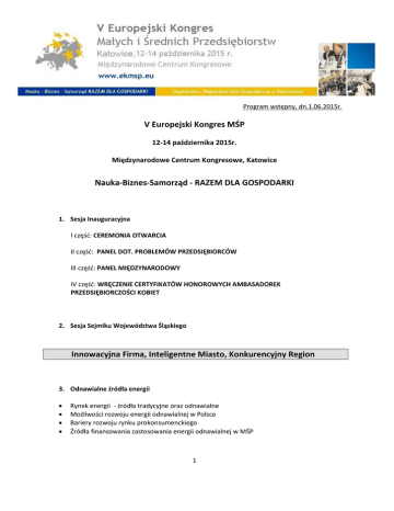 Program wstępny, dn.1.06.2015r. V Europejski Kongres MŚP 12-14 października 2015r. Międzynarodowe Centrum Kongresowe, Katowice Nauka-Biznes-Samorząd - RAZEM DLA GOSPODARKI 1. Sesja Inauguracyjna I część: CEREMONIA OTWARCIA II część: PANEL DOT. PROBLEMÓW PRZEDSIĘBIORCÓW III część: PANEL MIĘDZYNARODOWY IV część: WRĘCZENIE CERTYFIKATÓW HONOROWYCH AMBASADOREK PRZEDSIĘBIORCZOŚCI KOBIET 2. Sesja Sejmiku Województwa Śląskiego Innowacyjna Firma, Inteligentne Miasto, Konkurencyjny Region 3. Odnawialne źródła energii Rynek energii - źródła tradycyjne oraz odnawialne Możliwości rozwoju energii odnawialnej w Polsce Bariery rozwoju rynku prokonsumenckiego Źródła finansowania zastosowania energii odnawialnej w MŚP 1 4. Do innowacji jeden krok…, czyli jak poprawić zdolność konkurencyjną firmy sektora MŚP poprzez współpracę ze sferą naukową? Nauka dla MŚP czy MŚP dla nauki? Korzyści dla obu stron wynikające z komercjalizacji wiedzy i technologii. Gdzie szukać informacji na temat możliwości współpracy firmy sektora MŚP ze sferą naukową? Jakie kroki powinien podjąć mikro, mały i średni przedsiębiorca, aby rozpocząć współpracę z partnerem ze sfery naukowej? W poszukiwaniu optymalnego modelu komercjalizacji wiedzy i technologii. Współpraca staje się faktem – przykłady dobrych praktyk. 5. Inteligentny Rozwój Źródła finansowania innowacyjności w ramach Programu Operacyjnego Inteligentny Rozwój oraz Programu Operacyjnego Polska Wschodnia 6. Dialog i partnerska współpraca między samorządami a MŚP W jaki sposób samorządy powinny tworzyć klimat przyjazny małej i średniej przedsiębiorczości? Jak zaangażować MŚP w aktywny dialog i partnerską współpracę z samorządem? Odpowiednia infrastruktura i instrumenty wsparcia przedsiębiorczości a potrzeby MŚP. Współpraca władz samorządowych z przedsiębiorcami – pozytywne praktyki. Sposoby ulepszania współpracy między samorządem a MŚP – jak zmienić stosunek samorządów do MSP i odwrotnie? Rola samorządów we wspieraniu konkurencyjności i innowacyjności MŚP. 7. Jak uzdrowić służbę zdrowia? Jakie wyzwania stoją przed polskim systemem ochrony zdrowia? Zdrowie publiczne. Co zmieni ustawa? Zachowania prozdrowotne. Jaka jest rola przedsiębiorców w zakresie profilaktyki i popularyzacji zdrowego trybu życia? Finansowanie ochrony zdrowia. Modele europejskie ( Holandia – najlepszy europejski model, Austria, Czechy). Finansowanie publiczne i prywatne ochrony zdrowia. Współpłacenie i Dodatkowe (prywatne) Ubezpieczenia zdrowotne. Realia polskie. Rola i potencjał prywatnej opieki medycznej w sektorze ochrony zdrowia. 8. Medycyna przyszłości Perspektywy i kierunki rozwoju medycyny Kooperacja: nauka – praktyka. Czyli jak współpracować, aby wdrażać innowacje? Przykłady dobrych praktyk w medycynie Transplantologia, inżynieria biomedyczna, kardiologia, kardiochirurgia-rozwojowe kierunki medyczne Europejska karta dawcy oraz wspólne unijne standardy szansą na rozwój transplantologii i ratowanie ludzkiego życia na większą skalę Wpływ innych branż na rozwój medycyny, dostępność nowoczesnego sprzętu medycznego Innowacyjne rozwiązania w medycynie 2 9. Rozwój klastrów - TAK! Tylko jak? Jaki jest stan rozwoju polskich klastrów na tle Europy w świetle badań prowadzonych przez m.in. Polską Agencję Rozwoju Przedsiębiorczości? Jakiego wsparcia potrzebują polskie i europejskie klastry? Czy zaplanowane kierunki wsparcia klastrów na poziomie regionalnym, krajowym i ponadnarodowym umożliwią dynamiczny rozwój klastrów w Europie? Jakie warunki muszę spełnić, by uzyskać status Krajowego Klastra Kluczowego? Co da mi taki status? Jeśli nie KKK, to co? Możliwości wsparcia klastrów na poziomie ponadnarodowym i regionalnym. Chcę powołać klaster, gdzie szukać wsparcia 10. Zawodowe znaczy lepsze – formalna i pozaformalna edukacja zawodowa warunkiem rozwoju MŚP Rozwiń skrzydła - możliwości wsparcia MŚP (KFS, POWER, PIR, RPO, Erasmus+) System edukacji zawodowej a potrzeby pracodawców Europejskie modele kształcenia zawodowego (Republika Czeska, Niemcy, Polska) Doskonalenie zawodowe pracowników - partnerzy i narzędzia wsparcia Modułowe i dualne kształcenie w Polsce 11. Urzędy pracy partnerem MŚP. W jaki sposób urzędy pracy mogą wspierać MŚP? Jakie możliwości stwarza dla przedsiębiorców Krajowy Fundusz Szkoleniowy? Jakie są przewidywane trendy na polskim i europejskim rynku pracy i w jaki sposób będą wpływać na dostępność zasobów pracy? Jakie oczekiwania wobec urzędów pracy mają MŚP? Jak ulepszyć współpracę na linii PUPMŚP? Prezentacje dobrych praktyk niemieckich. Co zrobić, aby dostosować system edukacji do rzeczywistych potrzeb rynku pracy? 12. Możliwości rozwoju MŚP w obszarze innowacyjnych technologii na przykładzie branży lotniczej W jaki sposób firmy sektora MŚP mogą rozwijać się w otoczeniu przemysłu lotniczego? Spotkanie dwóch światów (nauki i biznesu) na drodze wzmocnienia konkurencyjności - czyli kooperacja w ramach konsorcjów badawczych i klastrów lotniczych. Polskie cargo lotnicze – kierunki rozwoju. Doświadczenia I edycji Konkursu Programu INNOLOT – rekomendacje na przyszłość. Wsparcie unijne dla rozwoju innowacji w branży lotniczej w nowej perspektywie finansowej 2014-2020. Dobre praktyki klastrów lotniczych z Austrii i Niemiec. Lotnictwo biznesowe w Czechach. 13. Regiony europejskie – konkurencja czy współpraca? Konkurencyjność woj. śląskiego i woj. mazowieckiego a konkurencyjność najsłabszych województw – konkurencyjność regionów w wymiarze ogólnokrajowym. 3 Konkurencyjność niemieckich landów, różnice miedzy wschodnimi a zachodnimi landami (nowymi i starymi krajami związkowymi) Zagłębie Północne we Francji, różnice w konkurencyjności regionów. „Dobre praktyki” w zakresie konkurencyjności i współpracy regiona