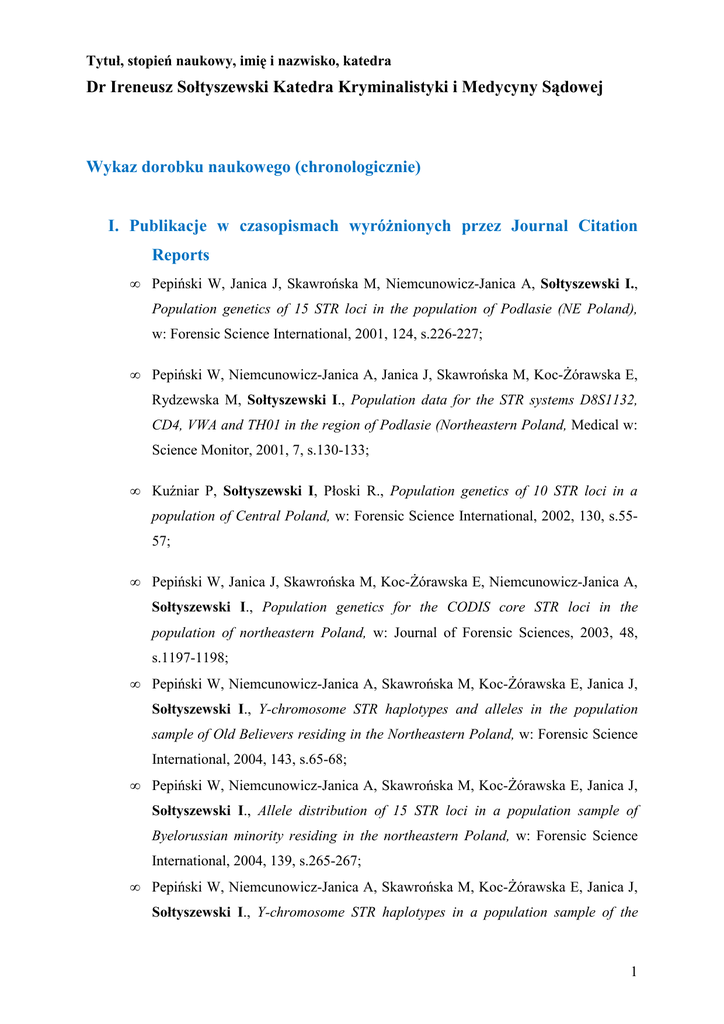 Tytuł, stopień naukowy, imię i nazwisko, katedra Dr Ireneusz Sołtyszewski Katedra Kryminalistyki i Medycyny Sądowej Wykaz dorobku naukowego (chronologicznie) I. Publikacje w czasopismach wyróżnionych przez Journal Citation Reports • Pepiński W, Janica J, Skawrońska M, Niemcunowicz-Janica A, Sołtyszewski I., Population genetics of 15 STR loci in the population of Podlasie (NE Poland), w: Forensic Science International, 2001, 124, s.226-227; • Pepiński W, Niemcunowicz-Janica A, Janica J, Skawrońska M, Koc-Żórawska E, Rydzewska M, Sołtyszewski I., Population data for the STR systems D8S1132, CD4, VWA and TH01 in the region of Podlasie (Northeastern Poland, Medical w: Science Monitor, 2001, 7, s.130-133; • Kuźniar P, Sołtyszewski I, Płoski R., Population genetics of 10 STR loci in a population of Central Poland, w: Forensic Science International, 2002, 130, s.5557; • Pepiński W, Janica J, Skawrońska M, Koc-Żórawska E, Niemcunowicz-Janica A, Sołtyszewski I., Population genetics for the CODIS core STR loci in the population of northeastern Poland, w: Journal of Forensic Sciences, 2003, 48, s.1197-1198; • Pepiński W, Niemcunowicz-Janica A, Skawrońska M, Koc-Żórawska E, Janica J, Sołtyszewski I., Y-chromosome STR haplotypes and alleles in the population sample of Old Believers residing in the Northeastern Poland, w: Forensic Science International, 2004, 143, s.65-68; • Pepiński W, Niemcunowicz-Janica A, Skawrońska M, Koc-Żórawska E, Janica J, Sołtyszewski I., Allele distribution of 15 STR loci in a population sample of Byelorussian minority residing in the northeastern Poland, w: Forensic Science International, 2004, 139, s.265-267; • Pepiński W, Niemcunowicz-Janica A, Skawrońska M, Koc-Żórawska E, Janica J, Sołtyszewski I., Y-chromosome STR haplotypes in a population sample of the 1 Byelorussian minority living in the northeastern Poland, w: Forensic Science International, 2004, 140, s.117-121; • Pepiński W, Niemcunowicz-Janica A, Ptaszyńska-Sarosiek I, Skawrońska M, Koc-Żórawska M, Janica J, Sołtyszewski I., Population genetics of Y chromosome STRs in a population of Podlasie, northeastern Poland, w: Forensic Science International, 2004, 144, s.77-82; • Sołtyszewski I, Pepiński W, Skawrońska M, Koc-Żórawska E, NiemcunowiczJanica A, Janica J., STR data for the AmpFlSTR SGM Plus loci from Warmia and Mazury (NE Poland), w: Forensic Science International, 2004, 141, s.69-71; • Pepiński W, Niemcunowicz-Janica A, Skawrońska M, Koc-Żórawska E, Janica J, Sołtyszewski I., Allele distribution of 15 STR loci in a population sample of the Lithuanian minority residing in the Northeastern Poland, w: Forensic Science International, 2004, 144, s.65-67; • Pepiński W, Niemcunowicz-Janica A, Skawrońska M, Janica J, Koc-Żórawska E, Sołtyszewski I., Genetic data on 15 STRs in a population sample of religious minority of Old Believers residing in the northeastern Poland. w: Forensic Science International, 2005, 148, s.61-63; • Pepiński W, Skawrońska M, Niemcunowicz-Janica A, Koc-Żórawska E, Janica J, Sołtyszewski I., Polymorphism of four X-chromosomal STRs in a Polish population sampl, w: Forensic Science International, 2005, 151, s.93-95; • Niemcunowicz-Janica A, Skawrońska M, Janica J, Koc-Żórawska E, Aleksandrowicz-Bukin M, Sołtyszewski I., Genetic data on 15 STR loci in the ethnic group of Polish Tatars residing in the area of Podlasie (Northeastern Poland), w: Forensic Science International, 2005, 149, s.263-265; • Sołtyszewski I, Spólnicka M, Kartasińska E, Konarzewska M, Pepiński W, Janica J., Genetic variation of STR loci D3S1358, TH01, D21S11, D18S51, Penta E, D5S818, D13S317, D7S820, D16S539, CSF1PO, Penta D, vWA, D8S1179, TPOX and FGA by GenePrint PowerPlex 16 in a Polish population, w: Forensic Science International, 2006, Vol.159, s.241-243; • Sołtyszewski I, Pepiński W, Piątek J, Żuk J, Jóźwiak R, Janica J., Genetic data on 10 STR loci a population of western Poland, w: Forensic Science International, 2006, Vol.161, no 1, s.69-71; 2 • Maruszak A, Gawęda-Walerych K, Sołtyszewski I, Żekanowski C., Mitochondrial DNA in pathogenesis of Alzheimer’s and Parkinson’s diseases, w: Acta Neurobiologiae Experimentalis, 2006, 66 s.153–176; • Sołtyszewski I, Pepiński W, Dobrzyńska-Tarasiuk A, Janica J., DNA typeability in liquid urine and urine stains using AmpFISTR SGM Plus, w: Advances in Medical Sciences, 2006, Vol.51, s.36-38; • Sołtyszewski I, Niemcunowicz-Janica A, Pepiński W, Spólnicka M, Zbieć R, Janica J., Vitreous humor as a potential source for postmortem human identification, w: Folia Histochemica et Cytobiologia, 2007, Vol.45, No.2, s.135136; • Niemcunowicz-Janica A, Pepiński W, Janica RJ, Skawrońska M, Janica J, Koc-Żórawska E, Sołtyszewski I., Effect of soi land water environment on typeability of PowerPlex Y (Promega) in selected tissue samples, w: Folia Histochemica et Cytobiologia, 2007, Vol.45, No.4, s.393 -395; • Sołtyszewski I, Pepiński W, Spólnicka M, Kartasińska E, Konarzewska M, Janica J., Y-chromosomal haplotypes for the AmpFISTR Yfiler PCR Amplification Kit in a population sample from central Poland, w: Forensic Science International, 2007, Vol.168, s.61-67; • Pepiński W, Niemcunowicz-Janica A, Skawrońska M, Koc-Żórawska E, Janica J, Berent J, Sołtyszewski I.: X-chromosomal polymorphism data for the ethnic minority of Polish Tatars and the religious minority of Old Believers residing in northeastern Poland., w: Forensic Science International: Genetics, 2007, Vol.1, s.212-214; • Janica J, Pepiński W, Niemcunowicz-Janica A, Skawrońska M, Berent J, KocŻórawska E, Sołtyszewski I., Database of genetic profiles at the Department of Forensic Medicine, Medical University of Białystok, w: Advances in Medical Sciences, 2008, Vol.53, no 1, s.64-68; • Spólnicka M, Jagiełło A, Sołtyszewski I, Jacewicz R, Płócienniczak A, Berent J., Sequenc