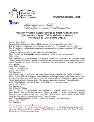 POMORSKI ODDZIAŁ KIDP P r z e d s i ę b i o r s t w o Tu r y s t y c z n e „ W I G R Y ” S p ó ł k a z o . o . 16-400 Suwałki, ul. Kościuszki 84 tel/fax (0 87) 566-32-89, tel/fax (0 87) 563-07-85 e-mail:biuro@wigrytra vel.pl, www.wigrytravel.pl Program wyjazdu integracyjnego do miast nadbałtyckich (Druskienniki – Ryga - Tallin- Helsiniki – Kowno) w terminie 23 -28 sierpnia 2013 r. 1 DZIEŃ 23.08.2013 Godz. 4:00 Wyjazd grupy z Gdyni (zbiórka plac przy Poczcie przed Dworcem PKS) 4:30 Wyjazd grupy z Sopotu (zbiórka na stacji paliw BP przy Al. Niepodległości 664-670) 5:00 Wyjazd grupy z Gdańska (zbiórka na przystanku autobusowym przy restauracji KFC przed Dworcem PKP) Przejazd w kierunku granicy polsko-litewskiej w Ogrodnikach; 12:00 Przyjazd do Druskiennik; zakwaterowanie w Hotelu Regina – www.regina.lt; 13:00 Obiad; 18:00 Spotkanie z przewodnikiem - zwiedzanie miasteczka, położonego na wysokim brzegu Niemna, otoczonego lasami i łagodnymi pagórkami, głównego centrum uzdrowiskowego na Litwie: spacer deptakiem po parku zdrojowym - ozdobionym małymi fontannami z wodami mineralnymi oraz rzeźbami; Godz. 20:00 Kolacja; Nocleg w Hotelu Regina; 2 DZIEŃ 24.08.2013 7:00 Śniadanie; 8:00 Wyjazd do Rygi; po drodze zwiedzanie Góry Krzyży w Szawlach lub Zamku w Rundale; 15:00 Przyjazd do Rygi, spotkanie z przewodnikiem i zwiedzanie miasta, m. in.: Stare Miasto, Dom Bractwa Czarnogłowych, zespół średniowiecznych kamieniczek tzw. „Trzej Bracia”, Ratusz, Mała i Wielka Gildia, Katedra Domska, kościół Św. Jakuba, budynek parlamentu, Pomnik Wolności; 18:00 Obiadokolacja i nocleg w Rydze – Hotel „IRINA” – www.hotelirina.lv; 3 DZIEŃ 25.08.2013 7:00 Śniadanie; 8:00 Wyjazd do Tallina; 13:00 Przyjazd do Tallina, spotkanie z przewodnikiem i zwiedzanie miasta, m. in.: Górna i Dolne Stare Miasto, dwie średniowieczne wieże: „Długi Herman” i „Gruba Małgorzata”, Kościół Luterański, dwie średniowieczne ulice: tzw. Długa i Krótka Noga, Ratusz Miejski, Wielka Gildia Kupiecka, Kościół Protestancki Św. Ducha, Wzgórze Toompea; 18:00 Obiadokolacja i nocleg w Tallinie – Hotel Go Schnelli – www.gohotels.ee 4 DZIEŃ 26.08.2013 6:30 Śniadanie; 7:30 Przeprawa promowa do Helsinek; 9:30 Spotkanie z przewodnikiem, zwiedzanie Helsinek, m.in.: Katedra Protestancka, pomnik Aleksandra II, Dworzec Kolejowy, Stadion Olimpijski, Sobór Uspienski, Kościół w Skale, Pomnik Monnerheima, P. Nurmiego i Sibeliusa; 16:30 Przeprawa promowa do Tallina; 19:30 Obiadokolacja i nocleg w Tallinie j/w; 5 DZIEŃ 27.08.2013 7:00 Śniadanie; 8:00 Wyjazd do Kowna; 16:00 Przyjazd do Kowna, spotkanie z przewodnikiem i zwiedzanie miasta, m.in.: Stare Miasto, ruiny Zamku Kowieńskiego, Ratusz, Katedra Św. Piotra i Pawła, Dom Perkuna, spacer Aleją Wolności; Obiadokolacja i nocleg w Kownie – Hotel Kaunas – www.kaunascityhotel.com; 6 DZIEŃ 28.08.2013 7:00 Śniadanie; 8:00 Wyjazd w drogę powrotną do Polski; Godz. 17:00 Przyjazd do Gdańska; 17:30 – do Sopotu; 18:00 – do Gdyni; Rozwiązanie wycieczki. Cena : 1579 zł/os. przy grupie 45 osobowej W ramach ceny gwarantujemy: transport autokarem (wc, klimatyzacja, video, barek) ubezpieczenie NNW i KL wyżywienie zgodnie z programem 5 noclegów w hotelach***(2-osobowe z łazienką) opiekę pilota usługi polskojęzycznych przewodników (Druskienniki, Ryga, Tallin, Helsinki, Kowno) przeprawę promową Cena nie zawiera: biletów wstępu do zwiedzanych obiektów - ok. 35 euro Dopłata do pokoi 1 –osobowych (420 zł/os.)