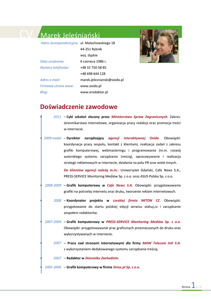 CV Marek Jeleśniaoski Adres korespondencyjny: ul. Małachowskiego 18 44-251 Rybnik woj. śląskie Data urodzenia: 6 czerwca 1986 r. Numery telefonów: +48 32 750 58 85 +48 698 644 128 Adres e-mail: [email protected] Firmowa strona www: www.oxido.pl Blog: www.eredaktor.pl Doświadczenie zawodowe 2011 – Cykl szkoleo zlecony przez Ministerstwo Spraw Zagranicznych. Zakres: dziennikarstwo internetowe, organizacja pracy redakcji oraz promocja treści w internecie. 2009-nadal – Dyrektor zarządzający agencji interaktywnej Oxido. Obowiązki: koordynacja pracy zespołu, kontakt z klientami, realizacja zadao z zakresu grafiki komputerowej, webmasteringu i programowania (m.in. rozwój autorskiego systemu zarządzania treścią), opracowywanie i realizacja strategii reklamowych w internecie, działania na polu PR oraz wiele innych. Do klientów agencji należą m.in.: Uniwersytet Gdaoski, Cafe News S.A., PRESS-SERVICE Monitoring Mediów Sp. z o.o. oraz ASUS Polska Sp. z o.o. 2008-2009 – Grafik komputerowy w Cafe News S.A. Obowiązki: przygotowywanie grafiki na potrzeby internetu oraz druku, tworzenie reklam internetowych. 2008 – Koordynator projektu w czeskiej firmie MITON CZ. Obowiązki: przygotowanie do startu polskiej edycji serwisu stahuj.cz i zarządzanie zespołem redaktorów. 2007-2009 – Grafik komputerowy w PRESS-SERVICE Monitoring Mediów Sp. z o.o. Obowiązki: przygotowywanie prac graficznych przeznaczonych do druku oraz wykorzystywanych w internecie. 2007 – Praca nad stronami internetowymi dla firmy MAW Telecom Intl S.A. z wykorzystaniem dedykowanego systemu zarządzania treścią. 2007 – Redaktor w Dzienniku Zachodnim. 2005-2006 – Grafik komputerowy w firmie Sirius.pl Sp. z o.o. Strona 1 (z 4) 2004-nadal – Redaktor naczelny serwisu PC Centre (tematyka: nowe technologie). Obowiązki: koordynowanie pracy redakcji, kontakt z firmami (m.in. z producentami i dystrybutorami produktów z branży IT), tworzenie różnego rodzaju treści na potrzeby serwisu, organizacja konkursów, działania z zakresu PR. Wykształcenie 2008-2010 – Studia uzupełniające (magisterskie) na Uniwersytecie Śląskim. Kierunek: politologia, specjalizacja: dziennikarstwo i komunikacja społeczna. Temat pracy magisterskiej: „Charakterystyka polskiej blogosfery”. 2005-2008 – Studia licencjackie na Uniwersytecie Śląskim. Kierunek: politologia. Temat pracy licencjackiej: „Dziennikarstwo internetowe w Polsce”. 2001-2005 – I Liceum Ogólnokształcące w Rybniku. Profil matematyczno-informatyczny. Wybrane kursy i konferencje 2010 – Konferencja na temat oprogramowania i technologii internetowych dla sektora edukacji, organizowana przez Microsoft. 2009 – Szkolenie z zakresu promocji w internecie, organizowane przez Allegro. 2007 – Kurs dziennikarski organizowany przez Uniwersytet Śląski. Umiejętności Związane z dziennikarstwem (w tym zwłaszcza z dziennikarstwem internetowym): Umiejętności związane z zarządzaniem zespołem redakcyjnym i planowaniem różnego rodzaju działao, w tym także strategii rozwoju, kampanii reklamowych, konkursów i inicjatyw o charakterze społecznym (np. Dni Bezpieczeostwa Informatycznego). Umiejętności i doświadczenie w przekazywaniu wiedzy z zakresu redagowania treści na potrzeby internetu oraz komunikacji (także marketingowej) w globalnej sieci (prowadzenie szkoleo w formie wykładów i warsztatów). Szeroka wiedza i doświadczenie w przygotowywaniu treści na potrzeby różnego rodzaju mediów (zwłaszcza internetu i prasy). Znajomośd wielu zagadnieo związanych z nowymi technologiami, polityką, życiem społecznym, gospodarką i motoryzacją. Umiejętnośd posługiwania się językiem polskim na bardzo wysokim poziomie, w tym przygotowywania tekstów różnego rodzaju i ich korekty. Strona 2 (z 4) Związane z informatyką, w tym przede wszystkim z tworzeniem stron internetowych oraz grafiką komputerową: Umiejętności i doświadczenie w zarządzaniu projektami informatycznymi. Znajomośd oprogramowania do zarządzania projektami oraz usługi GitHub. Znajomośd programów graficznych: Adobe Photoshop, Adobe InDesign, Adobe Illustrator (w stopniu bardzo dobrym); Adobe Flash (w stopniu dobrym), a także CorelDRAW (w stopniu podstawowym). Znajomośd zasad tworzenia identyfikacji wizualnej przedsiębiorstw oraz zasad typografii. Bardzo dobra znajomośd języków (X)HTML i CSS (w tym bardzo dobra znajomośd standardów W3C); dobra znajomośd PHP (znajomośd zasad programowania zorientowanego obiektowo) i SQL; znajomośd Java Script, jQuery, HTML5 oraz CSS3. Znajomośd baz danych MySQL i Microsoft Access w stopniu bardzo dobrym. Znajomośd Zend Frameworka i biblioteki Smarty w stopniu dobrym. Szerokie umiejętności związane z administracją systemami zarządzania treścią (CMS), forami internetowymi, systemami blogowymi i innymi. Bardzo dobra orientacja w świecie internetowym, znajomośd zasad funkcjonowania serwisów społecznościowych (i szerzej: trendu Web 2.0). Bardzo dobra znajomośd pakietu Microsoft Office i systemów operacyjnych Windows. Związane z prowadzeniem przedsiębiorstwa, marketingiem i public relations: Umiejętności i doświadczenie w zarządzaniu zespołem (w tym osobami pracującymi zdalnie): jasne formułowanie zadao i skuteczne egzekwowanie ich wykonania. Szeroka znajomośd zasad marketingu, w tym kreowania wizerunku i promowania produktów w internecie. Dobra znajomośd zasad promowania stron internetowych, w tym optymalizacji witryn pod kątem wyszukiwarek (i pozycjonowania) oraz reklamy kontekstowej. Znajomośd zasad funkcjonowania przedsiębiorstw (w tym prowadzenia e-biznesu): znajomośd podstaw księgowości oraz podstaw prawnych, niezbędnych do prowadzenia firmy. Szerokie umiejętności związane z komunikacją: PR wewnętrzny i zewnętrzny (w tym media relations), kontakty z firmami (w tym poszukiwanie partnerów, negocjacje i nawiązywanie współpracy). Udział w audycjach radiowych (m.in. w Polskim Ra