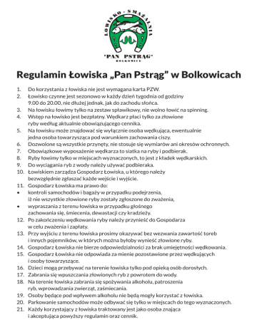 Regulamin Łowiska „Pan Pstrąg” w Bolkowicach 1. 2. 3. 4. 5. 6. 7. 8. 9. 10. 11. • • 12. 13. 14. 15. 16. 17. 18. 19. 20. 21. Do korzystania z łowiska nie jest wymagana karta PZW. Łowisko czynne jest sezonowo w każdy dzień tygodnia od godziny 9.00 do 20.00, nie dłużej jednak, jak do zachodu słońca. Na łowisku łowimy tylko na zestaw spławikowy, nie wolno łowić na spinning. Wstęp na łowisko jest bezpłatny. Wędkarz płaci tylko za złowione ryby według aktualnie obowiązującego cennika. Na łowisku może znajdować się wyłącznie osoba wędkująca, ewentualnie jedna osoba towarzysząca pod warunkiem zachowania ciszy. Dozwolone są wszystkie przynęty, nie stosuje się wymiarów ani okresów ochronnych. Obowiązkowe wyposażenie wędkarza to siatka na ryby i podbierak. Ryby łowimy tylko w miejscach wyznaczonych, to jest z kładek wędkarskich. Do wyciągania ryb z wody należy używać podbieraka. Łowiskiem zarządza Gospodarz Łowiska, u którego należy bezwzględnie zgłaszać każde wejście i wyjście. Gospodarz Łowiska ma prawo do: kontroli samochodów i bagaży w przypadku podejrzenia, iż nie wszystkie złowione ryby zostały zgłoszone do zważenia, wypraszania z terenu łowiska w przypadku głośnego zachowania się, śmiecenia, dewastacji czy kradzieży. Po zakończeniu wędkowania ryby należy przynieść do Gospodarza w celu zważenia i zapłaty. Przy wyjściu z terenu łowiska prosimy okazywać bez wezwania zawartość toreb i innych pojemników, w których można byłoby wynieść złowione ryby. Gospodarz Łowiska nie bierze odpowiedzialności za brak umiejętności wędkowania. Gospodarz Łowiska nie odpowiada za mienie pozostawione przez wędkujących i osoby towarzyszące. Dzieci mogą przebywać na terenie łowiska tylko pod opieką osób dorosłych. Zabrania się wpuszczania złowionych ryb z powrotem do wody. Na terenie łowiska zabrania się spożywania alkoholu, patroszenia ryb, wprowadzania zwierząt, zaśmiecania. Osoby będące pod wpływem alkoholu nie będą mogły korzystać z łowiska. Parkowanie samochodów może odbywać się tylko w miejscach do tego wyznaczonych. Każdy korzystający z łowiska traktowany jest jako osoba znająca i akceptująca powyższy regulamin oraz cennik.