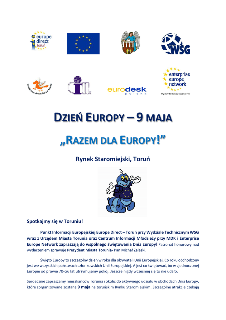 DZIEŃ EUROPY – 9 MAJA „RAZEM DLA EUROPY!” Rynek Staromiejski, Toruń Spotkajmy się w Toruniu! Punkt Informacji Europejskiej Europe Direct – Toruń przy Wydziale Technicznym WSG wraz z Urzędem Miasta Torunia oraz Centrum Informacji Młodzieży przy MDK i Enterprise Europe Network zapraszają do wspólnego świętowania Dnia Europy! Patronat honorowy nad wydarzeniem sprawuje Prezydent Miasta Torunia- Pan Michał Zaleski. Święto Europy to szczególny dzień w roku dla obywateli Unii Europejskiej. Co roku obchodzony jest we wszystkich państwach członkowskich Unii Europejskiej. A jest co świętować, bo w zjednoczonej Europie od prawie 70-ciu lat utrzymujemy pokój. Jeszcze nigdy wcześniej się to nie udało. Serdecznie zapraszamy mieszkańców Torunia i okolic do aktywnego udziału w obchodach Dnia Europy, które zorganizowane zostaną 9 maja na toruńskim Rynku Staromiejskim. Szczególne atrakcje czekają na dzieci i młodzież – dla najmłodszych m.in. europejskie zabawy i konkursy z nagrodami, broszury i quizy o Unii Europejskiej. Wszystkich gości powitamy kwiatami w barwach Unii Europejskiej. Nie zabraknie oczywiście dźwięków hymnu Unii Europejskiej. Gościem specjalnym Dnia Europy w Toruniu będzie Syriusz – maskotka Unii Europejskiej, który chętnie zrobi sobie zdjęcie ze wszystkimi uczestnikami! Do udziału w wydarzeniu szczególnie zapraszamy szkoły i przedszkola – przyjdźcie całą klasą! Ze względów organizacyjnych prosimy o wcześniejsze zgłaszanie grup zorganizowanych na adres email: [email protected] lub telefonicznie: (52) 567 00 09. W PROGRAMIE DNIA EUROPY: 11:00 ROZPOCZĘCIE FESTYNU 12:00 UROCZYSTE OTWARCIE „MIASTECZKA EUROPEJSKIEGO” Przywitanie gości kwiatami w barwach Unii Europejskiej Przedstawienie Syriusza – maskotki Unii Europejskiej 12:20 OGŁOSZENIE KONKURSÓW TEMATYCZNYCH: Konkurs plastyczny na najładniejszego Syriusza Konkurs „Europa za 50 lat” 12:15 – 13:45 NAMIOT INFORMACYJNY: Poznaj Unię Europejską – ciekawe publikacje o UE dla małych i dużych Zapytaj o Unię Europejską – konsultacje z pracownikami Europe Direct Sieci Informacyjne w UE–stoisko informacyjne sieci Europe Direct, Eurodesk oraz Enterprise Europe Network EUROPEJSKIE GRY I ZABAWY: Europejskie Koło Fortuny – sprawdź swoją wiedzę o państwach UE Europejski konkurs wiedzy o UE PLENER: 13:45 Malowanie flag państw członkowskich UE Malowanie na twarzach dzieci flag państw Unii Europejskiej Układanie flagi UE ROZSTRZYGNIĘCIE KONKURSÓW TEMATYCZNYCH – wręczenie nagród laureatom 14:00 ZAKOŃCZENIE FESTYNU WSPÓLNYM ZDJĘCIEM Z SYRIUSZEM Zapraszamy do wspólnego świętowania! www.europedirect-torun.byd.pl www.facebook.com/ed.torun www.twitter.com/EDTorun