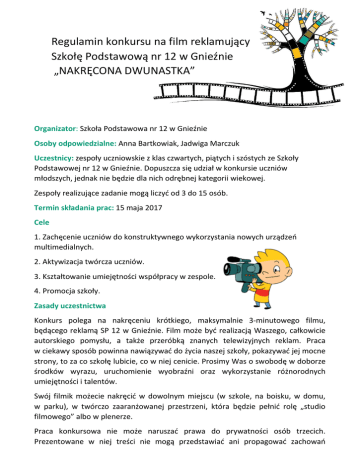 Regulamin konkursu na film reklamujący Szkołę Podstawową nr 12