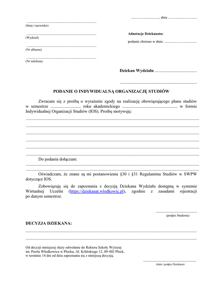 ..............................., dnia ................................ ............................................................................. (Imię i nazwisko) ............................................................................. Adnotacje Dziekanatu: (Wydział) podanie złożono w dniu: .................................... ............................................................................. (Nr albumu) ............................................................................. (Nr telefonu) Dziekan Wydziału ....................................... ....................................................................... PODANIE O INDYWIDUALNĄ ORGANIZACJĘ STUDIÓW Zwracam się z prośbą o wyrażenie zgody na realizację obowiązującego planu studiów w semestrze ............................ roku akademickiego ................................................... w formie Indywidualnej Organizacji Studiów (IOS). Prośbę motywuję: ................................................................................................................................................................ ................................................................................................................................................................ ................................................................................................................................................................ ................................................................................................................................................................ ................................................................................................................................................................ ................................................................................................................................................................ Do podania dołączam: ................................................................................................................................................................ ................................................................................................................................................................ Oświadczam, że znane są mi postanowienia §30 i §31 Regulaminu Studiów w SWPW dotyczące IOS. Zobowiązuję się do zapoznania z decyzją Dziekana Wydziału dostępną w systemie Wirtualnej Uczelni (https://dziekanat.wlodkowic.pl), zgodnie z zasadami rejestracji po danym semestrze. ...................................... (podpis Studenta) DECYZJA DZIEKANA: .............................................................................................................................................................. .............................................................................................................................................................. Od decyzji niniejszej służy odwołanie do Rektora Szkoły Wyższej im. Pawła Włodkowica w Płocku, Al. Kilińskiego 12, 09-402 Płock, w terminie 14 dni od dnia zapoznania się z niniejszą decyzją. ................................................. (data i podpis Dziekana) WYCIĄG Z REGULAMINU STUDIÓW SWPW W PŁOCKU § 30 1. Studia według indywidualnej organizacji studiów (IOS) Dziekan może przyznać na wniosek studenta, który: 1) wyczynowo uprawia sport, 2) jest inwalidą lub przewlekle chorym, 3) sprawuje opiekę nad bliskimi osobami niepełnosprawnymi, 4) samotnie wychowuje dzieci; 5) odbywa równolegle studia na innych kierunkach w Uczelni oraz poza nią, 6) ma inne uzasadnione powody zdrowotne, zawodowe lub losowe. 2. O IOS może ubiegać się student od pierwszego semestru studiów. Zezwolenia na IOS udziela Dziekan na okres jednego semestru lub roku akademickiego. Studentom o znacznym stopniu niepełnosprawności zgoda może być udzielona na cały okres studiów. 3. IOS polega na realizowaniu planu studiów obowiązującego na określonym kierunku z uwzględnieniem ewentualnego zwolnienia z uczestnictwa w zajęciach dydaktycznych oraz uzyskiwania zaliczeń i zdawania egzaminów w terminach ustalonych z prowadzącymi zajęcia. 4. Student ubiegający się o IOS powinien najpóźniej w ciągu 14 dni od rozpoczęcia semestru, przedłożyć Dziekanowi prośbę o zastosowanie tej formy studiowania. W szczególnych, uzasadnionych przypadkach Dziekan może odstąpić od tego terminu. 5. Po uzyskaniu wstępnej akceptacji Dziekana, student zobowiązany jest uzgodnić z prowadzącymi zajęcia terminarz zaliczeń i egzaminów. 6. Przedłożenie Dziekanowi ustalonego terminarza stanowi podstawę do wyrażenia przez niego zgody na IOS. 7. Ostateczny termin zaliczenia semestru studiów dla studentów studiujących według IOS upływa z dniem zakończenia sesji poprawkowej. 8. Studentowi, studiującemu w ramach IOS, przysługują świadczenia pomocy materialnej dla studentów, na warunkach obowiązujących w Uczelni. 9. Studia odbywane według IOS nie mogą prowadzić do skrócenia czasu ich trwania określonego w planie studiów. 10. W przypadku niezrealizowania, bądź nienależytego realizowania przez studenta terminarza zaliczeń, Dziekan cofa zgodę na odbywanie studiów według IOS. Student może również z własnej inicjatywy zrezygnować z IOS. § 31 1. Warunki płatności czesnego w czasie realizacji IPS, w szczególności odpłatności za opracowanie indywidualnego planu studiów i programu kształcenia, uczestniczenie w zajęciach, a także indywidualne zaliczanie przedmiotów i składanie egzaminów objętych IPS ustala Rektor. 2. Warunki płatności czesnego w czasie realizacji IOS nie ulegają zmianie. Załącznik nr ....... ............................................................................. (Imię i nazwisko) ............................................................................. (Wydział) .........................................................