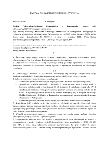 UMOWA NA ŚWIADCZENIE USŁUGI ŻYWIENIA Zawarta w dniu ……………………... w pomiędzy: Gminą Podegrodzie-Gminnym Przedszkolem w Podegrodziu zwanym dalej „ZAMAWIAJĄCYM” reprezentowanym przez mgr Barbarę Bodziony- Dyrektora Gminnego Przedszkola w Podegrodziu działającego na podstawie upoważnienia udzielonego mu Zarządzeniem Nr 298/2012 z dnia 30 marca 2012r. Wójta Gminy oraz Zarządzeniem Nr 399/2012 z dnia 11 września 2012r. Wójta Gminy przy kontrasygnacie: Magdaleny Talar - Głównego Księgowego ROPO a ……………………………………………………………………………………………….. zwanymi dalej łącznie „WYKONAWCĄ” Strony zgodnie postanawiają: §1 1. Świadcząc usługi objęte niniejszą Umową „Wykonawca” wykonuje zobowiązania wobec „Zamawiającego” i w tym zakresie działa na jego rzecz i w jego imieniu. 2. „Wykonawca” oświadcza, że osoby wykonujące usługi posiadają uprawnienia i kwalifikacje zawodowe konieczne do wykonania umowy zgodnie z wymogami określonymi we właściwych przepisach. §2 1. „Zamawiający” powierza, a „Wykonawca” zobowiązuje się świadczyć kompleksowe usługi żywieniowe dla około 75 dzieci dziennie oraz samej herbaty dla 25 dzieci bez wyżywienia. 2. Zakres przedmiotowy usług żywieniowych obejmuje: dostarczenie produktów niezbędnych do przygotowania posiłków własnym transportem, sporządzanie posiłków (śniadanie I, śniadanie II, obiad (zestaw: zupa + drugie danie + kompot), podwieczorek) w konfiguracji III (I śniadanie, II śniadanie, obiad) albo IV (I śniadanie, II śniadanie, obiad, podwieczorek) posiłków dziennie oraz samej herbaty dla 25 dzieci, z wykorzystywaniem pomieszczeń kuchni znajdującej się w budynku Gminnego Żłobka, Przedszkola i Biblioteki w Podegrodziu przeznaczonych na prowadzenie Gminnego Przedszkola w Podegrodziu. wydawanie posiłków dzieciom, mycie naczyń oraz sprzątanie pomieszczeń kuchennych. 3. Szacunkowa ilość posiłków może ulec zmianie w zależności od potrzeb zgłaszanych przez Zamawiającego. Zmiana szacunkowej ilości posiłków nie stanowi zmiany niniejszej umowy i nie wymaga formy pisemnego aneksu. Rzeczywista ilość posiłków każdego dnia uzależniona będzie od ilości dzieci w przedszkolu w danym dniu. 4. Warunki przygotowania, transport i przechowywanie pożywienia muszą spełniać aktualnie obowiązujące przepisy sanitarno – epidemiologiczne. 5. Przygotowanie posiłków musi być zgodne z uwzględnieniem norm określonych w ustawie o bezpieczeństwie żywności i żywienia z dnia 25 sierpnia 2006 r. (tekst jednolity Dz. U z 2010 r. Nr 136 poz. 914, z późn. zm.), zalecanymi normami żywieniowymi dla grup wiekowych dzieci przedszkolnych (wiek 3-6 lat) i spełniać normy określone przez Instytut Żywności i Żywienia Dzieci i Młodzieży. Posiłki muszą być przygotowywane przy bezwzględnym przestrzeganiu zaleceń Państwowego Powiatowego Inspektora Sanitarnego. 6. Wykonawca zobowiązany jest do przygotowania posiłków o najwyższym standardzie, na bazie produktów najwyższej jakości, zgodnie z normami bezpieczeństwa i standardami HACCP. Posiłki muszą spełniać wymogi żywienia zalecane przez Instytut Matki i Dziecka dla dzieci przedszkolnych w wieku 3 – 6 lat. 7. Jadłospis układany będzie przez Wykonawcę na okres 10 dni i dostarczany Zamawiającemu do zatwierdzenia na 3 dni przed okresem jego obowiązywania. Wszelkie zmiany sugerowane przez Zamawiającego są wiążące dla Wykonawcy. 8. Posiłki nie mogą być przygotowywane z półproduktów. 9. Zamawiający ma prawo dokonywania zmian w jadłospisie przedstawionym przez Wykonawcę. 10. Wykonawca zobowiązany jest do zachowania diety bezmlecznej i bezglutenowej oraz innych diet pokarmowych w zależności od indywidualnych potrzeb dzieci, zgodnie z informacją otrzymaną od Zamawiającego, z uwzględnieniem zaleceń lekarskich oraz rodziców. 11.Zamawiający zastrzega sobie prawo wglądu do dokumentów Wykonawcy związanych z wykonywaniem niniejszej umowy w szczególności dotyczących spełniana przez Wykonawcę postanowień wynikających z § 2 ust. 4-6 niniejszej umowy. 12. Zamawiający zobowiązany jest do dostarczania posiłków w ilości i jakości określonej w Ogłoszeniu o zamówieniu, które stanowi Załącznik nr 1 do niniejszej umowy. §3 1. Wykonawca zobowiązuje się do wydania posiłków: śniadania (I i II), obiadu, podwieczorku zgodnie z ustalonym harmonogramem wydawania posiłków, stanowiącym załącznik nr 2 do niniejszej umowy. 2. Posiłki będą wydawane w następujących konfiguracjach: a) III posiłki: I śniadanie, II śniadanie, obiad (zestaw: zupa, drugie danie, kompot); b) IV posiłki: I śniadanie, II śniadanie, obiad (zestaw: zupa, drugie danie, kompot), podwieczorek, c) herbata. §4 1. Wynagrodzenie Wykonawcy za świadczenie usług objętych niniejszą umową wynosi: a) ……….. zł brutto dziennie za cztery posiłki (I śniadanie, II śniadanie, obiad, podwieczorek) dla jednego dziecka b) ……….. zł brutto dziennie za trzy posiłki (I śniadanie, II śniadanie i obiad ) dla jednego dziecka c) ……………. zł brutto dziennie za herbatę dla jednego dziecka z oddziału bez wyżywienia . 2. Rzeczywiste wynagrodzenie uzależnione będzie od ilości faktycznie dostarczonych posiłków w danym miesiącu, z uwzględnieniem cen określonych w ust. 1 powyżej i ustalone będzie na podstawie listy, o której mowa w § 6 ust. 2 niniejszej umowy. §5 1. Ilość posiłków na poszczególne dni ustalana będzie przez Zamawiającego na podstawie zgłoszenia. Zgłoszenie ilości posiłków na dany dzień oraz ewentualnych zmian jest możliwe najpóźniej do godziny 9:00 danego dnia (nie dotyczy śniadań). Śniadania będą dostarczane na bieżąco w ilości odpowiadającej liczbie dzieci przebywających w przedszkolu. Zamawiający będzie przekazywał Wykonawcy powyższe informacje telefonicznie lub osobi
