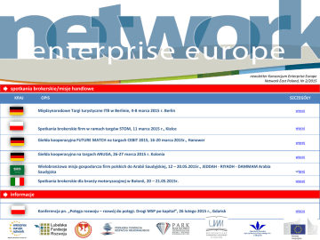 newsletter Konsorcjum Enterprise Europe Network East Poland, Nr 2/2015 spotkania brokerskie/misje handlowe KRAJ OPIS SZCZEGÓŁY Międzynarodowe Targi turystyczne ITB w Berlinie, 4-8 marca 2015 r. Berlin więcej Spotkania brokerskie firm w ramach targów STOM, 11 marca 2015 r., Kielce więcej Giełda kooperacyjna FUTURE MATCH na targach CEBIT 2015, 16-20 marca 2015r., Hanower Giełda kooperacyjna na targach ANUGA, 26-27 marca 2015 r. Kolonia więcej więcej Wielobranżowa misja gospodarcza firm polskich do Arabii Saudyjskiej, 12 – 20.05.2015r., JEDDAH - RIYADH - DAMMAM Arabia Saudyjska więcej Spotkania brokerskie dla branży motoryzacyjnej w Bolonii, 20 – 21.05.2015r. więcej Konferencja pn. „Potęga rozwoju – rozwój do potęgi. Drogi MSP po kapitał”, 26 lutego 2015 r., Gdańsk więcej informacje 11 oferty zagraniczne biznesowe KRAJ OPIS Duńska firma specjalizująca się w energii odnawialnej opracowała nowe rozwiązania energetyczne, gdzie kolektory słoneczne są zintegrowane z dachem. Dla tej produkcji firma potrzebuje dostawcy, który może dostarczyć panele dachowe ze stali. Produkcja musi być dostosowana do duńskiej firmy, gdyż panele słoneczne nie pasują do żadnych standardowych paneli dachowych ze stali. Dostawcy są poszukiwani w Polsce i Czechach. Norweska firma projektująca naczynia kuchenne, poszukuje partnera do produkcji wyrobów kuchennych z bezpiecznych tworzyw sztucznych , tj. POM (polioksymetylen) lub PE (polietylen). Partner powinien posiadać doświadczenie w produkcji wyrobów kuchennych z tworzyw sztucznych takich jak deski do krojenia. NR REF. BRDK20141024001 BRNO20141122002 Norweska firma projektowa poszukuje producenta blatów stołowych wykonanych z bioplastiku, zarówno wielokrotnego użytku jak i jednorazowych. Firma zainteresowana jest produkcją łyżek, widelców i małych talerzy. Japońska firma konsultingowa oferuje swoje usługi przedsiębiorcom zainteresowanym działalnością na rynku japońskim. Firma specjalizuje się w usługach marketingowych, pośrednictwie oraz zarządzaniu własnością intelektualną z zakresu transferu technologii i rozwijania projektów biznesowych. Firma posiada ponad 10 lat doświadczenia na rynkach japońskim, USA i UE. Słoweńska firma działająca w dziedzinie metalowych półfabrykatów szuka firmy zajmującej się produkcją i montażem konstrukcji metalowych, różnymi pracami w warsztatach blacharskich, montażem, konserwacją i eksploatacją urządzeń transportowych oraz robotyką w różnych branżach. Firma potrzebuje niezawodnego podwykonawcy lub partnera biznesowego dla wytworzenia produktów. BRNO20141122001 Hiszpańska firmą zajmująca się importem i dystrybucją szerokiej gamy produktów kosmetycznych z naturalnego 100% Oleju arganowego poszukuje pośredników, dystrybutorów na nowych rynkach. BOES20131126005 BOJP20141208001 BRSI20141118001 2 oferty zagraniczne biznesowe KRAJ OPIS NR REF. Holenderski dystrybutor owoców i warzyw w puszkach i słoikach (korniszony / marynaty, sosy, dania błyskawiczne, włoskie przystawki) poszukuje partnera handlowego (agenta i / lub dystrybutora) w Polsce. BONL20140610002 Czeska firma oferuje profesjonalne usługi w zakresie energetyki elektrycznej jako podwykonawca dla firm z krajów europejskich, szczególnie Rosji, Ukrainy, Słowacji i Polski. BOCZ20130813003 Hiszpańska firma specjalizująca się w dostarczaniu usług doradczych i oprogramowania IT poszukuje firm z Polski i Chile, które mogą być zainteresowane nawiązaniem umowę joint venture. Bułgarski firma architektoniczna jest zainteresowana pracą na rzecz wspólnych pomysłowych i efektywnych rozwiązań. Firma zapewnia kompleksowe usługi architektoniczne z analizy strony do projektowania rozwoju i budowy dokumentów i administracji. .Firma oferuje projektowanie i realizację biur, budynków, sklep-w-sklepów, wyposażenie wnętrza sklepu, magazynu signage i środowisk detalicznych na dużą skalę. Firma chce być podwykonawcą dla takich działań. Brytyjska firma zaangażowana w sprzedaż owoców i warzyw poszukuje dostawców ziemniaków i oferuje usługi dystrybucji dla potencjalnego partnera. Firma poszukuje produktów wysokiej jakości, przeznaczonych do mycia, przechowania i pakowania. Jako firma z ponad dwudziestoletnim doświadczeniem w branży świeżych produktów może pomóc w rozwoju potencjalnych firm poszukujących możliwości dostarczania na rynek brytyjski. Turecka firma specjalizująca się w produkcji elektronicznych systemów blokujących stosowanych w hotelach, oszczędzaniu energii, wygaszaczach ekranu, bezpiecznych dzwonkach, kasach pancernych, kartach zbliżeniowych, systemach kontroli dostępu, zamkach i akcesoriach do szaf, drzwi itp. szuka elektronicznych systemów blokujących, głównie z dystrybutorów z Europy Wschodniej. 20120705005 BO BOBG20140107001 20121003011 BR 20111114027 BR 3 oferty zagraniczne biznesowe KRAJ OPIS Niemiecka firma wykorzystuje stare zegary ze stacji kolejowych do projektowania nowoczesnych urządzeń. Poprawia istniejącą technologię z elementów elektronicznych, tak aby zegary mógł samodzielnie funkcjonować. Nowopowstałe produkty składają się z kwadratowych zegarów ściennych i urządzeń wolnostojących z obustronnym zegarem. Firma poszukuje długoterminowego partnerstwa handlowego lub dostawców, sklepów meblowych i domów aukcyjnych, które mają takie zegary w swojej ofercie. Litewska firma specjalizuje się w produkcji zniczy i świec na zewnątrz. Firma sprzedaje swoje produkty na Litwie i w innych krajach europejskich, w tej chwili poszukuje dostawców różnych materiałów do produkcji świec. NR REF. BRDE20141020001 BRLT20140805001 oferty zagraniczne technologiczne Mała niemiecka firma specjalizująca się w renowacji i konserwacji jezior, gospodarce wodnej, kompletnych usług budowlanych, basenach naturalnych i chlorowanych, opracowała stałą procedurę i urządzenie do określania biologicznego zan
