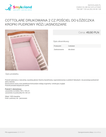SMYKOLAND.PL ŻABNO 53, 88-342 WYLATOWO 784 387 126 lub (52) 56 99 128 COTTOLARE DRUKOWANA 2 CZ.POŚCIEL DO ŁÓŻECZKA KROPKI PUDROWY RÓŻ/JASNOSZARE Cena: 49,90 PLN Opis słownikowy Producent Cottolare Zastosowanie dla dzieci Opis produktu Pościel wykonana z naturalnej, wysokiej jakości tkaniny bawełnianej, wyprodukowanej w polskich fabrykach, nie powoduje podrażnień skóry dziecka. Nowoczesne wzory oraz pastelowa kolorystyka nadają oryginalny i atrakcyjny wygląd. Pościel posiada bezpieczne zamki. Pościel 2- elementowa: -poszewka na kołdrę 100 x 135 cm -poszewka na poduszkę 40 x 60 cm Skład: 100% bawełna Kolor: pudrowy róż - jasnoszare Plik wygenerowano: 02-03-2017 Powered by TCPDF (www.tcpdf.org) Oprogramowanie sklepu: AptusShop