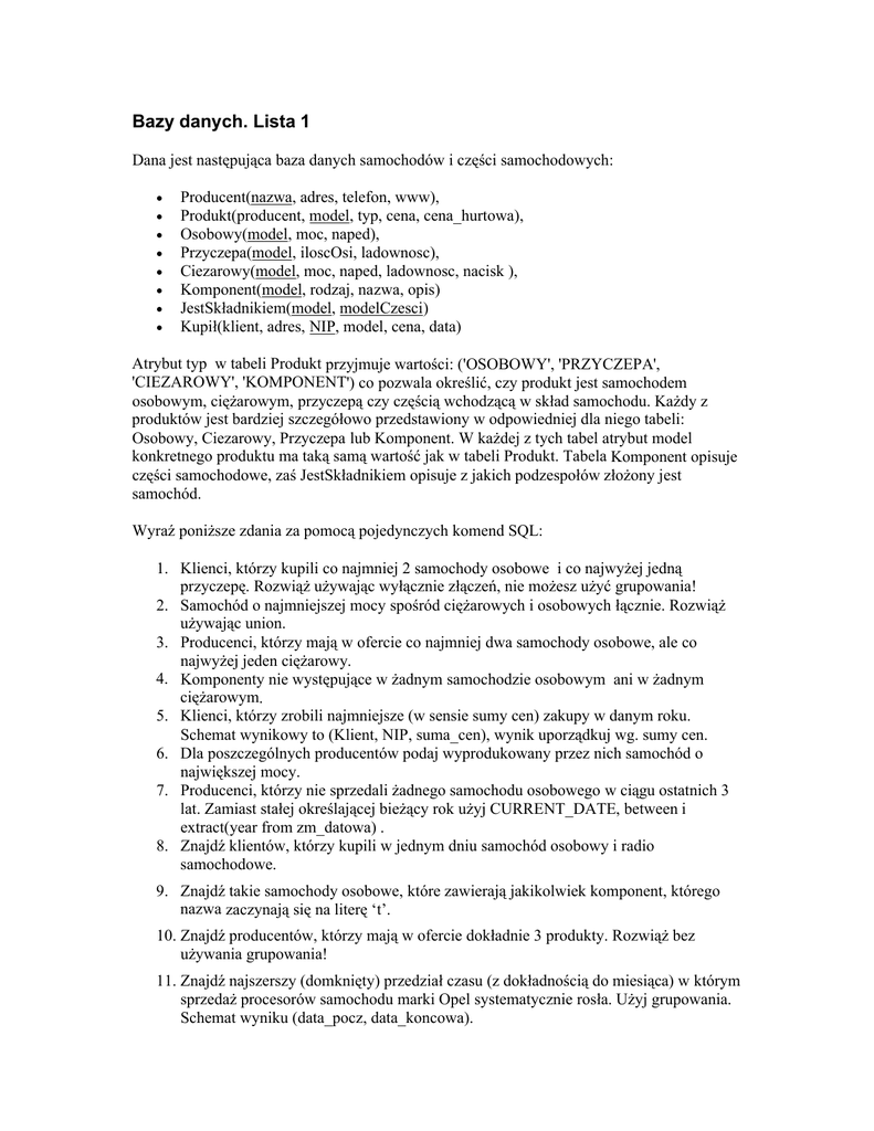 Dana jest następująca baza danych samochodów i części samochodowych: