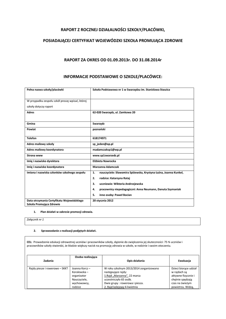 RAPORT Z ROCZNEJ DZIAŁALNOŚCI SZKOŁY/PLACÓWKI, POSIADAJĄCEJ CERTYFIKAT WOJEWÓDZKI SZKOŁA PROMUJĄCA ZDROWIE RAPORT ZA OKRES OD 01.09.2013r. DO 31.08.2014r INFORMACJE PODSTAWOWE O SZKOLE/PLACÓWCE: Pełna nazwa szkoły/placówki Szkoła Podstawowa nr 1 w Swarzędzu im. Stanisława Staszica W przypadku zespołu szkół proszę wpisać, której szkoły dotyczy raport Adres 62-020 Swarzędz, ul. Zamkowa 20 Gmina Swarzędz Powiat poznański Telefon 618174971 Adres mailowy szkoły [email protected] Adres mailowy koordynatora [email protected] Strona www www.sp1swarzedz.pl Imię i nazwisko dyrektora Elżbieta Nawrocka Imię i nazwisko koordynatora Marzanna Adamczak Imiona i nazwiska członków szkolnego zespołu 1. nauczyciele: Sławomira Spiżewska, Krystyna Łaźna, Joanna Kunkel, 2. rodzice: Katarzyna Rataj 3. uczniowie: Wiktoria Andrzejewska 4. pracownicy niepedagogiczni: Anna Neumann, Danuta Szymaniak 5. inne osoby: Paweł Bocian Data otrzymania Certyfikatu Wojewódzkiego Szkoła Promująca Zdrowie 1. 20 stycznia 2012 Plan działań w zakresie promocji zdrowia. Załącznik nr 1 2. Sprawozdanie z realizacji podjętych działań. CEL: Prowadzenie edukacji zdrowotnej uczniów i pracowników szkoły, dążenie do zwiększenia jej skuteczności: 75 % uczniów i pracowników szkoły stwierdzi, że kładzie większy nacisk na promocję zdrowia w szkole, w rodzinie i swoim otoczeniu. Osoba realizująca Zadania Rajdy piesze i rowerowe – SKKT Opis działania Joanna Korcz – Koralewska – organizator Nauczyciele, wychowawcy, rodzice W roku szkolnym 2013/2014 zorganizowano następujące rajdy: 1.Rajd „Marzanna”, 22 marca uczestniczyło 65 osób. Dwie grupy : rowerowa i piesza. 2. Rajd kolejowy 6 kwietnia Ewaluacja Dzieci biorące udział w rajdach są aktywne fizycznie i chętnie spędzają czas na świeżym powietrzu. Widzą, uczestniczyło 27 osób. Grupa rowerowa. 3. XXVI Wojewódzki Rajd „Szukamy wiosny w lesie” - 26 kwietnia uczestniczyło 12 osób. Rajd pieszy. 4. Rowerowa wyprawa na Dziewiczą Górę – 10 maja, uczestniczyło 26 osób. 5. XIX Rajd Patrona w ramach Festynu Rodzinnego – 7 czerwca. Liczba uczestników 200. jak w praktyce można wykorzystać wiedzę zdobytą na lekcjach przyrody i matematyki i historii. Zachęcone podczas wyjazdów same szukają ciekawostek przyrodniczohistorycznych o poznanych obiektach. Wykonują ciekawe prace plastyczne, zainspirowane widzianymi obiektami. Uczniowie biorący udział w konkursach przyrodniczych – Gminnym Konkursie Przyrodniczym, Konkursie wiedzy o Puszczy ”Zielonka” czy Konkursie Ekologicznym wykazują się dużą znajomością tematu i zajmują w nich wysokie lokaty. Zajęcia przyrody w klasach V. Marzanna Adamczak Cykl lekcji na temat odżywiania: - dlaczego człowiek je, - zasady zdrowego odżywiania, - piramida żywienia, - zapobieganie psuciu się żywności. Uczniowie znają zasady zdrowego odżywiania Pierwsza pomoc. Akcja „Ratujemy i uczymy ratować”. Wychowawcy klas I – III, Sławomira Spiżewska, Marzanna Adamczak Dzięki WOŚP nasza szkoła otrzymała fantom „Anię”, na którym dzieci uczyły się resuscytacji krążeniowo - oddechowej osoby nieprzytomnej. Program „Pij mleko”. Wychowawcy klas Od października uczniowie pili mleko białe, czekoladowe lub waniliowe podczas śniadania (z wyjątkiem alergików). Dzieci znają zasady postępowania w przypadku spotkania osoby poszkodowanej. Wszystkie dzieci piją mleko w naszej szkole. Program „Owoce i warzywa”. Wychowawcy klas I-III W ramach programu uczniowie codziennie otrzymywali przygotowane do spożycia warzywa i owoce. Ciepła herbata. Elżbieta Banaszak, pracownicy obsługi Od połowy września do końca czerwca wszystkie dzieci naszej szkoły piły codziennie ciepłą herbatę. Udział w konkursie „Aktywnie po zdrowie”. Krystyna Łaźna W ramach zajęć lekcyjnych omówiono zagadnienia dotyczące tematów: - „Dbam o to, co jem i jak spędzam czas” - „Stawiam na śniadanie” - „Strefa aktywności” – najciekawsze propozycje zabaw na świeżym powietrzu. - „ Cukier? Nie dziękuję!” Dbanie o równowagę psychiczną naszych dzieci. Anna Wietrzykowska, nauczyciele i wychowawcy, przedstawiciele policji. - organizacja spotkań klas I-III ze strażnikiem miejskim przed feriami zimowymi nt. bezpiecznego ich spędzania, - organizacja spotkań klas IV ze strażnikiem miejskim nt. poruszania się rowerzystów po drogach publicznych, Uczniowie klas I – III otrzymują trzy razy w tygodniu warzywa bądź owoce. Dzieci piją ciepłą herbatę w czasie pobytu w szkole. Uczniowie wiedzą jak ważne jest jedzenie śniadania. Pogadanki, które miały miejsce z policjantem odnotowane są w dziennikach lekcyjnych. Współpraca z pielęgniarką szkolną. Danuta Szymaniak – pielęgniarka szkolna Współpraca z lekarzem Dr Hanna Buko - organizacja w klasach III spotkań z policjantem w sprawie sposobów reagowania na zaczepki obcych osób, - organizacja w klasach V spotkań z policjantem na tematy związane z funkcjonowaniem klasy (zajęcia z wychowawcą), - organizacja w klasach VI spotkań z policjantem nt. zagrożeń związanych ze zmianą szkoły, - organizacja w klasach I-III spotkań ze strażnikiem miejskim nt. bezpieczeństwa podczas wakacji letnich, - prowadzenie w klasie III d zajęć – „Rady dla kłótliwych”, - indywidualne rozmowy, podczas których poruszany był temat sposobu odżywiania (szczególnie z rodzicami dzieci nadpobudliwych). Rozmowy indywidualne z uczniami i rodzicami opisane są w zeszycie obserwacji. - Rozmowy indywidualne dotyczące higieny osobistej i problemów związanych z okresem dojrzewania. - Pogadanki na temat urazów głowy, kończyn górnych i dolnych. - „Temat na wakacje” – jak postępować w przypadku ukąszenia przez żmiję zygzakowatą. - Profilaktyka cholesterolowa – „Jedno serce mam, dobrze o nie dbam”. - Pogadanka dotycząca zapobiegania ukąszeniom przez osy, pszczoły i 