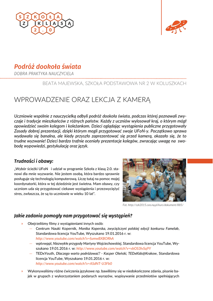 BEATA MAJEWSKA, SZKOŁA PODSTAWOWA NR 2 W KOLUSZKACH WPROWADZENIE ORAZ LEKCJA Z KAMERĄ Uczniowie wspólnie z nauczycielką odbyli podróż dookoła świata, podczas której poznawali zwyczaje i tradycje mieszkańców z różnych państw. Każdy z uczniów wylosował kraj, o którym mógł opowiedzieć swoim kolegom i koleżankom. Dzieci oglądając wystąpienia publiczne przygotowały Zasady dobrej prezentacji, dzięki którym mogli przygotować swoje UFoN-y. Początkowo sprawa wydawała się banalna, ale kiedy przyszło zaprezentować się przed kamerą, okazało się, że to trudne wyzwanie! Dzieci bardzo trafnie oceniały prezentacje kolegów, zwracając uwagę na swobodę wypowiedzi, gestykulację oraz język. „Wybór ścieżki UFoN i udział w programie Szkoła z klasą 2.0. stanowi dla mnie wyzwanie. Nie jestem osobą, która bardzo sprawnie posługuje się technologią komputerową. Liczę tutaj na pomoc mojej koordynatorki, która w tej dziedzinie jest świetna. Mam obawy, czy uczniom uda się przygotować ciekawe wystąpienia i przezwyciężyć stres, zwłaszcza, że są to uczniowie w wieku 10 lat”. Fot. http://szk2015.ceo.nq.pl/kurs/dokument/885/ » Obejrzeliśmy filmy z wystąpieniami innych osób: Centrum Nauki Kopernik, Monika Koperska, zwyciężczyni polskiej edycji konkursu Famelab, Standardowa licencja YouTube, Wyszukano 19.01.2016 r. w: http://www.youtube.com/watch?v=fumwBXBORhA wptvwppl, Niezwykłe przygody Martyny Wojciechowskiej, Standardowa licencja YouTube, Wyszukano 19.01.2016 r. w: http://www.youtube.com/watch?v=vbOS3lvSq9Y TEDxYouth, Dlaczego warto podróżować? - Kacper Oleński, TEDxKids@Krakow, Standardowa licencja YouTube, Wyszukano 19.01.2016 r. w: http://www.youtube.com/watch?v=ASdNT-U3Fb0 » Wykonywaliśmy różne ćwiczenia językowe np. bawiliśmy się w niedokończone zdania, pisanie bajek w grupach z wykorzystaniem podanych wyrazów, wypisywanie przedmiotów spełniających dany warunek np. coś białego i miękkiego, coś białego, miękkiego i słodkiego itp., pisanie zdań, w których kolejne wyrazy zaczynają się od kolejnych liter alfabetu np. k, l, ł, m, n… Beata M., Podróże dookoła świata kl. III B – Zjednoczone Emiraty Arabskie, Standardowa licencja YouTube, Wyszukano 19.01.2016 r. w: https://www.youtube.com/watch?v=la6xU52mWC0&list=PLQ0DlLuFDmNyVQL9Ui1Zi0Vvi2kHA21ey&index=3 Wystąpienia publiczne wydają się bardzo proste, ale wcale takie nie są. Dlatego bardzo ważne jest by nauczyciel pomagał uczniom podczas pracy nad ich wystąpieniami, w razie potrzeby podsuwając im ćwiczenia pomagające opanować stres czy pozbyć się zbyt ekspresyjnej gestykulacji. Więcej informacji o wprowadzeniu do UFoNów i lekcji z kamerą znajdziecie w opisach na platformie programu: http://szk2015.ceo.nq.pl/kurs/dokument/885/ (lekcja wprowadzająca) http://szk2015.ceo.nq.pl/kurs/dokument/2181/ (lekcja z kamerą) WYSTĄPIENIA NA FORUM Ciężka praca nad wystąpieniami przyniosła spektakularny sukces! Do prezentacji dzieci wybrały spośród swojego grona najlepszego mówcę – Dominika. Nauczycielka opowiedziała gościom o ścieżce i przygotowaniach do zadania, a następnie zapowiedziała występ chłopca. Opowieść o Antarktydzie zachwyciła publiczność, która nagrodziła chłopca brawami! Przekonajcie się sami, jak Dominik opanował trudną sztukę oracji. „Do prezentacji wybraliśmy wystąpienie Dominika, który opowiadał o Antarktydzie. Zmieniliśmy w nieznacznym stopniu wstęp tej prezentacji oraz zakończenie, którego niestety w pierwszej prezentacji zabrakło. Dołączyliśmy kilka obrazków, które ułatwiły mu zapamiętanie prezentacji i mógł się w każdej chwili do nich odnieść”. Aby przygotować chłopca do wystąpienia nauczycielka zaproponowała mu kilka ćwiczeń: „Zastosowałam ćwiczenia oddechowe (odmrażanie zamarzniętej szyby, parskanie wargami, dmuchanie wiatraczka, powtarzanie zdań Fot. http://szk2015.ceo.nq.pl/kurs/dokument/2181/ szeptem), ćwiczenia narządów mowy (wysuwanie wąskiego i szerokiego języka, dotykanie czubkiem języka warg, górnych zębów, zlizywanie miodu językiem z talerzyka) oraz ćwiczenia usprawniające obydwie półkule mózgowe i ułatwiające zapamiętywanie (ćwiczenia z Kinezjologii Edukacyjnej, której twórcą jest Paul Denison: Leniwe ósemki, Słoń, pozycja Cook`a) i oddychanie przeponowe, które ma wpływ na korzystne wypowiadanie się na głos”. » » » Odkryliśmy wiele ciekawostek geograficznych, które zaskoczyły nawet naszą nauczycielkę. Odważyliśmy się wystąpić publicznie przed naszymi kolegami. Nasz kolega wystąpił na forum szkoły, jego występ był wielkim sukcesem, za który czujemy się współodpowiedzialni. » » » » stosować ocenę koleżeńską, krytycznie oceniać swoją pracę i uczyć się na błędach, zasad, które rządzą podczas wystąpień publicznych, analizować wystąpienia profesjonalnych mówców i na ich podstawie stworzyliśmy zasady dobrej prezentacji, wyszukiwać i selekcjonować informacje potrzebne do naszych wystąpień. » To zadanie jest wielkim wyzwaniem nie tylko dla uczniów, występującym przed kolegami, ale również sprawdzianem dla nauczyciela: „W UFONIE spodobało mi się to, że dzieci mogą później same obejrzeć swoje wystąpienie i dokonać samooceny. Nie myślałam, że będą aż tak obiektywne. Niektóre chciały powtórzyć swoje wystąpienia, bo dostrzegły swoje błędy. Myślę, że to jest właśnie pozytywne i wzbogaca dzieci o nowe doświadczenia. Natomiast pewną trudnością było nagrywanie, gdyż chciałam, aby było wykonane w sposób profesjonalny. Dzięki tej ścieżce przekonałam się również, że można liczyć na pomoc rodziców. (…) Oglądając filmik z Targów 2.0 mogłam również zobaczyć swoje wystąpienie i wiele się o sobie dowiedzieć. Teraz już wiem nad czym sama muszę jeszcze popracować”. Więcej informacji o wystąpieniach na forum znajdziecie w opi