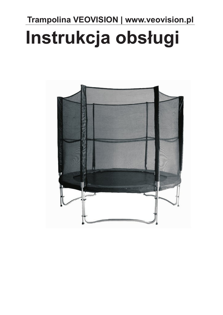 Trampolina VEOVISION | www.veovision.pl Instrukcja obs³ugi WPROWADZENIE Przed rozpoczêciem korzystania z trampoliny, nale¿y dok³adnie przeczytaæ wszystkie informacje dostarczone Pañstwu w tym podrêczniku. Tak jak ka¿dy inny rodzaj aktywnoœci fizycznej ,rekreacji mo¿e spowodowaæ uszczerbek na zdrowiu. Aby zmniejszyæ ryzyko obra¿eñ, nale¿y przestrzegaæ odpowiednich zasad bezpieczeñstwa i wskazówek. Niew³aœciwe stosowanie i nadu¿ywanie tej trampoliny jest niebezpieczne i mo¿e spowodowaæ powa¿ne uszkodzenia cia³a! Zawsze nale¿y sprawdziæ trampolinê przed ka¿dym u¿yciem (poluzowane elementy itp) Ka¿dy, kto zdecyduje siê skorzystaæ z tej trampoliny musi byæ œwiadom w³asnych ograniczeñ w odniesieniu do wykonywania ró¿nych skoków. Ostrze¿enie ! Nie wiêcej ni¿ jedna osoba na raz na TRAMPOLINE! Wiêksza iloœæ osób” zwiêksza ryzyko wyst¹pienia uszczerbku na zdrowiu, takich jak uszkodzenie g³owy, szyi, nóg. Nie nale¿y wykonywaæ salta poniewa¿ zwiêksza to szanse uszkodzenie g³owy lub szyji. Nie próbuj robiæ salta, gdy¿ l¹dowanie na g³owie lub szyi mog¹ spowodowaæ powa¿ne szkody, parali¿ lub œmierci, nawet podczas l¹dowania na œrodku ³ó¿ka. U¿ywaj trampoliny tylko I wy³¹cznie pod nadzorem doros³ych Nie zalecane dla dzieci poni¿ej 6 roku ¿ycia. Nie u¿ywaæ w wietrznych warunkach, lub gdy trampolina jest mokra Przeczytaj instrukcjê przed u¿yciem Zawsze skonsultuj siê z lekarzem przed wykonaniem jakiejkolwiek aktywnoœci fizycznej. Prosimy o zachowanie informacji na przysz³oœæ U¿ytkowanie Nale¿y byæ bardzo ostro¿nym przy wchodzeniu i wychodzeniu na trampoline. U¿ywanie alkoholu lub œrodków odurzaj¹cych: Zabrania siê spo¿ywania alkoholu lub narkotyków przy u¿yciu tej trampoliny! Z³amanie zakazu zwiêksza szanse uszkodzenia cia³a. Pogoda: Pamiêtaj o warunkach pogodowych. Je¿eli trampolina jest mokra, skoczek mo¿e siê poœlizn¹æ i zraniæ. W przypadku silnego wiatru mo¿na bardzo ³atwo straciæ kontrolê nad cia³em. EKSPLOATACJA SprawdŸ trampolinê przed ka¿dym u¿yciem, zast¹p zniszczone, uszkodzone lub brakuj¹ce czêœci nowymi. Minimalny wymagany przeœwit wynosi 24 stopy (7,3 m). Jeœli chodzi o poziomy odstêp, upewnij siê, ¿e nie ma w pobli¿u niebezpiecznych przedmiotów, takich jak drzewa,konary, huœtawki, baseny, instalacje elektryczne , œciany, p³oty, itp. W celu bezpiecznego korzystania z trampoliny, nale¿y pamiêtaæ o odpowiednim wyborze miejsca Upewnij siê, ¿e trampolina jest umieszczona na p³askiej powierzchni Obszar jest dobrze oœwietlony Nie ma ¿adnych przeszkód pod trampolin¹ WYKAZ CZÊŒCI Wybierz swój rozmiar trampoliny Reference Part Number Number Description 8' 10' 12' 13' 14' 15' 1 TX01 Top rail with leg sockets(left) 6 8 8 4 4 12 2 TX02 Leg base 0 0 0 4 4 0 3 TX03 Leg Extensions 0 0 0 4 4 0 4 TX04 Top rail 6 8 8 8 12 5 TX05 Top Rail with Leg Sockets(right) 3 4 4 4 6 6 TX06 Frame pad 7 TX07 Trampoline mat, stitched with V-Rings 8 TX08 9 TX09 1 1 8 4 1 1 1 1 1 1 1 1 1 1 Galvanized springs 48 64 72 80 84 96 Safety Instruction Placard 1 1 1 1 1 1 Pamiêtaj, aby u¿ywaæ rêkawic w celu unikniêcia zranienia d³oni. Trampolinê sk³adaj z co najmniej jedn¹ osob¹. KROK 1 - Rama Proszê wybraæ rurki z opakowania . Wszystkie czêœci z tych samych par # s¹ zamiennie, aby po³¹czyæ czêœci, po prostu przesuñ punkt rurki, który jest mniejszy na jednym koñcu w pobli¿u sekcji do wiêkszego otwarcia. Te po³¹czenia s¹ nazywane "punktami z³¹czeñ" krok 2 - Monta¿ STEP 3-Top Rail Assembly STEP 4 - Trampoline Mat Assembly When Attaching springs to the trampoli A. Lay out the Trampoline Mat (1) inside Do³¹cz ramkê poduszki bezpiecznie do ramy we w³aœciwej pozycji przed u¿yciem trampoliny. Instrukcja instalacji: krok 1 Skorzystaj z klipsów, aby móc po³¹czyæ rurki z nog¹ trampoliny tak blisko ziemi jak to tylko mo¿liwe. krok 2 W³ó¿ niebiesk¹ piankê do czarnego pokrowca. STEP 3 Po zakoñczeniu kroku 2 w³ó¿ górê rurki (rurka z pianki) na dolne. Proszê zobaczyæ zdjêcie . krok4 Widok dna trampoliny. Pamietaj ¿e wszystkie zaczepy musz¹ byæ sprawdzone.