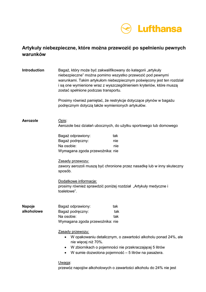 Artykuły niebezpieczne, które można przewozić po spełnieniu pewnych warunków Introduction Bagaż, który może być zakwalifikowany do kategorii „artykuły niebezpieczne” można pomimo wszystko przewozić pod pewnymi warunkami. Takim artykułom niebezpiecznym poświęcony jest ten rozdział i są one wymienione wraz z wyszczególnieniem kryteriów, które muszą zostać spełnione podczas transportu. Prosimy również pamiętać, że restrykcje dotyczące płynów w bagażu podręcznym dotyczą także wymienionych artykułów. Aerozole Opis: Aerozole bez działań ubocznych, do użytku sportowego lub domowego Bagaż odprawiony: tak Bagaż podręczny: nie Na osobie: nie Wymagana zgoda przewoźnika: nie Zasady przewozu: zawory aerozoli muszą być chronione przez nasadkę lub w inny skuteczny sposób. Dodatkowe informacje: prosimy również sprawdzić poniżej rozdział „Artykuły medyczne i toaletowe”. Napoje alkoholowe Bagaż odprawiony: tak Bagaż podręczny: tak Na osobie: tak Wymagana zgoda przewoźnika: nie Zasady przewozu: W opakowaniu detalicznym, o zawartości alkoholu ponad 24%, ale nie więcej niż 70%. W zbiornikach o pojemności nie przekraczającej 5 litrów W sumie dozwolona pojemność – 5 litrów na pasażera. Uwaga: przewóz napojów alkoholowych o zawartości alkoholu do 24% nie jest limitowany, dotyczy to między innymi małych beczułek piwa, ponieważ nie są one zamykane pod ciśnieniem. Zasada ta nie dotyczy beczułek zamykanych pod ciśnieniem lub butelek z dwutlenkiem węgla lub podobnym gazem wykorzystywanym w gastronomii. Amunicja (naboje) Opis: Zabezpieczona w kasecie amunicja (naboje) dla celów sportowych rodzaju 1.4S. Bagaż odprawiony: tak Bagaż podręczny: nie Na osobie: nie Wymagana zgoda przewoźnika: tak Zasady przewozu: Broń i amunicja muszą być zapakowane w oddzielnych bagażach. Jeśli jest to konieczne, należy użyć specjalnego pudełka bagażowego, aby rozdzielić broń od amunicji. Broń nie może być naładowana. Amunicja przewożona samolotem pasażerskim musi być przeznaczona wyłącznie do użytku osobistego tylko w celach sportowych lub/i myśliwskich. Wyłącznie amunicja sklasyfikowana jako 1.4S, UN0012 lub UN0014 może zostać zaakceptowana. Amunicja maksymalnie w ilości do 5 kg (11lb) brutto na jednego pasażera (musi zostać zważona) jest traktowana jako amunicja do użytku osobistego. Amunicja musi być bezpiecznie zamknięta w pudełku np. w opakowaniu handlowym. Niedozwolonw: Amunicja w postaci pocisków wybuchowych lub zapalających. Przewóz prochu nie jest dozwolony. Lawinowe plecaki ratownicze Opis: Wyposażony w pirotechniczny mechanizm zapalający zawierający mniej niż 200 mg netto materiałów wybuchowych klasy 1.4S. Bagaż odprawiony: tak Bagaż podręczny: tak Na osobie: nie Wymagana zgoda przewoźnika: tak Zasady przewozu: Dozwolony jest tylko jeden plecak na pasażera. Plecaka lawinowego nie można przewozić na osobie. Plecak musi być zapakowany w sposób uniemożliwiający przypadkowe uruchomienie. 1/13 Barometry Poduszka powietrzna znajdująca się w plecaku musi być wyposażona w zawory bezpieczeństwa. Pojemnik z gazem będzie zaakceptowany tylko jeśli jest on zintegrowany z plecakiem. Zapasowe pojemniki lub pojemniki wyjęte z plecaka nie zostaną dopuszczone do przewozu. Dodatkowe uchwyty aktywacyjne zawierające naboje są dozwolone. Zapasowe naboje do uchwytów nie są dozwolone. Przewóz lawinowych plecaków ratowniczych jest całkowicie zakazany na rejsach do/z/przez USA. Opis: Barometry zawierające rtęć. Bagaż odprawiony: nie Bagaż podręczny: tak Na osobie: nie Wymagana zgoda przewoźnika: tak Zasady przewozu: Barometr rtęciowy może być przewożony jedynie przez przedstawiciela rządowego centrum meteorologicznego lub podobnej agencji. Barometr musi być zapakowany w mocne opakowanie zewnętrzne posiadające uszczelnioną wkładkę wewnętrzną lub szczelną, odporną na przebicie torbę nieprzepuszczającą rtęci. Opakowanie musi zapobiegać przedostaniu się rtęci poza opakowanie, niezależnie od położenia barometru. Akumulatory hermetyczne (suche, żelowe) Opis: Akumulatory do wózków inwalidzkich lub innych urządzeń ułatwiających poruszanie się, zasilanych przez bezobsługowe akumulatory żelowe. Bagaż odprawiony: tak Bagaż podręczny: nie Na osobie: nie Wymagana zgoda przewoźnika: tak Zasady przewozu: Akumulator musi być bezpiecznie wmontowany w wózek inwalidzki lub urządzenie ułatwiające poruszanie się. Zaciski akumulatora muszą być zabezpieczone przed zwarciem np. poprzez zamknięcie ich w pojemniku akumulatora. Akumulatory zaprojektowane do wyjmowania (np. w składanych urządzeniach): - Użytkownik musi wyjąć akumulator. - Akumulator musi być zabezpieczony przed zwarciem poprzez zaizolowanie zacisków (np. poprzez owinięcie taśmą wystających części). 2/13 - Akumulatory, bezobsługowe, litowo-jonowe Wyjęty akumulator musi być odpowiednio zapakowany do przewozu i będzie transportowany w luku bagażowym. Opis: Akumulatory do wózków inwalidzkich lub innych urządzeń ułatwiających poruszanie się, zasilanych przez hermetyczne akumulatory litowo-jonowe. Bagaż odprawiony: Bagaż podręczny: tak nie, za wyjątkiem wyjmowanego akumulatora Na osobie: nie Wymagana zgoda przewoźnika: tak Zasady przewozu: Akumulator musi być bezpiecznie wmontowany w wózek inwalidzki lub urządzenie ułatwiające poruszanie się. Zaciski akumulatora muszą być zabezpieczone przed zwarciem np. poprzez zamknięcie ich w pojemniku akumulatora. Akumulator musi spełniać wymogi określone w „UN Manual of tests and Criteria”, część III, sekcja 38.3. Dowód zgodności z określonymi wymogami musi być przedstawiony podczas rezerwacji lub podczas odprawy. Może być to np. zaświadczenie wystawione przez producenta lub pisemne oświadczenie. Akumulatory zaprojektowane do wyjmowania (np. w składanych urządzeniach): - Użytkownik musi wyjąć akumulato