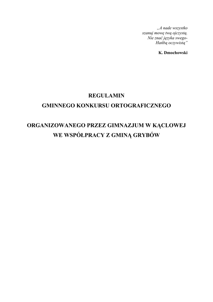 „A nade wszystko szanuj mowę twą ojczystą. Nie znać języka swegoHańbą oczywistą” K. Dmochowski REGULAMIN GMINNEGO KONKURSU ORTOGRAFICZNEGO ORGANIZOWANEGO PRZEZ GIMNAZJUM W KĄCLOWEJ WE WSPÓŁPRACY Z GMINĄ GRYBÓW § 1. Cele konkursu 1. Podstawowymi celami Gminnego Konkursu Ortograficznego, zwanego w dalszej części konkursem, są, w szczególności: 1) podnoszenie umiejętności ortograficznych młodzieży; 2) kształcenie umiejętności poprawnego pisania; 3) sprawdzenie znajomości zasad polskiej ortografii i interpunkcji; 4) praktyczne wykorzystanie zdobytych wiadomości i sprawności w pracy z tekstem; 5) budzenie zamiłowania ortografią; 6) motywowanie młodzieży do pogłębiania wiedzy z zakresu polskiej ortografii i interpunkcji. 7) Promowanie osiągnięć uczniów i ich nauczycieli. § 2. Ustalenia ogólne 1. Organizatorem konkursu jest Gimnazjum w Kąclowej, zwane w dalszej części szkołą, we współpracy z Gminą Grybów. 2. Konkurs przeznaczony jest dla uczniów gimnazjów dla których organem prowadzącym jest Gmina Grybów. 3. Gmina Grybów w porozumieniu z Gimnazjum w Kąclowej mogą zaprosić do wzięcia udziału w konkursie inne gimnazja, niewymienione w ust. 2. 4. Konkurs będzie miał formę dyktanda, które przygotuje konsultant MCDN w Nowym Sączu. 5. Treść dyktanda sprawdzi znajomość zasad polskiej ortografii i interpunkcji. 1. Udział uczniów w konkursie jest dobrowolny. W etapie szkolnym konkursu mogą brać udział wszyscy uczniowie zainteresowani konkursem. 2. Gimnazja zgłaszają swój udział w konkursie poprzez przesłanie do sekretariatu szkoły w formie elektronicznej protokołu z przebiegu etapu szkolnego konkursu. 2 3. Każdy uczestnik konkursu otrzyma dyplom, a laureat i zwycięzcy nagrody ufundowane przez Wójta Gminy Grybów wręczone podczas dorocznego spotkania Wójta Gminy Grybów z finalistami i laureatami konkursów gminnych i przedmiotowych. § 3. Przebieg konkursu 1. Konkurs jest dwuetapowy. Szczegółowy harmonogram przebiegu konkursu określa załącznik nr 1 do niniejszego Regulaminu. 2. Eliminacje konkursowe na wszystkich etapach będą przeprowadzane w formie pisemnej. 3. W etapie gminnym konkursu może wziąć udział co najwyżej 3 uczestników konkursu, którzy uzyskali najwyższą liczbę punktów w etapie szkolnym. 4. Tytuł laureata konkursu otrzymuje 1 uczestnik konkursu, którzy uzyskał najwyższą liczbę punktów w etapie gminnym, a także ci uczestnicy, którzy zdobyli identyczną liczbę punktów, jaką uzyskał laureat. § 4. Organizacja etapu szkolnego konkursu Organizacja etapu szkolnego konkursu i nadzór nad jego przebiegiem spoczywa na dyrektorze gimnazjum, który: 1) powołuje szkolną komisję konkursową, w skład której wchodzi co najmniej dwóch nauczycieli; 2) uzyskuje zgodę rodziców (prawnych opiekunów) uczniów biorących udział w konkursie na przetwarzanie do celów konkursu danych osobowych uczniów oraz uzyskuje ich potwierdzenie, że zapoznali się z regulaminem i akceptują jego postanowienia, zgodnie z wzorem, stanowiącym załącznik nr 2 do niniejszego Regulaminu; 3) w dniu etapu szkolnego odbiera arkusz z zadaniami wraz z protokołem przebiegu konkursu przesłany do sekretariatu gimnazjum w wersji elektronicznej oraz 3 przekazuje przewodniczącemu szkolnej komisji konkursowej arkusz z zadaniami w formie wydruku. 4) organizuje etap szkolny konkursu; 5) umożliwia wgląd do ocenionych prac uczestnikom, ich rodzicom (prawnym opiekunom) i opiekunom naukowym; 6) przyjmuje zastrzeżenia po etapie szkolnym konkursu; 7) przesyła na adres e-mail Gimnazjum w Kąclowej ([email protected]) wersję elektroniczną protokołu, zgodnie z wzorem protokołu, stanowiącym załącznik nr 3 do niniejszego Regulaminu, 8) przestrzega, określonych w harmonogramie konkursu, terminów przekazywania protokołów. Przekroczenie terminu (decyduje data wysłania protokołu elektronicznego) skutkuje wykluczeniem z dalszego udziału w konkursie. 9) prowadzi dokumentację konkursu, 10) zabezpiecza i przechowuje prace uczniów do zakończenia roku szkolnego. § 5. Organizacja etapu gminnego konkursu 1. Za prawidłowy przebieg konkursu odpowiada Przewodniczący Gminnej Komisji Konkursowej. 2. Do zadań gminnej komisji konkursowej należy: 1) wyłonienie laureata i dwóch zwycięzców konkursu; 2) uroczyste podsumowanie konkursu. 3. Do zadań przewodniczącego gminnej komisji konkursowej należy: 1) odebranie od Dyrektora Gimnazjum w Kąclowej arkuszy z zadaniami etapu gminnego; 2) przeprowadzenie etapu gminnego konkursu w warunkach zapewniających samodzielną pracę uczestników; 3) rozpatrywanie zastrzeżeń po etapie szkolnym; 4) przekazanie Dyrektorowi Gimnazjum w Kąclowej protokołu pisemnego z przebiegu konkursu Gminnego, w formie wydruku, zgodnie z wzorem stanowiącym załącznik nr 4 do niniejszego Regulaminu; 4 5) umożliwienie wglądu do prac uczniom, ich rodzicom (prawnym opiekunom) i opiekunom naukowym w ustalonym miejscu i terminie, podanym uczestnikom w dniu etapu gminnego zgodnie z harmonogramem konkursu. 4. Do zadań Dyrektora Gimnazjum w Kąclowej należy: 1) weryfikacja przesłanych z poszczególnych szkół protokołów w wersji elektronicznej i ogłoszenie listy uczniów zakwalifikowanych do etapu gminnego, poprzez przesyłanie listy zakwalifikowanych w wersji elektronicznej, stanowiącej załącznik nr 5 do niniejszego Regulaminu, do poszczególnych gimnazjów; 2) koordynowanie prac związanych z organizacją i przeprowadzeniem gminnego etapu konkursu; 3) przyjmowanie zastrzeżeń po etapie gminnym; 4) ogłoszenie listy zwycięzców gminnego etapu konkursu, poprzez przesyłanie listy w wersji elektronicznej, stanowiącej załącznik nr 6 do niniejszego Regulaminu, do poszczególnych gimnazjów; 5) przygotowanie zaświadczeń dla laureata i zwycięzców według wzorów stanowiących załączniki nr 7 do niniejszego Regulaminu oraz dyplomów dla wszystkich uczestników konkursu; 6) przygot