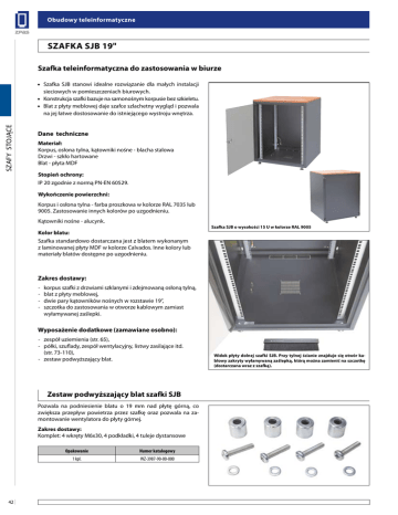 Obudowy teleinformatyczne SZAFKA SJB 19" Szafka teleinformatyczna do zastosowania w biurze SZAFY STOJĄCE • Szafka SJB stanowi idealne rozwiązanie dla małych instalacji sieciowych w pomieszczeniach biurowych. • Konstrukcja szafki bazuje na samonośnym korpusie bez szkieletu. • Blat z płyty meblowej daje szafce szlachetny wygląd i pozwala na jej łatwe dostosowanie do istniejącego wystroju wnętrza. Dane techniczne Materiał: Korpus, osłona tylna, kątowniki nośne - blacha stalowa Drzwi - szkło hartowane Blat - płyta MDF Stopień ochrony: IP 20 zgodnie z normą PN-EN 60529. Wykończenie powierzchni: Korpus i osłona tylna - farba proszkowa w kolorze RAL 7035 lub 9005. Zastosowanie innych kolorów po uzgodnieniu. Kątowniki nośne - alucynk. Szafka SJB o wysokości 15 U w kolorze RAL 9005 Kolor blatu: Szafka standardowo dostarczana jest z blatem wykonanym z laminowanej płyty MDF w kolorze Calvados. Inne kolory lub materiały blatów dostępne po uzgodnieniu. Zakres dostawy: - - - - korpus szafki z drzwiami szklanymi i zdejmowaną osłoną tylną, blat z płyty meblowej, dwie pary kątowników nośnych w rozstawie 19”, szczotka do zastosowania w otworze kablowym zamiast wyłamywanej zaślepki. Wyposażenie dodatkowe (zamawiane osobno): - zespół uziemienia (str. 65), - półki, szuflady, zespół wentylacyjny, listwy zasilające itd. (str. 73-110), - zestaw podwyższający blat. Zestaw podwyższający blat szafki SJB Pozwala na podniesienie blatu o 19 mm nad płytę górną, co zwiększa przepływ powietrza przez szafkę oraz pozwala na zamontowanie wentylatora do płyty górnej. Zakres dostawy: Komplet: 4 wkręty M6x30, 4 podkładki, 4 tuleje dystansowe 42 Opakowanie Numer katalogowy 1 kpl. WZ-3987-90-00-000 Widok płyty dolnej szafki SJB. Przy tylnej ścianie znajduje się otwór kablowy zakryty wyłamywaną zaślepką, którą można zamienić na szczotkę (dostarczana wraz z szafką). Obudowy teleinformatyczne SZAFKA SJB 19" (Szafka z podwyższonym blatem) 19 4 18 Przekrój B-B Przekrój C-C 8 H 9 25÷50 1 7 Widok z przodu B Przekrój B-B 4 18 2 SZAFY STOJĄCE 5 1 5 C A A Przekrój A-A 25÷50 B L = 600 H C HU 3 max 560 (głębokość użytkowa) 7 G = 600 6 10 BUDOWA 1. Korpus szafki 2. Drzwi szklane 3. Osłona tylna 4. Blat 5. Kątownik nośny 6. Wyłamywana zaślepka 7. Stopka Elementy wyposażenia dodatkowego: 8. Tuleja dystansowa podwyższająca dach (str. 42) 9. Wentylator (str. 65) 10. Listwa uziemienia (str. 65) 5 465 Tabela wykonań Szerokość całkowita L [mm] 600 Głębokość całkowita G [mm] Wysokość korpusu H [mm] Wysokość użytkowa HU [U = 44,45 mm] 600 871 737 604 515 18 U 15 U 12 U 10 U Dopuszczalne obciążenie szafki [kg] 45 38 30 30 Numer katalogowy szafki w kolorze RAL 7035 w kolorze RAL 9005 WZ-3987-01-04-011 WZ-3987-01-03-011 WZ-3987-01-02-011 WZ-3987-01-01-011 WZ-3987-01-04-161 WZ-3987-01-03-161 WZ-3987-01-02-161 WZ-3987-01-01-161 43
