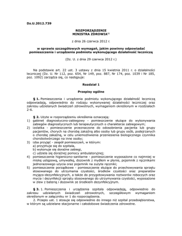 Dz.U.2012.739 ROZPORZĄDZENIE MINISTRA ZDROWIA1) z dnia 26 czerwca 2012 r. w sprawie szczegółowych wymagań, jakim powinny odpowiadać pomieszczenia i urządzenia podmiotu wykonującego działalność leczniczą (Dz. U. z dnia 29 czerwca 2012 r.) Na podstawie art. 22 ust. 3 ustawy z dnia 15 kwietnia 2011 r. o działalności leczniczej (Dz. U. Nr 112, poz. 654, Nr 149, poz. 887, Nr 174, poz. 1039 i Nr 185, poz. 1092) zarządza się, co następuje: Rozdział 1 Przepisy ogólne § 1. Pomieszczenia i urządzenia podmiotu wykonującego działalność leczniczą odpowiadają, odpowiednio do rodzaju wykonywanej działalności leczniczej oraz zakresu udzielanych świadczeń zdrowotnych, wymaganiom określonym w rozdziałach 2-6. § 2. Użyte w rozporządzeniu określenia oznaczają: 1) gabinet diagnostyczno-zabiegowy - pomieszczenie służące do wykonywania zabiegów diagnostycznych lub terapeutycznych o charakterze zabiegowym; 2) izolatka - pomieszczenie przeznaczone do odosobnienia pacjenta lub grupy pacjentów, chorych na chorobę zakaźną albo osoby lub grupy osób, podejrzanych o chorobę zakaźną, w celu uniemożliwienia przeniesienia biologicznego czynnika chorobotwórczego na inne osoby; 3) izba przyjęć - zespół pomieszczeń, w którym: a) przyjmuje się do szpitala, b) wykonuje się doraźne zabiegi, c) udziela się doraźnej pomocy ambulatoryjnej; 4) pomieszczenie higieniczno-sanitarne - pomieszczenie wyposażone co najmniej w miskę ustępową, umywalkę, dozownik z mydłem w płynie, pojemnik z ręcznikami jednorazowego użycia oraz pojemnik na zużyte ręczniki; 5) pomieszczenie porządkowe - pomieszczenie służące do przechowywania sprzętu stosowanego do utrzymania czystości, środków czystości oraz preparatów myjąco-dezynfekcyjnych, a także do przygotowywania roztworów roboczych oraz mycia i dezynfekcji sprzętu stosowanego do utrzymywania czystości, wyposażone w zlew z baterią i dozownik ze środkiem dezynfekcyjnym. § 3. 1. Pomieszczenia i urządzenia szpitala odpowiadają, odpowiednio do zakresu udzielanych świadczeń zdrowotnych, szczegółowym wymaganiom określonym w załączniku nr 1 do rozporządzenia. 2. Przepis ust. 1 stosuje się odpowiednio do innego niż szpital przedsiębiorstwa, w którym są udzielane stacjonarne i całodobowe świadczenia zdrowotne. 3. Wymagania określone dla oddziału stosuje się także do jednostki organizacyjnej szpitala stanowiącej wyodrębnioną część struktury bezoddziałowej, w której są udzielane świadczenia zdrowotne o jednolitym profilu. 4. Szpitalny oddział ratunkowy, o którym mowa w art. 3 pkt 9 ustawy z dnia 8 września 2006 r. o Państwowym Ratownictwie Medycznym (Dz. U. Nr 191, poz. 1410, z późn. zm.2)), w zakresie nieuregulowanym w przepisach wydanych na podstawie art. 34 tej ustawy, spełnia także wymagania określone w ust. 1. § 4. 1. Pomieszczenia i urządzenia ambulatorium odpowiadają, odpowiednio do zakresu udzielanych świadczeń zdrowotnych, szczegółowym wymaganiom określonym w załączniku nr 2 do rozporządzenia. 2. Pomieszczenia i urządzenia medycznego laboratorium diagnostycznego i zakładu badań diagnostycznych odpowiadają wymaganiom określonym w przepisach wydanych na podstawie art. 17 ust. 3 ustawy z dnia 27 lipca 2001 r. o diagnostyce laboratoryjnej (Dz. U. z 2004 r. Nr 144, poz. 1529, z późn. zm.3)). § 5. Pomieszczenia i urządzenia szpitala, który udziela wyłącznie świadczeń zdrowotnych z zamiarem zakończenia ich udzielania w okresie nieprzekraczającym 24 godzin, zwanego dalej "szpitalem jednodniowym", odpowiadają, odpowiednio do zakresu udzielanych świadczeń zdrowotnych, wymaganiom określonym w § 14 i § 16-39 oraz szczegółowym wymaganiom określonym w załączniku nr 3 do rozporządzenia. § 6. Pomieszczenia i urządzenia centrum krwiodawstwa i krwiolecznictwa, zwanego dalej "centrum", odpowiadają, odpowiednio do zakresu udzielanych świadczeń zdrowotnych, szczegółowym wymaganiom określonym w załączniku nr 4 do rozporządzenia. § 7. Pomieszczenia i urządzenia pracowni badań endoskopowych odpowiadają, odpowiednio do zakresu udzielanych świadczeń zdrowotnych, szczegółowym wymaganiom określonym w załączniku nr 5 do rozporządzenia. § 8. Pomieszczenia i urządzenia zakładu rehabilitacji leczniczej odpowiadają, odpowiednio do zakresu udzielanych świadczeń zdrowotnych, szczegółowym wymaganiom określonym w załączniku nr 6 do rozporządzenia. § 9. Pomieszczenia i urządzenia stacji dializ odpowiadają, odpowiednio do zakresu udzielanych świadczeń zdrowotnych, szczegółowym wymaganiom określonym w załączniku nr 7 do rozporządzenia. § 10. 1. Do pomieszczeń przedsiębiorstwa podmiotu leczniczego będącego dysponentem zespołów ratownictwa medycznego, w tym lotniczych, działającego na podstawie ustawy z dnia 8 września 2006 r. o Państwowym Ratownictwie Medycznym, stosuje się wyłącznie wymagania określone w § 14 i § 25 ust. 1 pkt 3. 2. W miejscu stacjonowania zespołu ratownictwa medycznego znajduje się pomieszczenie higieniczno-sanitarne, wyposażone dodatkowo w natrysk. § 11. Do gabinetu profilaktyki zdrowotnej i pomocy przedlekarskiej w szkole, działającego w strukturze podmiotu wykonującego działalność leczniczą, stosuje się wyłącznie wymagania określone w § 27, § 29 oraz § 36. § 12. Do gabinetu dentystycznego w szkole, działającego w strukturze podmiotu wykonującego działalność leczniczą, stosuje się wyłącznie wymagania określone w § 16, § 27, § 29 i § 36. § 13. 1. Do przedsiębiorstwa podmiotu leczniczego realizującego wyłącznie zadania określone w ustawie z dnia 29 lipca 2005 r. o przeciwdziałaniu narkomanii (Dz. U. z 2012 r. poz. 124) oraz zakładu lecznictwa odwykowego, z wyłączeniem oddziału leczenia alkoholowych zespołów abstynencyjnych, nie stosuje się wymagań określonych w § 18-20, § 26-29, § 40 i § 41. 2. Pomieszczenia i urządzenia zakładów lecznict